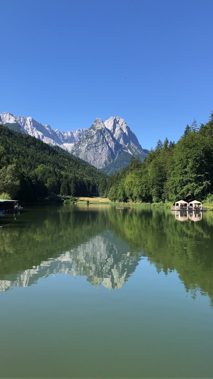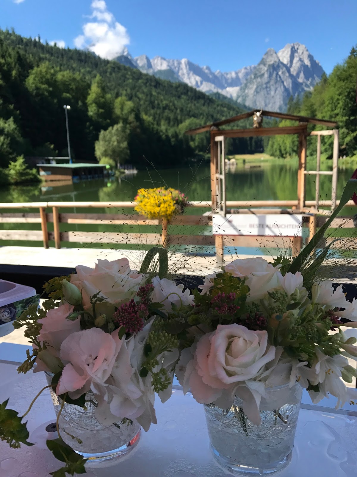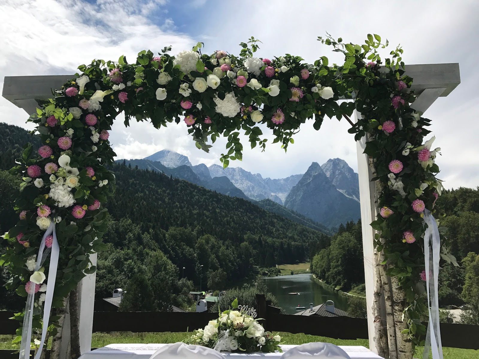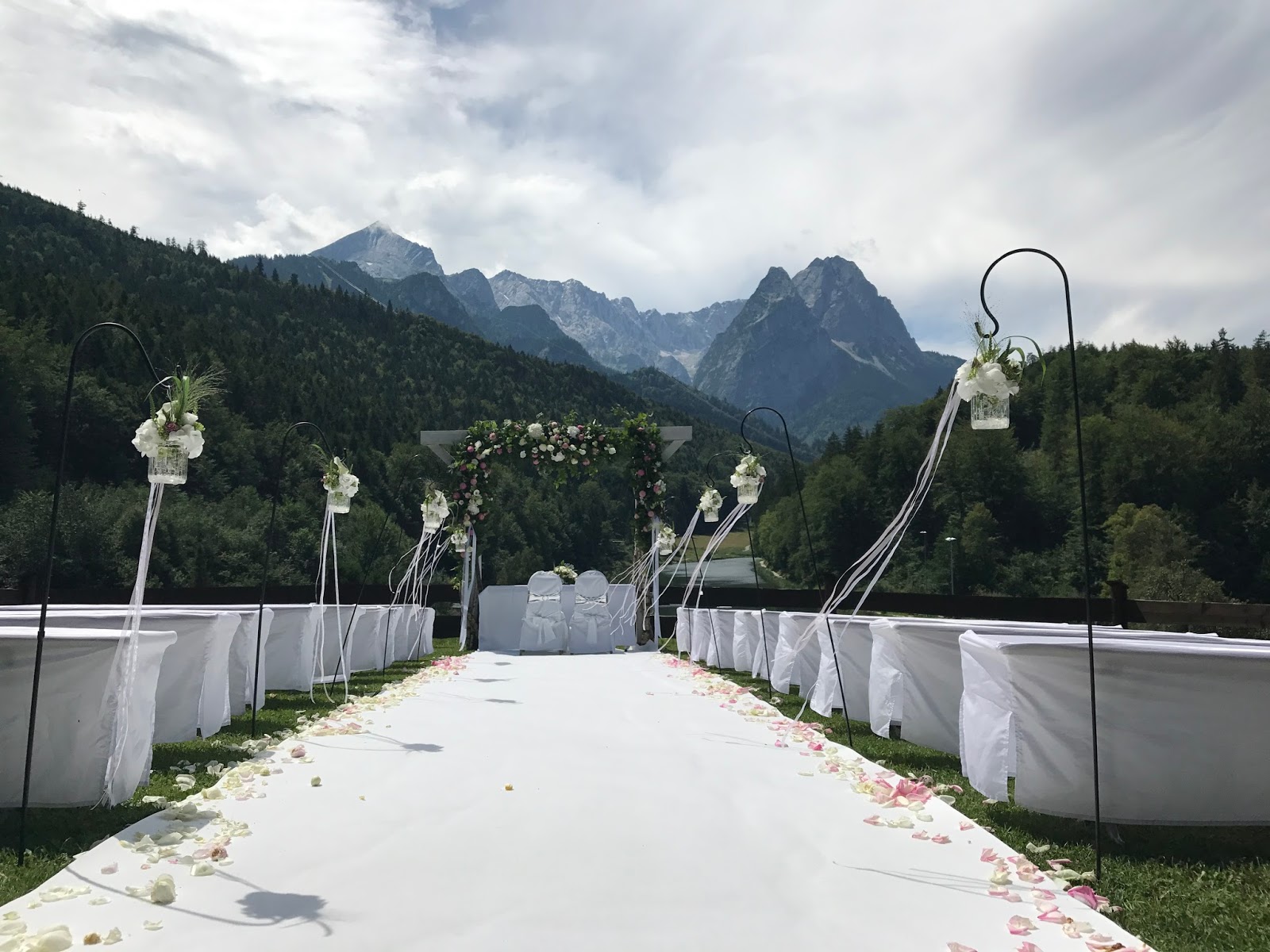 Die Trauung fand dann auf der Panorama-Wiese über dem Seehaus statt mit einem Set-up, von dem „Froonk“ schon vor einem Jahr meinte „so muss eine Traumhochzeit aussehen, so stelle ich mir das vor“. Ein breiter weißer Teppich führte zum Altar, an dessen Seiten Rosenblätter gestreut waren und an den Gartensteckern hingen Blumen-gefüllte Gläser mit Bändern, die im warmem Sommerwind wehten. Über dem üppig geschmückten Torbogen grüßte majestätisch das Wettersteingebirge über dem spiegelglatten Riessersee – einfach traumhaft. Entgegen der Dekoration vor einem Jahr waren aber den Farben Grün, Weiß und Silber noch einige Akzente von zartem Rosa hinzugefügt worden