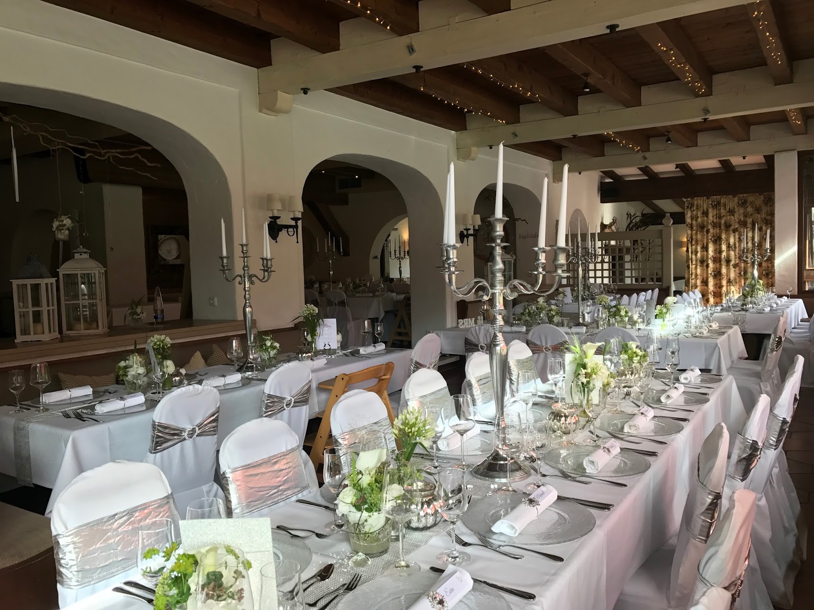 Tischwäsche und Stuhlhussen erstrahlten in frischem Weiß, große Silberleuchter bildeten den Mittelpunkt der Tafeln und für dem Glamour-Effekt sorgten Strasstischbänder, silberne Stuhlbänder und glitzernde Serviettenringe, ein zusätzliches Funkeln kam von den Fairy Lights an der Decke, die erst später bei Einbruch der Dunkelheit noch eindrucksvoll zur Geltung kamen.