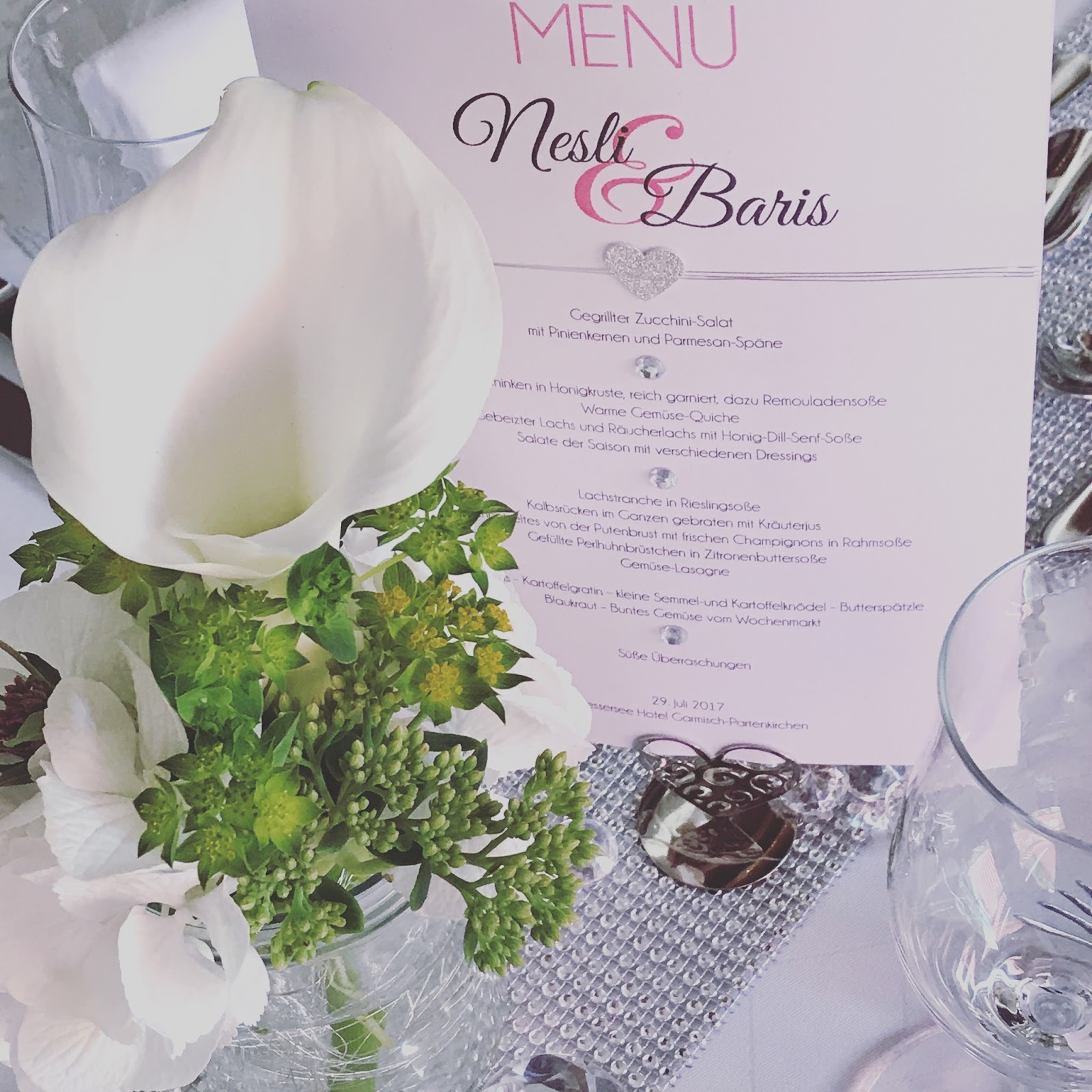 Die Menükarten hatte Grafikerin Miriam mit Azubi Nina in liebevoller Detailarbeit erstellt und mit Silberdraht und kleinen Glitzersteinen verziert, auf der Rückseite waren sie mit Glitterfolie beklebt.