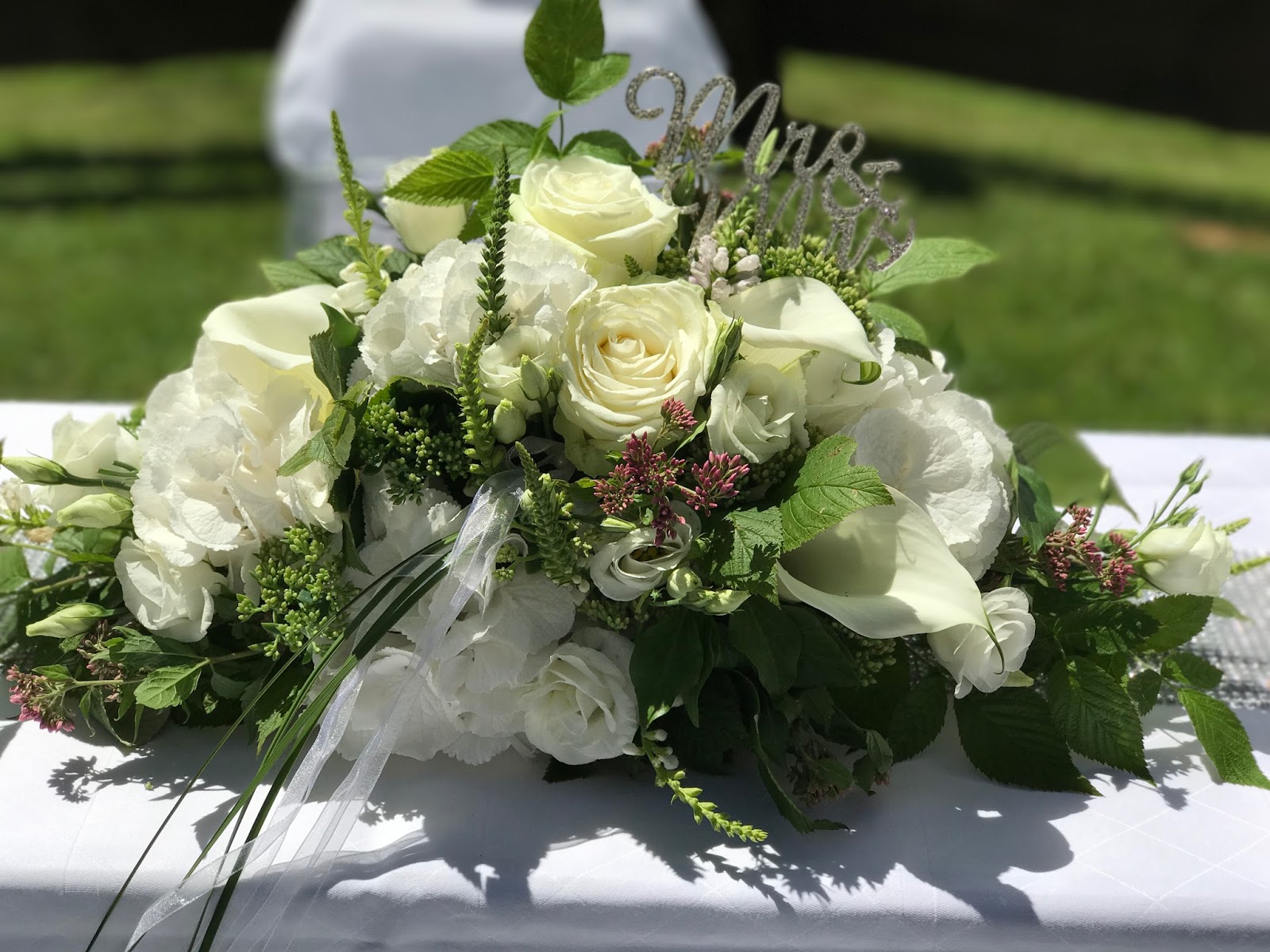 Der Brautstrauß war ein rundlich gebundenes weißes Wunderwerk von Passiflori Penzberg, bestehend aus weißen Calla, Hortensien und umschlungen mit Gräsern mit glitzerndem Strassband und Silberdraht am Stiel und natürlich mit passendem Anstecker für den Bräutigam.