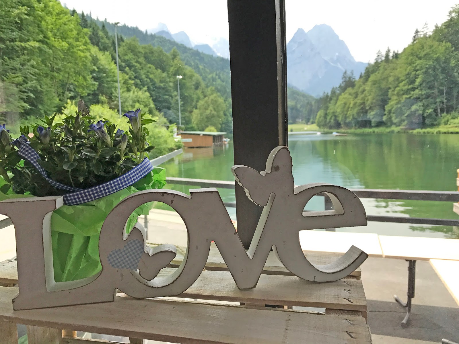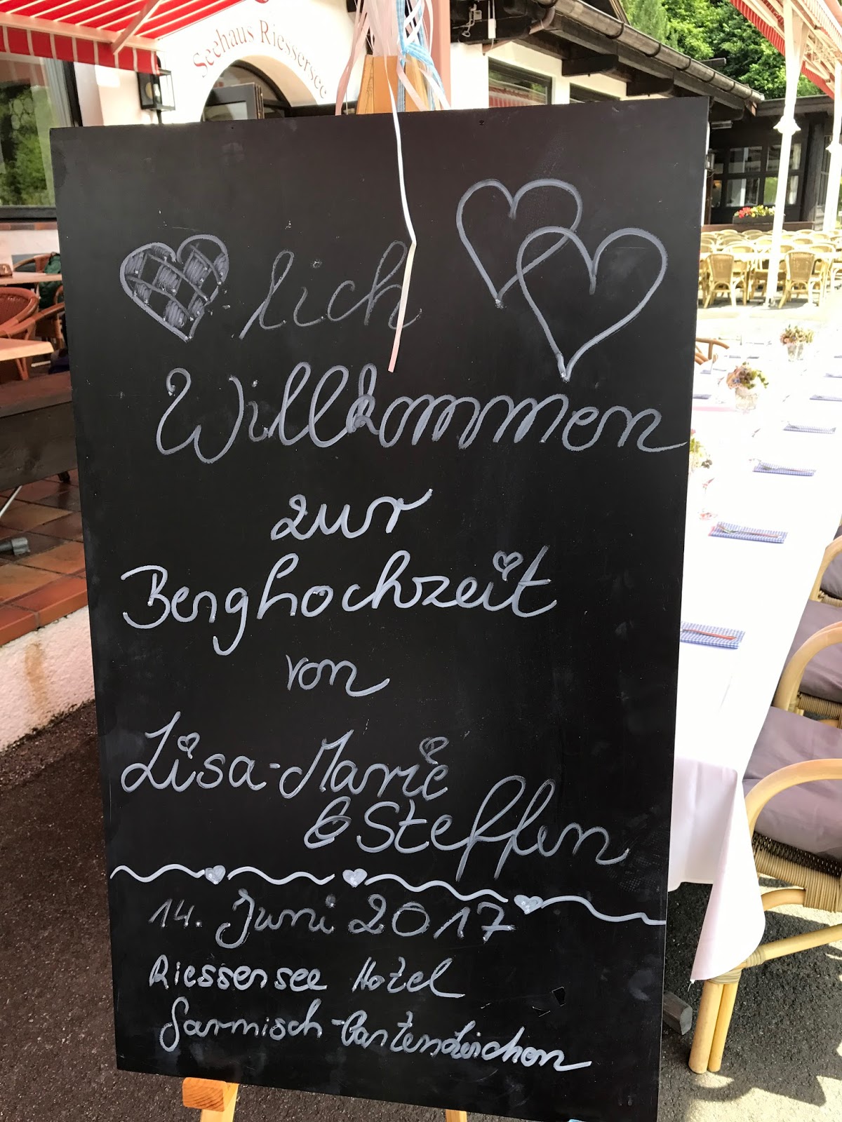 Am Nachmittag kehrte man dann zurück an den Riessersee, wo auf der Terrasse am Seehaus eine Willkommenstafel die Gäste begrüßte. Himmelblaue und weiße Luftballons warteten darauf, in den Sommerhimmel entlassen zu werden und unter der schattigen Markise war die Kaffee-Tafel gedeckt.