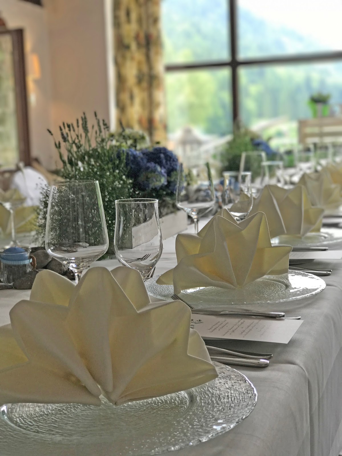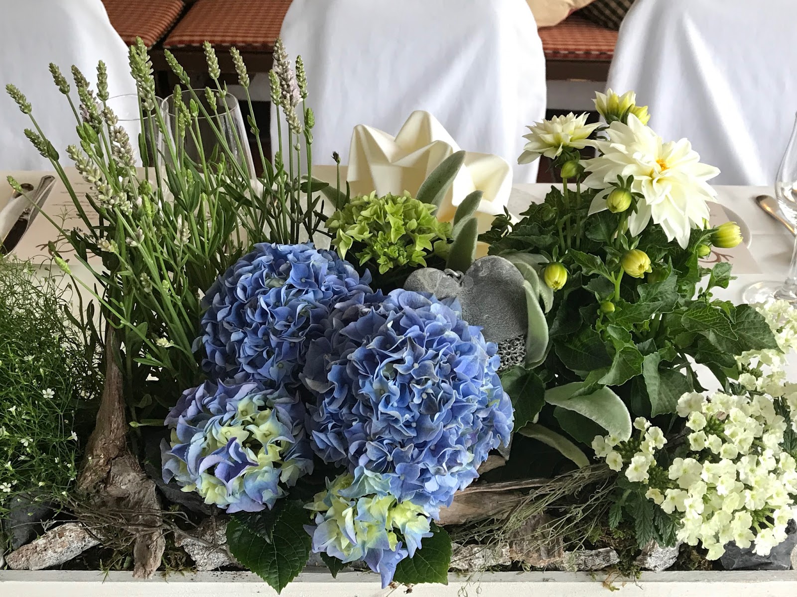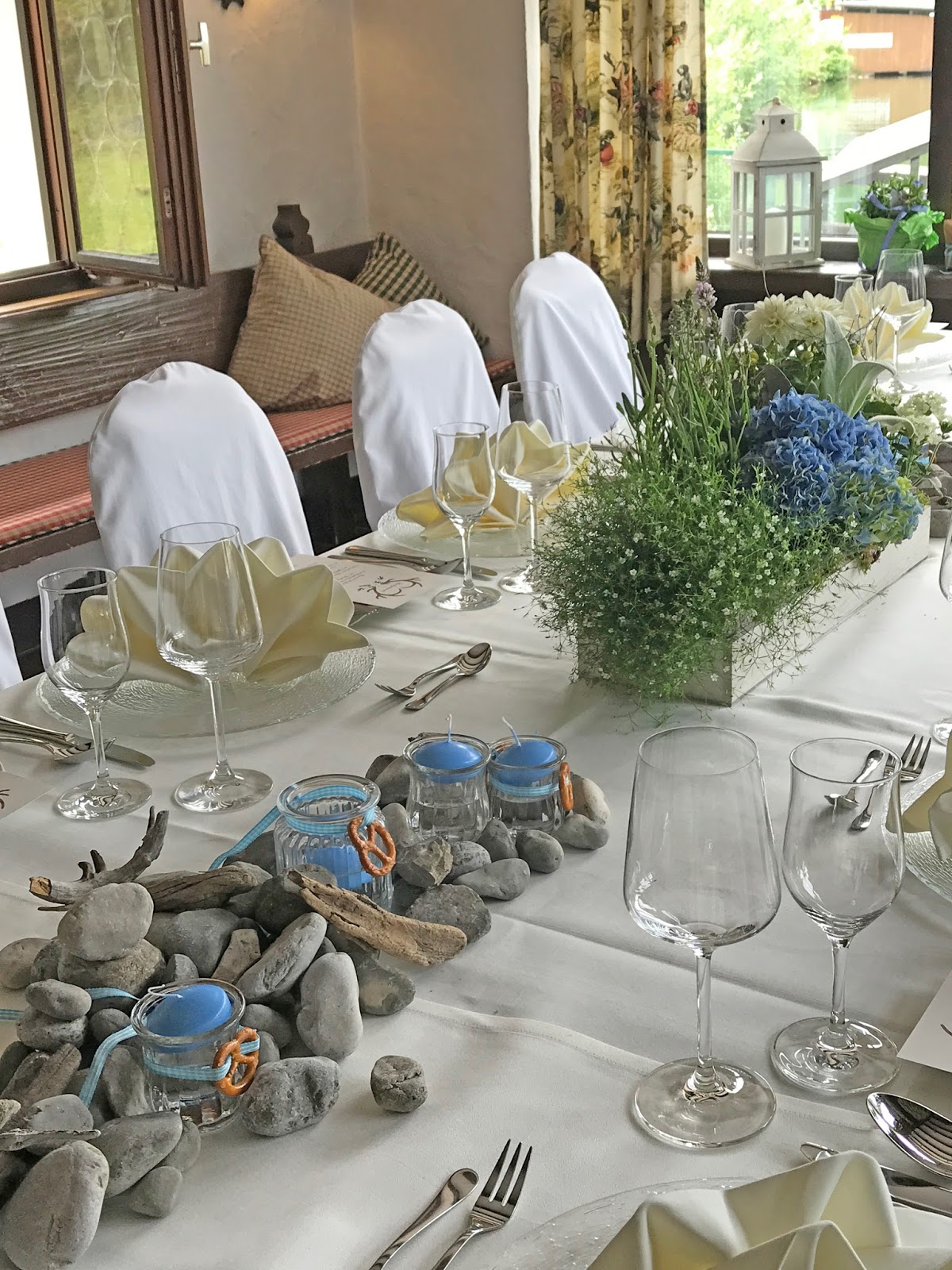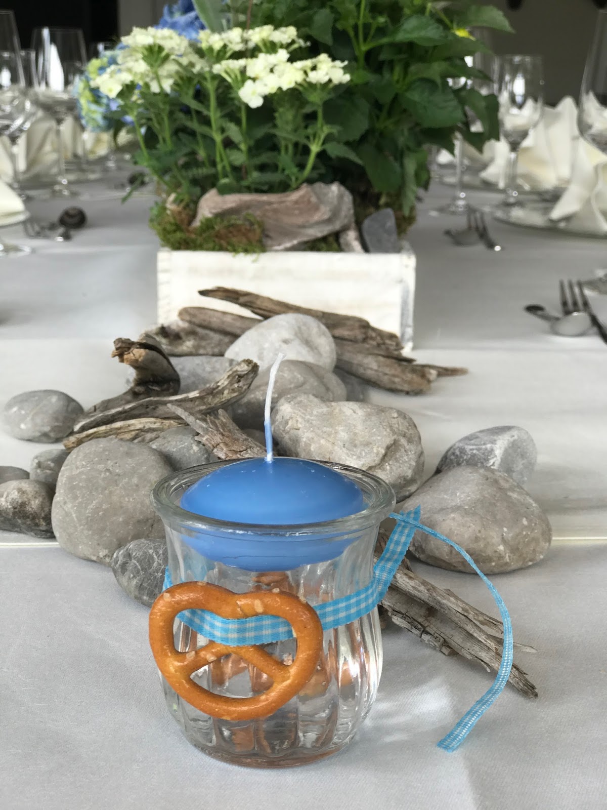 Passiflori hatte kleine Steingärten auf Holztabletts arrangiert. Die Pflanzen in Hellblau, Creme und Weiß waren teilweise getopft, ebenso wie die Gastgeschenke: Jedes Pärchen bekam einen frischen Enzian für den Garten zu Hause. Auf dem Tisch wurden die Blumen-Arrangements noch mit Schwemmholz und Flusskieseln ergänzt und die kleinen Glaswindlichter waren mit Bändern in himmelblauem Vichy-Karo und kleinen Salzbrezeln verziert.