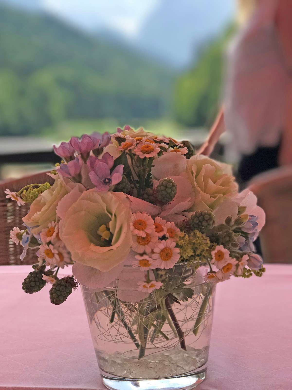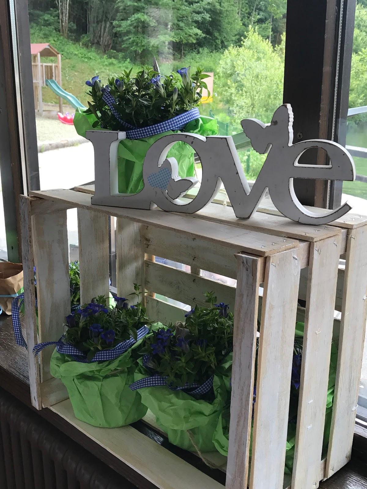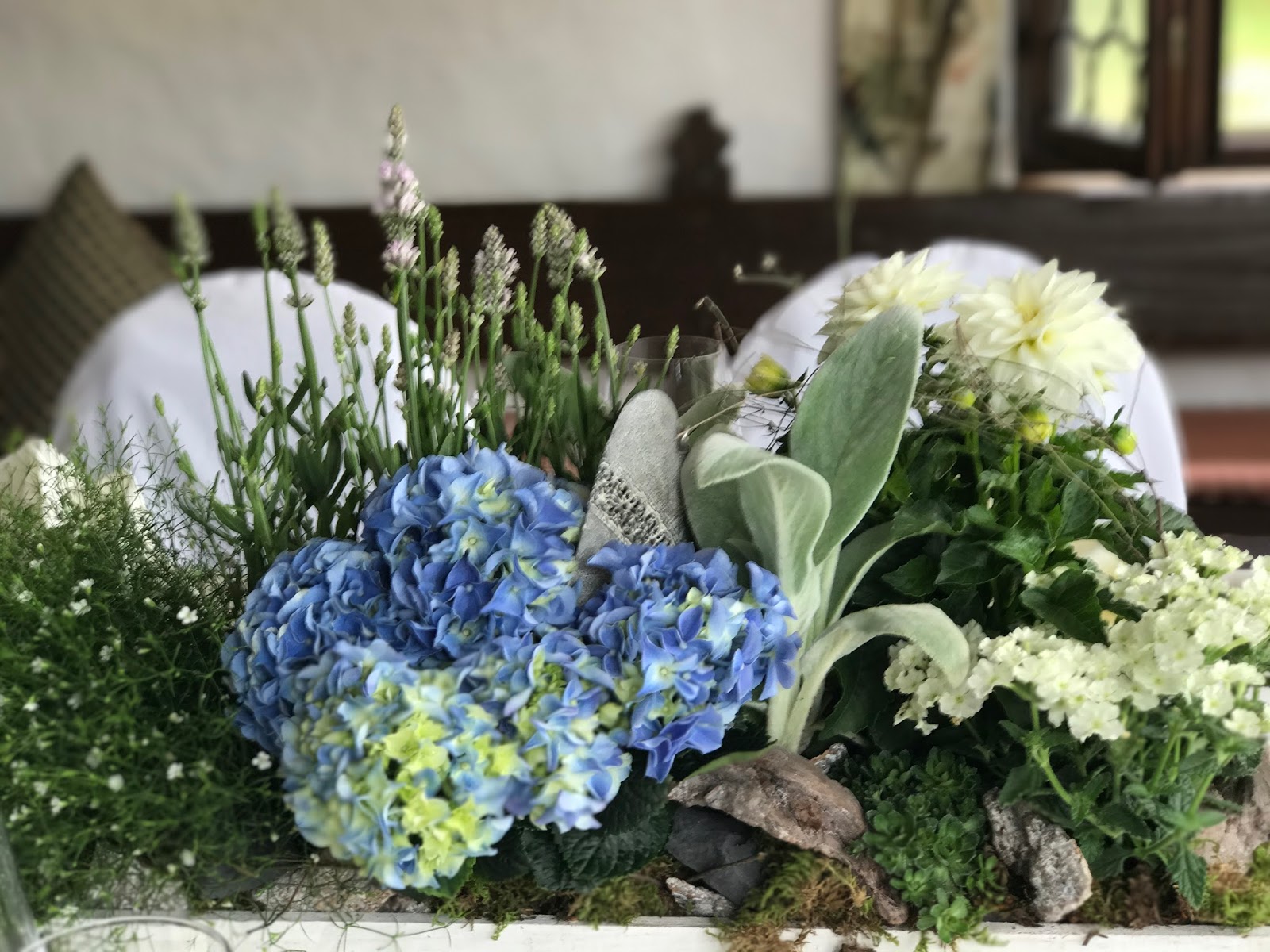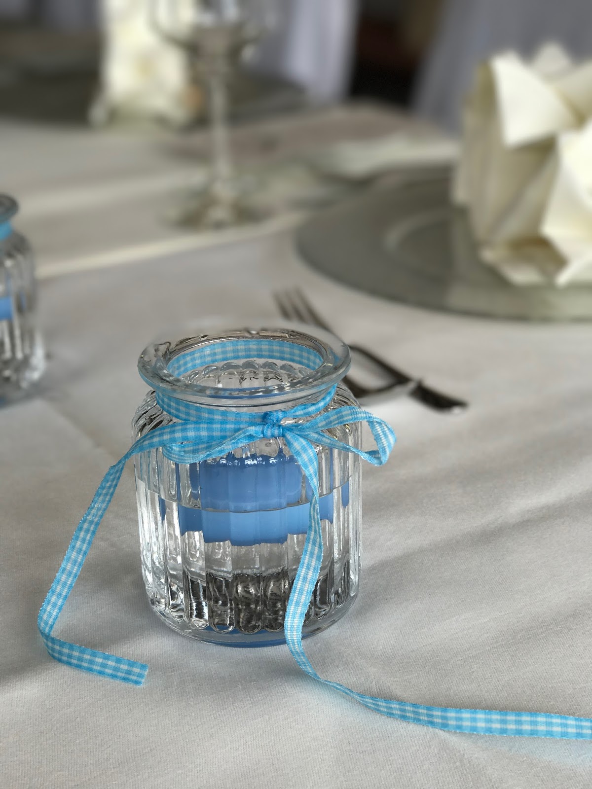 Passiflori hatte kleine Steingärten auf Holztabletts arrangiert. Die Pflanzen in Hellblau, Creme und Weiß waren teilweise getopft, ebenso wie die Gastgeschenke: Jedes Pärchen bekam einen frischen Enzian für den Garten zu Hause. Auf dem Tisch wurden die Blumen-Arrangements noch mit Schwemmholz und Flusskieseln ergänzt und die kleinen Glaswindlichter waren mit Bändern in himmelblauem Vichy-Karo und kleinen Salzbrezeln verziert.