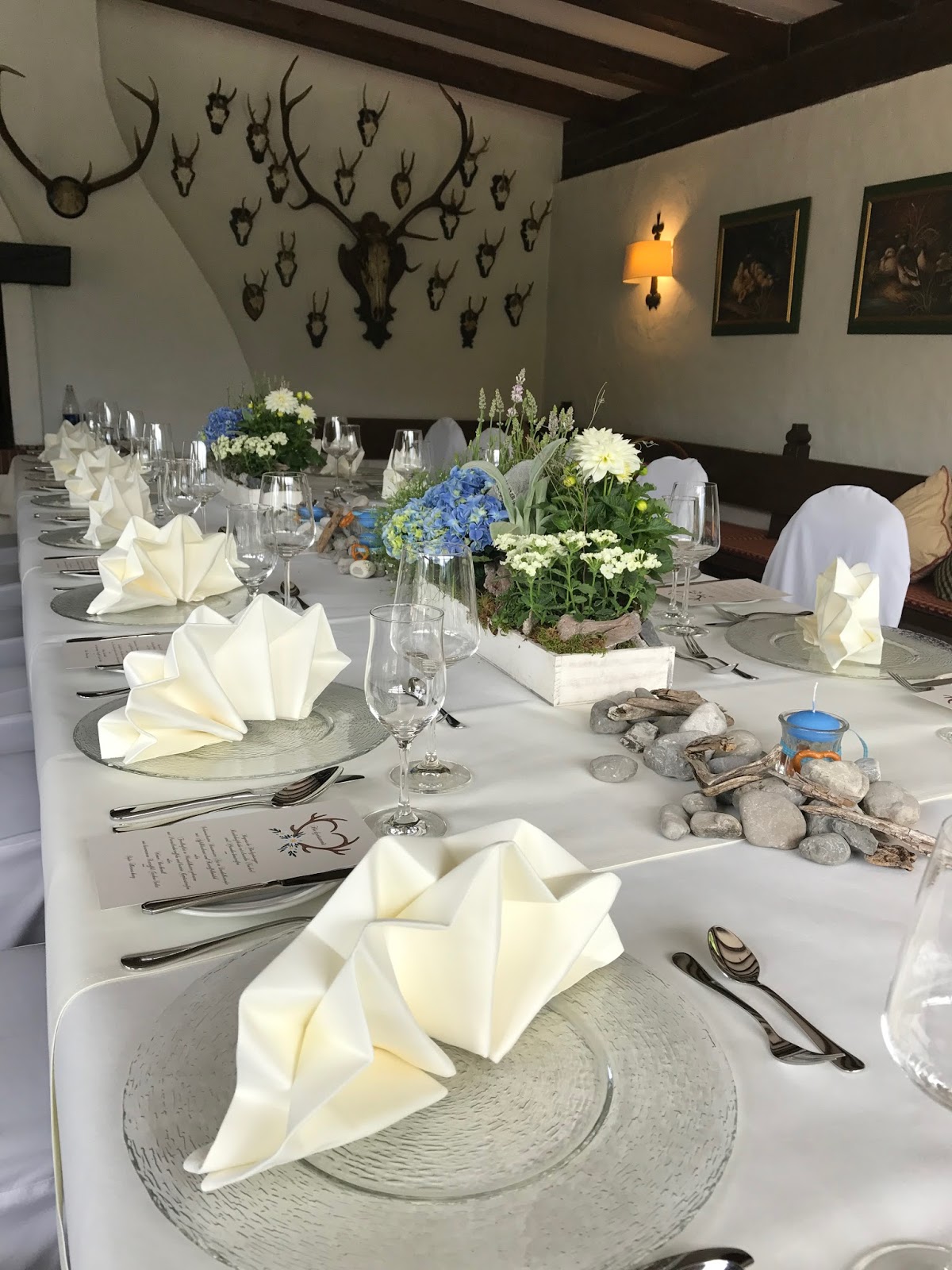 Die Menükarten, auf denen sich – ebenso wie im Jagdstüberl an der Wand – wieder das Geweih-Motiv fand, waren von uns bei der Kartenmacherei bestellt worden, auf Tischkarten wurde auf Grund der kleinen Gästezahl verzichtet.