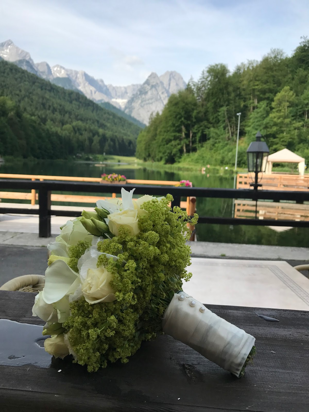 Für die Trauung auf Deutschlands höchstem Standesamt auf der Zugspitze in fast 3000 m Höhe, die um die Mittagszeit stattfinden sollte, war die Braut von Passiflori mit einem Kugelstrauß mit hellen Rosen und Calla, passend zum Hochzeitsdirndl, ausgestatttet worden. An der Talstation der Zahnradbahn am Eibsee – die Gondel ist in diesem Sommer außer Betrieb – trafen sich Brautpaar und Gäste mit den Hochzeitsfotografen Lutz und Angela Stoess, die sie den Tag über begleiteten.