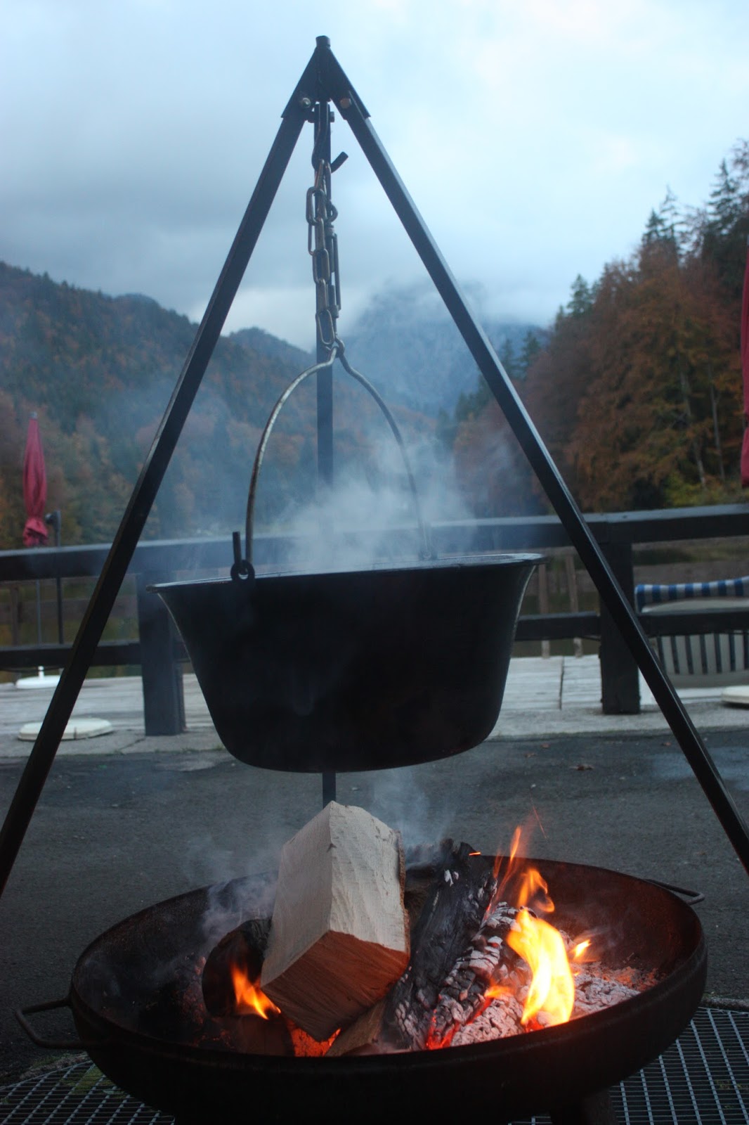 Leider war die Sicht auf Deutschlands höchstem Berg gleich Null, es schneite sogar zeitweise und so wurde die Herbsthochzeit fast schon zur Winterhochzeit. Doch das tat der Stimmung keinen Abbruch und die kleine Hochzeitsgesellschaft kehrte am frühen Abend bestens gelaunt zurück ins Seehaus am Riessersee. Auf der Seeterrasse war schon das Feuer unter dem Punschkessel kräftig angeschürt worden, die Koitaboch-Musi, die schon am Abend vorher Brautpaar und Gäste begeistert hatte, spielte zünftig auf und die Riessersee-Küche hatte einige Appetithäppchen als Einstimmung auf das Hochzeitsdinner vorbereitet.