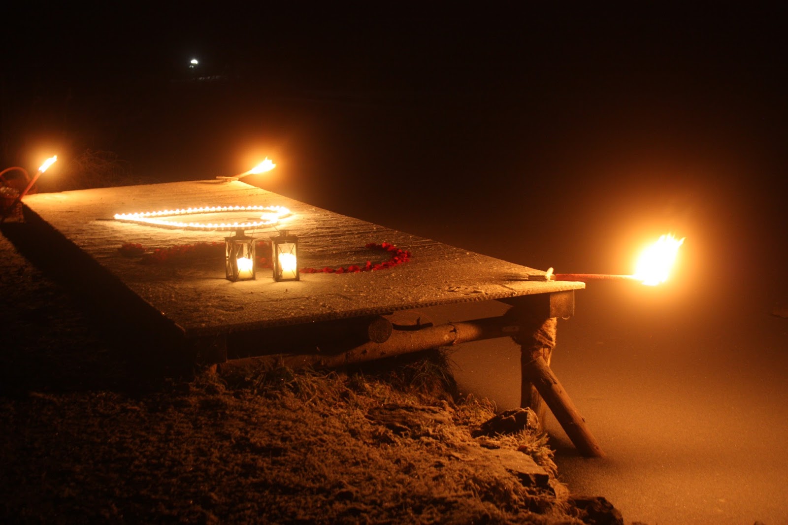 Da der Antrag während eines abendlichen Spazierganges um den See stattfinden sollte, hatten wir uns für die Flossanlegestelle an der hinteren Seespitze entschieden, ein kleiner Holzsteg, der in den See hineinragt. Zunächst setzten wir ein großes Herz aus Teelichtern und gleich daneben ein riesiges Fragezeichen aus dunkelroten Rosenblütenblättern, das mit Laternen angestrahlt wurde.