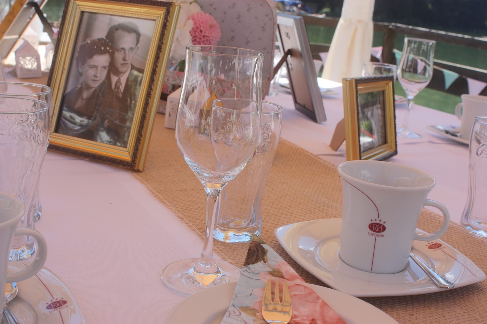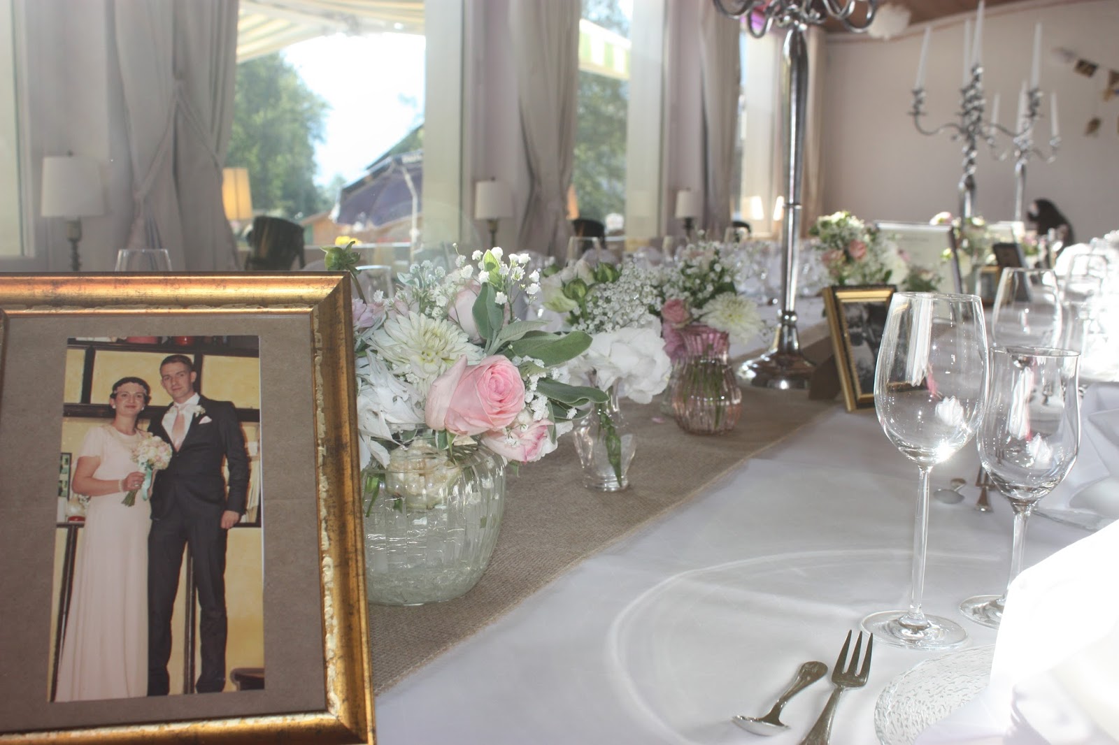 Im Kaminzimmer im Seehaus war die Hochzeitstafel ebenfalls im Vintage-Look gedeckt und an der Decke waren einige Pompons in Weiß und Rosa gebracht worden. Die Holzscheiben an den Wänden waren abgenommen worden und dafür Fotoketten aufgehängt. Den Tisch selbst zierte ein Tischband aus Jute, darauf hohe Silberleuchter mit weißen Kerzen und die Familienfotos, die wiederum mit umgezogen waren. Das Menü fand in einem Silberrahmen auf dem Tisch seinen Platz und dazwischen wurden zahlreiche kleine Blütenarrangements in unterschiedlichen Glasvasen, -fläschchen und -gefäßen in Pastelltönen gestellt (Passiflori Blumen Penzberg).