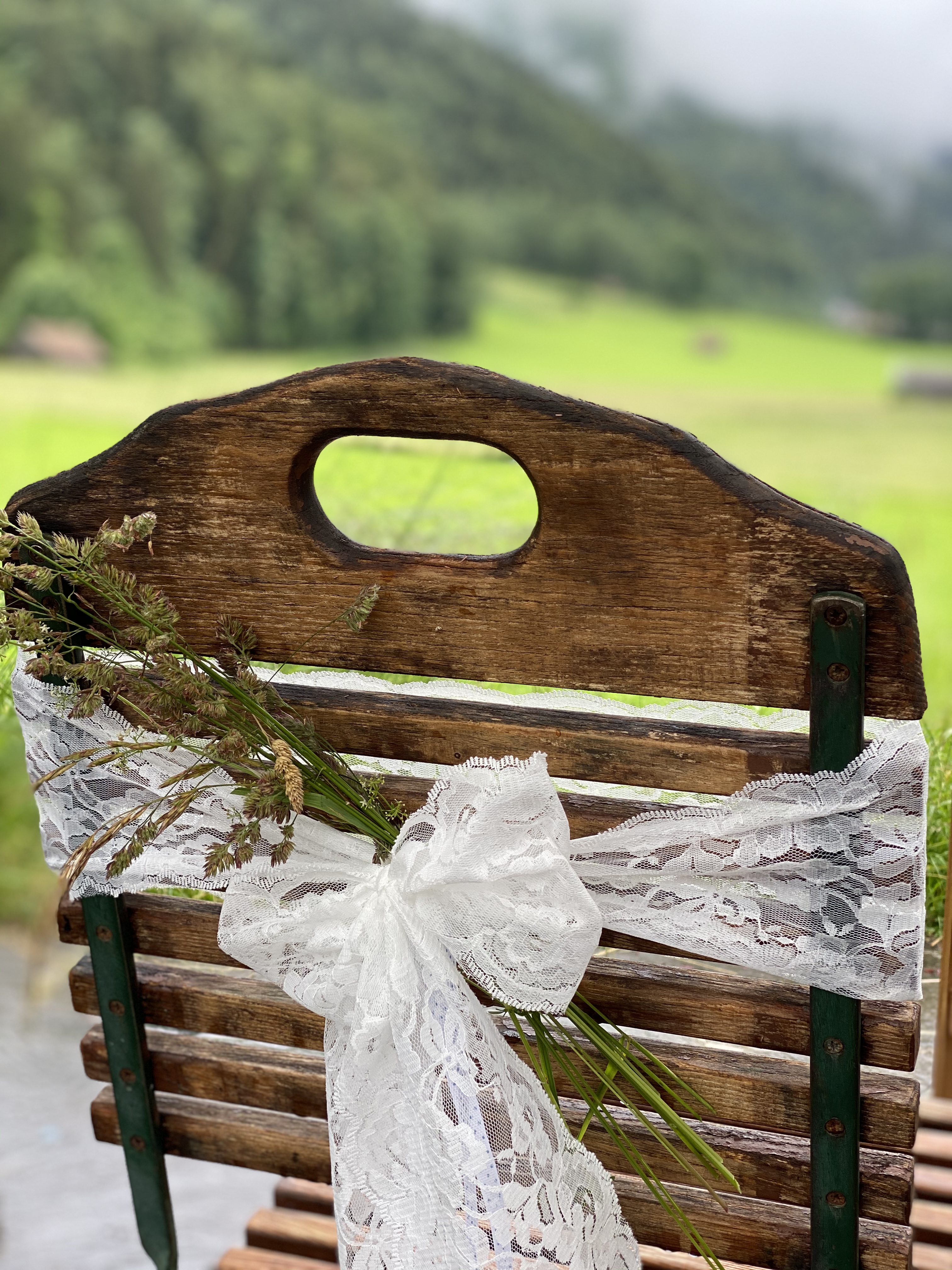 Das Brautpaar wollte keine üppige Dekoration, Ihnen war die Trauungszeremonie mit Frau Annemarie von den Hochzeitsrednern Tirol wichtiger. Ganz ohne ein paar hübsche Details geht es jedoch für die Hochzeitsplanerin nicht, also brachte ich aus meinem Fundus Spitzenbänder, Holzbuchstaben und Kerzen mit und ergänzte das mit Gräsern und Klee von den Wiesen ringsum.