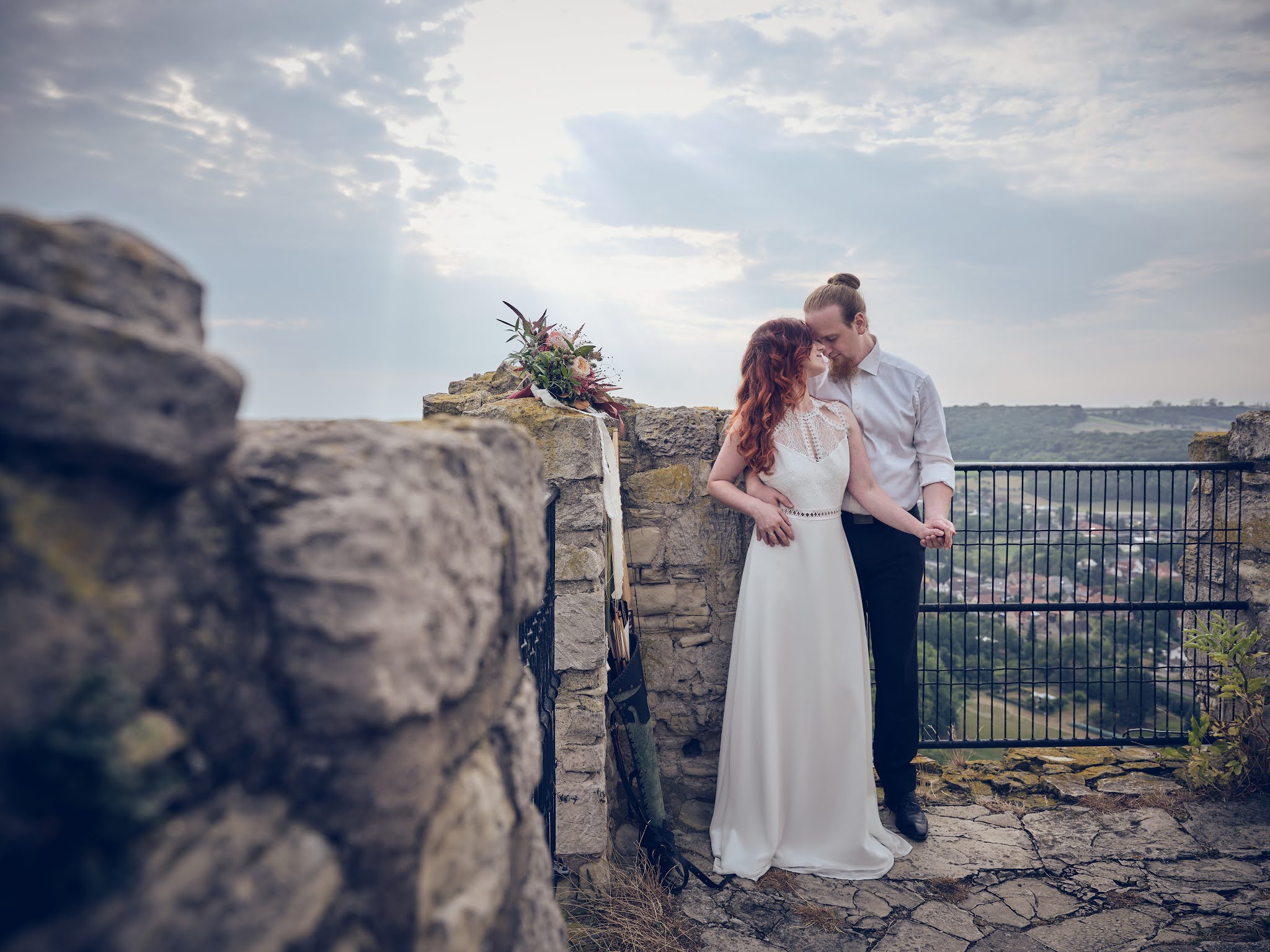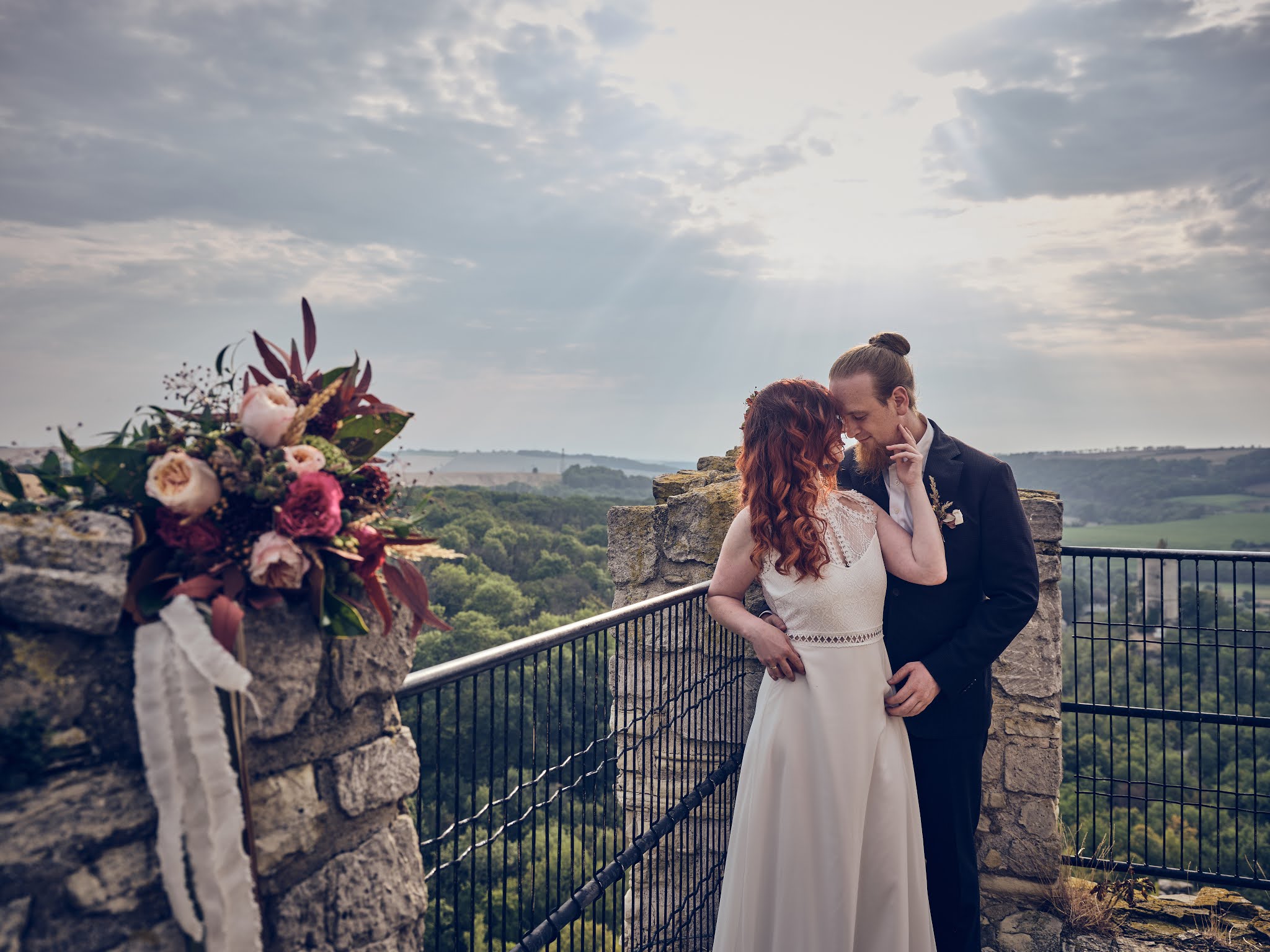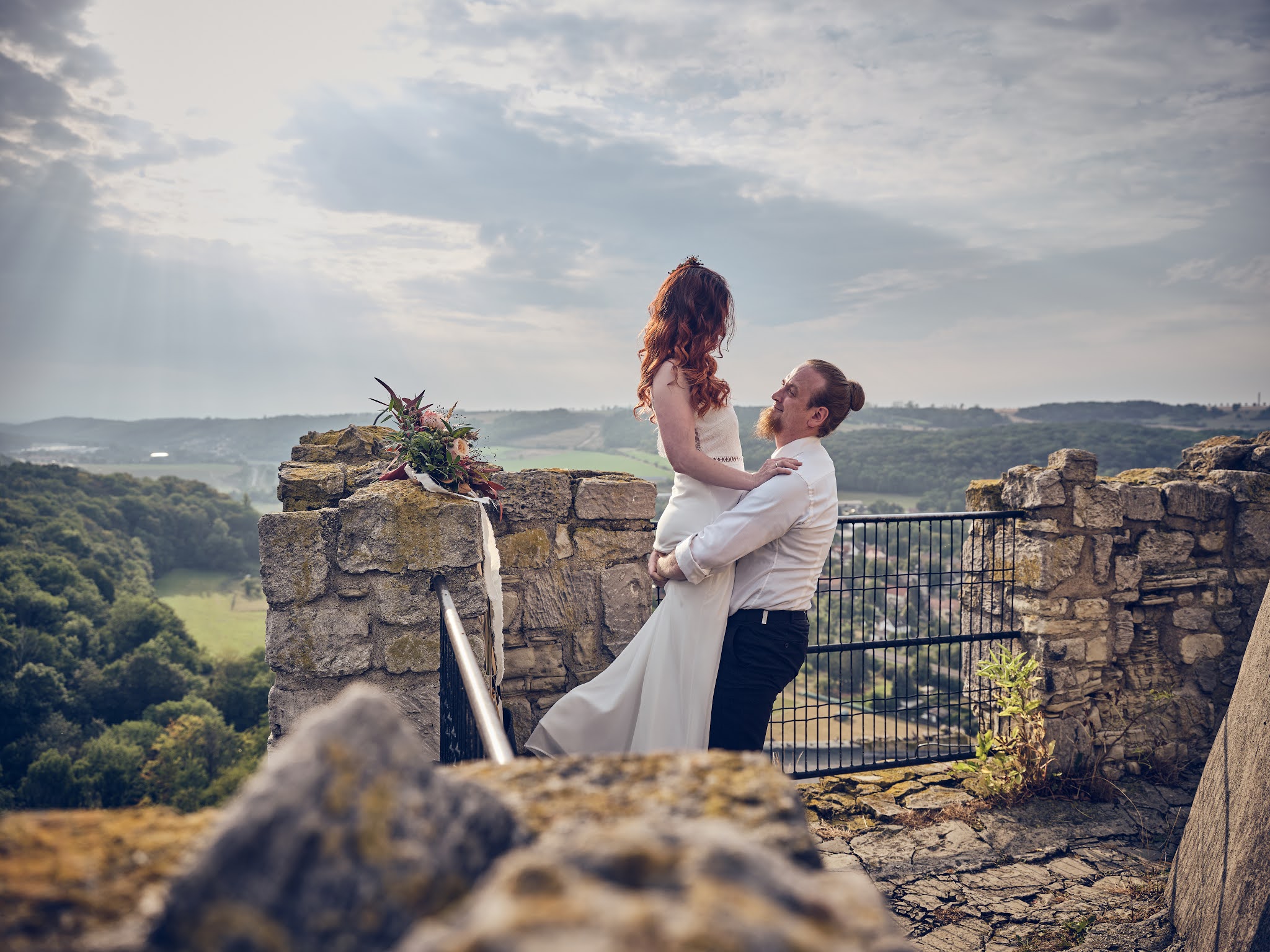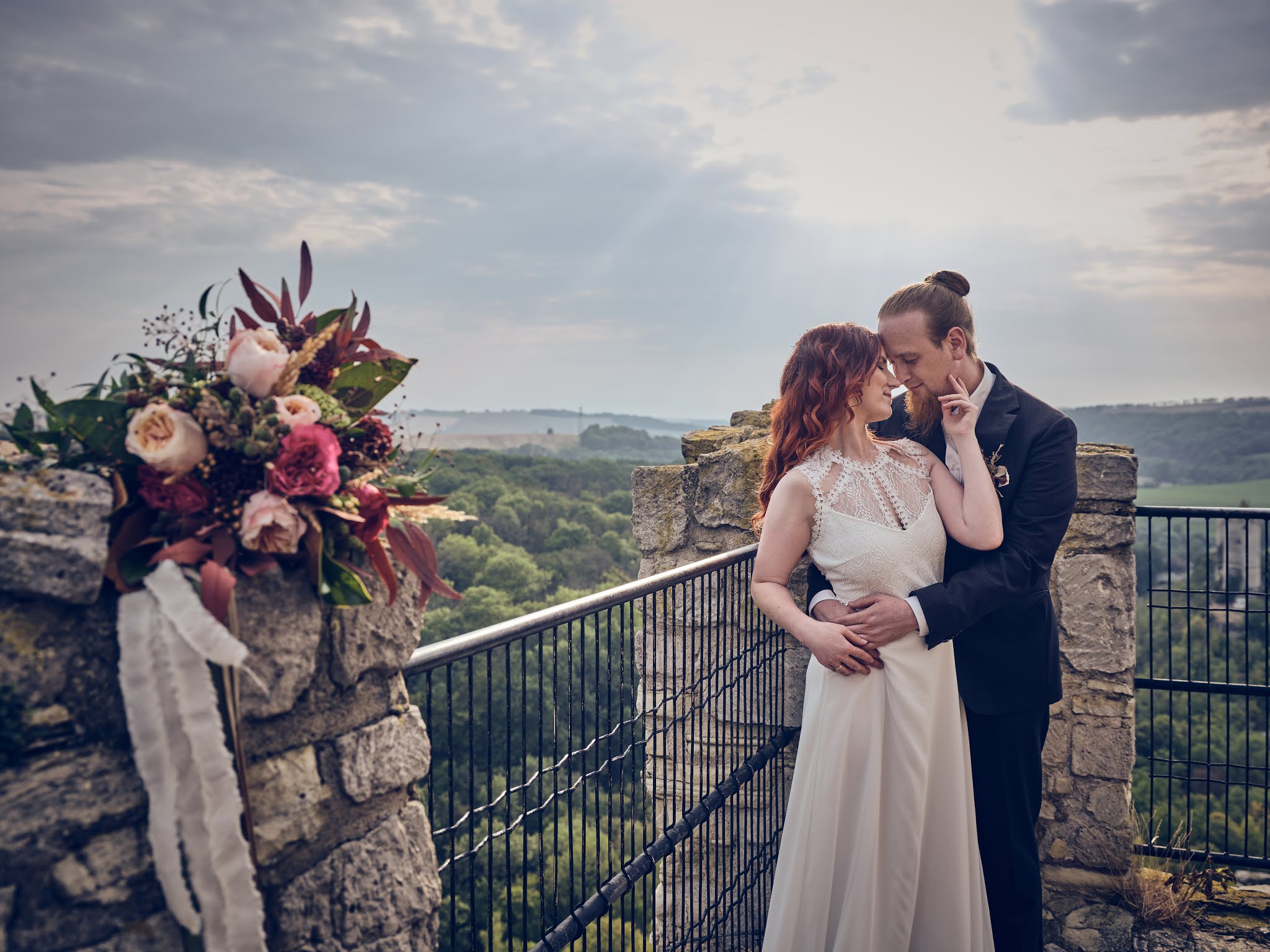 Auch für freie Trauungen bietet die Rudelsburg wunderbare Orte, innerhalb und außerhalb der Burg. Wir haben uns für den Burghof entschieden, dem Charme der alten Mauern und dem wunderbaren Blick hinunter ins Tal konnten wir uns nicht entziehen. Übrigens am Abend, bei Sonnenuntergang, noch einmal ein ganz besonderes Highlight. Wie gerne hätten wir auch noch eine Sundowner-Trauung fotografiert, aber zeitlich war das diesmal nicht mehr möglich. Aber vielleicht findet sich ja bald ein Brautpaar, das sich in dieser wunderbaren Location im Sonnenuntergang das Ja-Wort geben möchte…