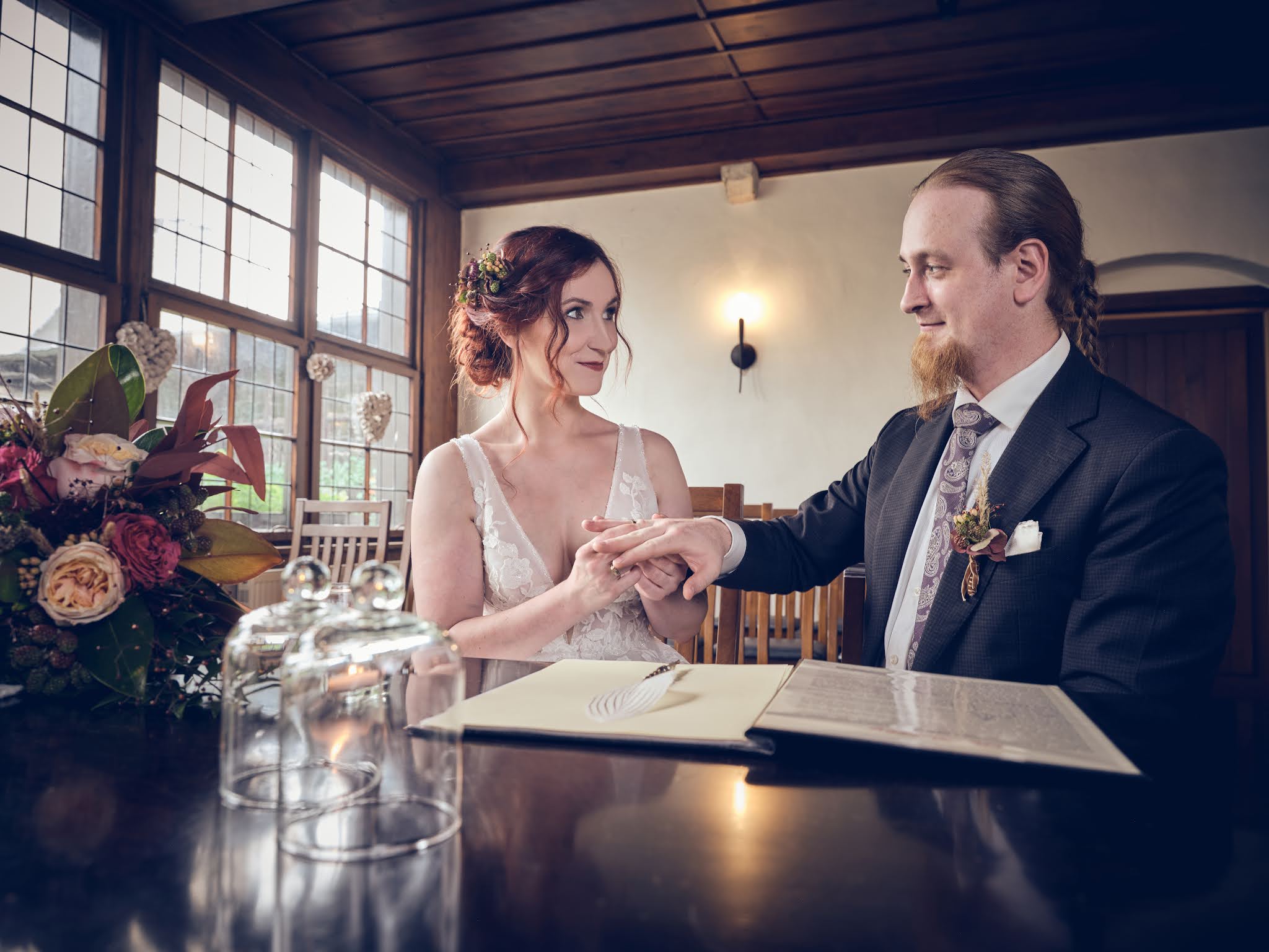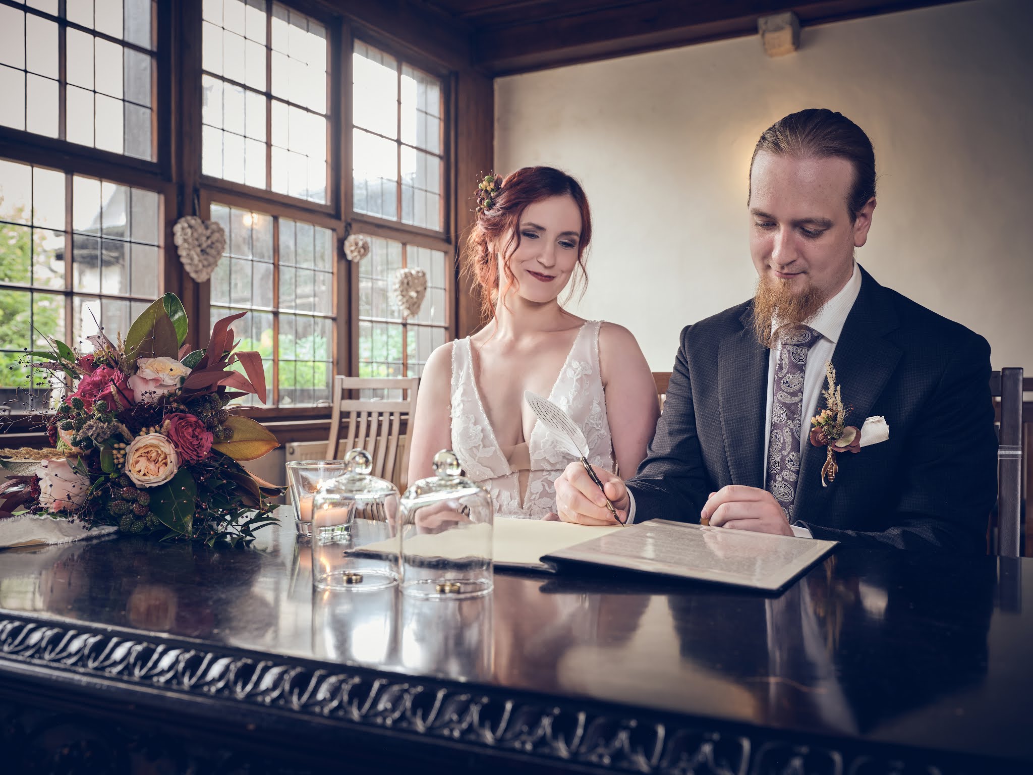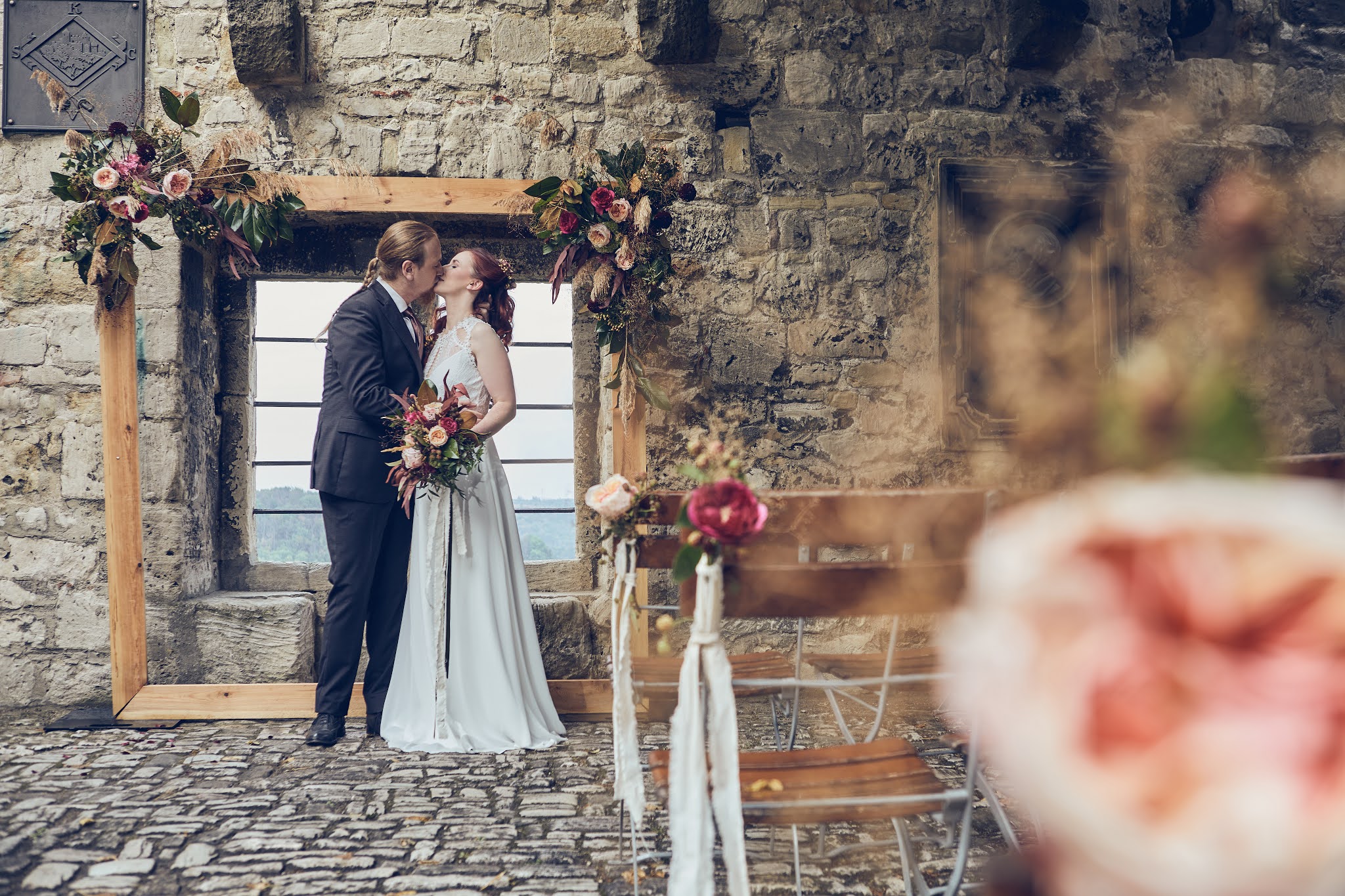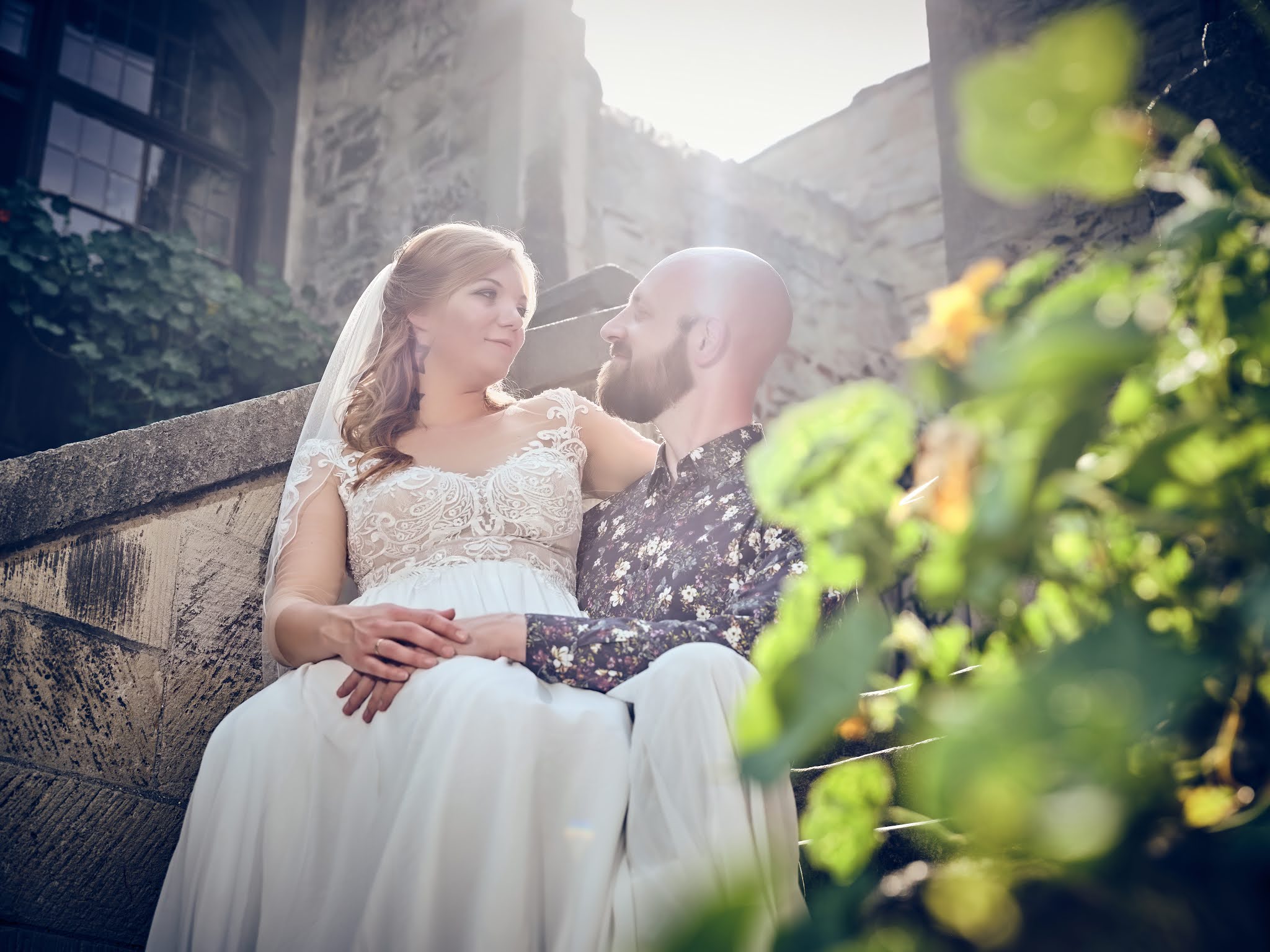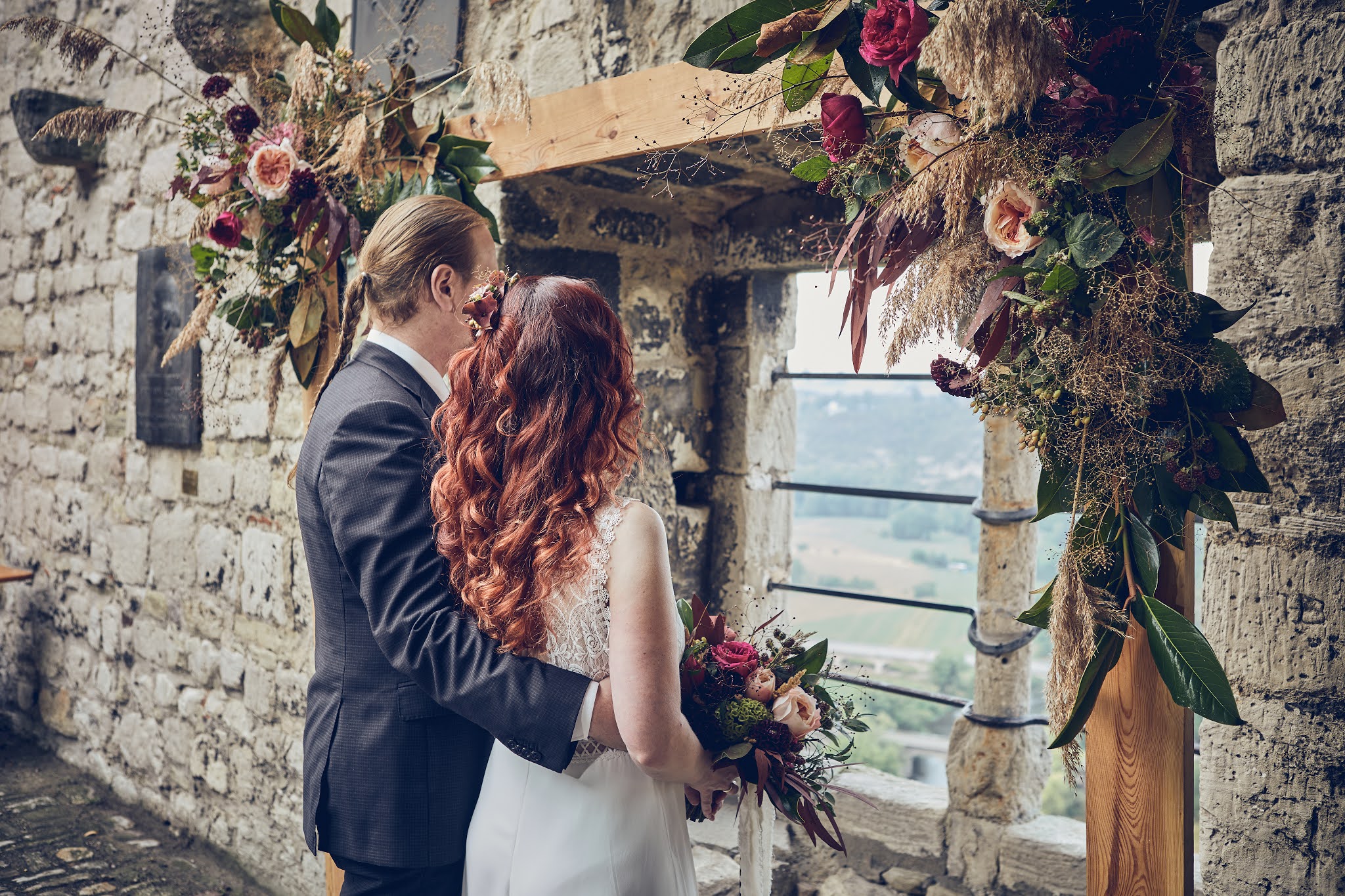 Auch für freie Trauungen bietet die Rudelsburg wunderbare Orte, innerhalb und außerhalb der Burg. Wir haben uns für den Burghof entschieden, dem Charme der alten Mauern und dem wunderbaren Blick hinunter ins Tal konnten wir uns nicht entziehen. Übrigens am Abend, bei Sonnenuntergang, noch einmal ein ganz besonderes Highlight. Wie gerne hätten wir auch noch eine Sundowner-Trauung fotografiert, aber zeitlich war das diesmal nicht mehr möglich. Aber vielleicht findet sich ja bald ein Brautpaar, das sich in dieser wunderbaren Location im Sonnenuntergang das Ja-Wort geben möchte…