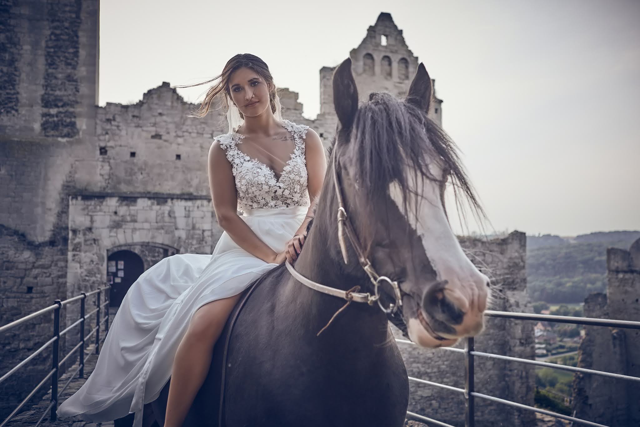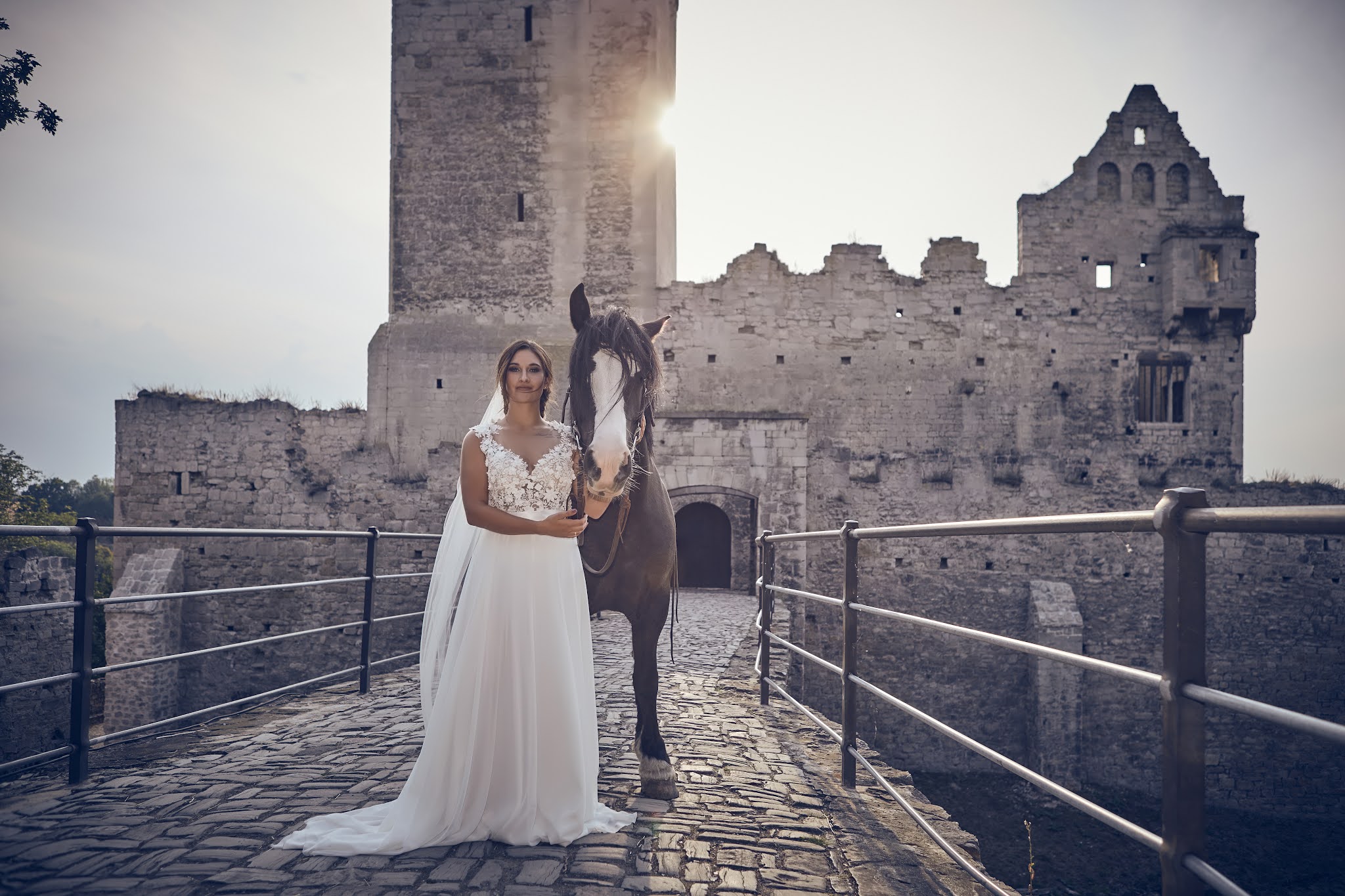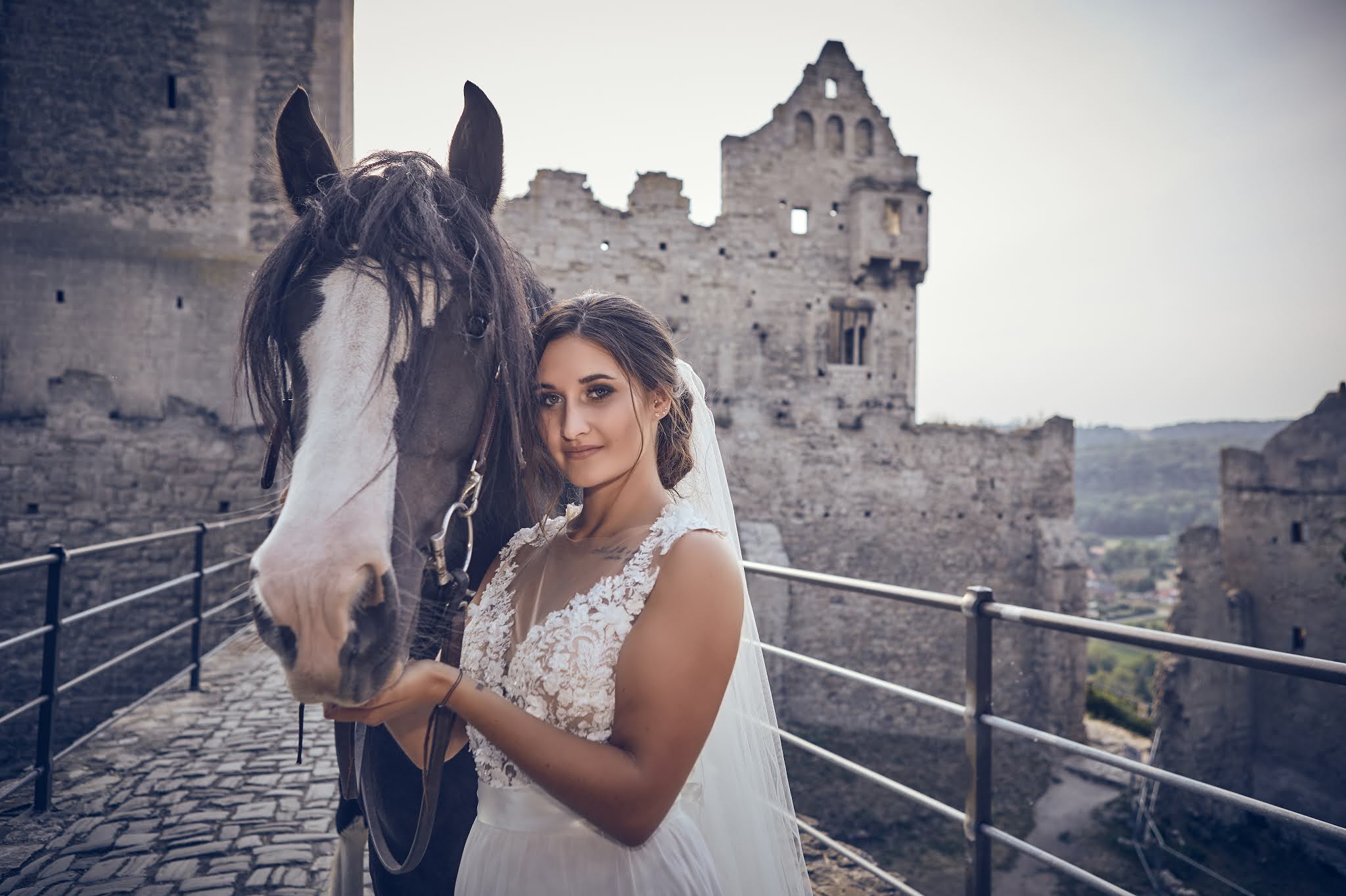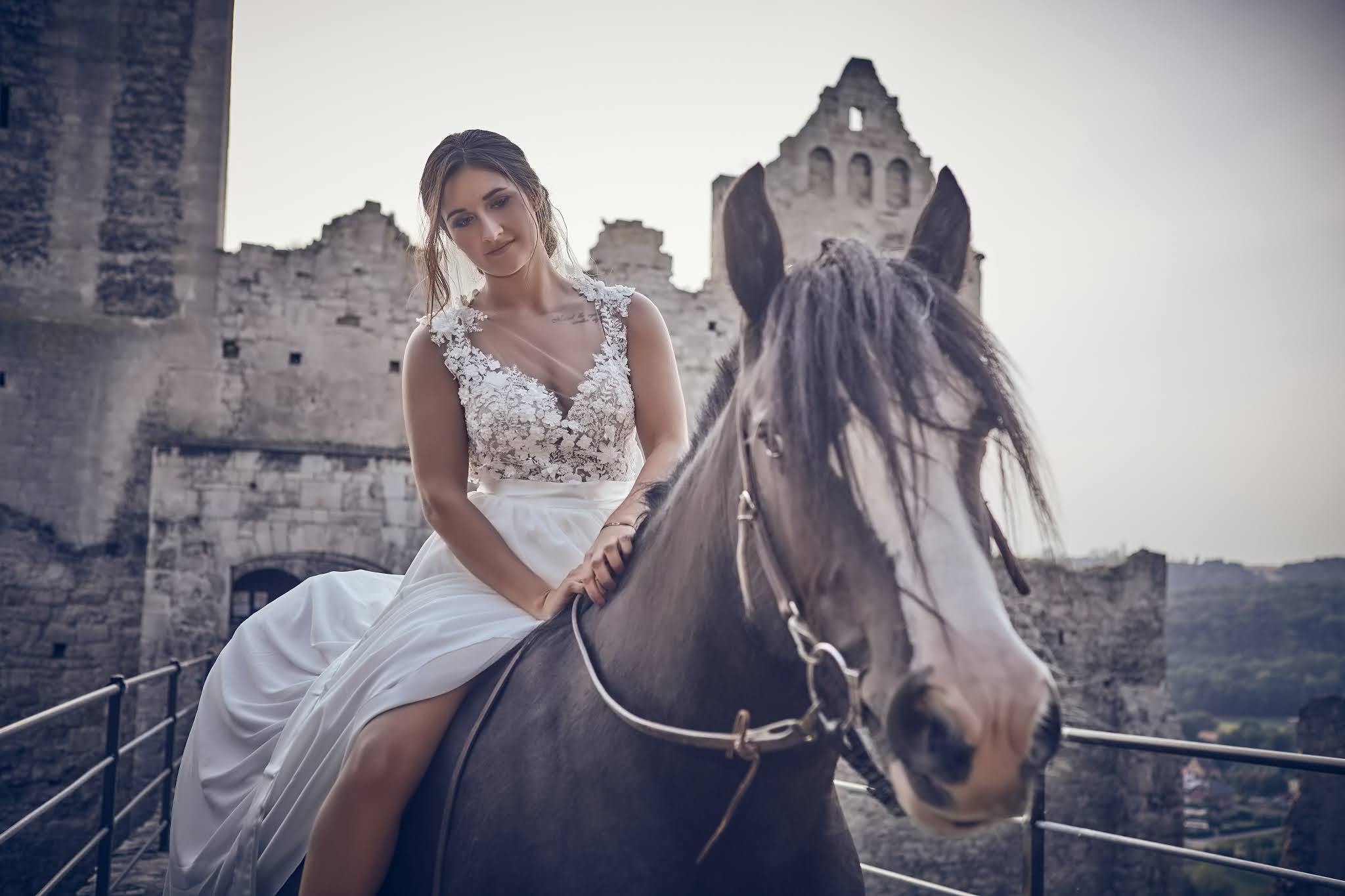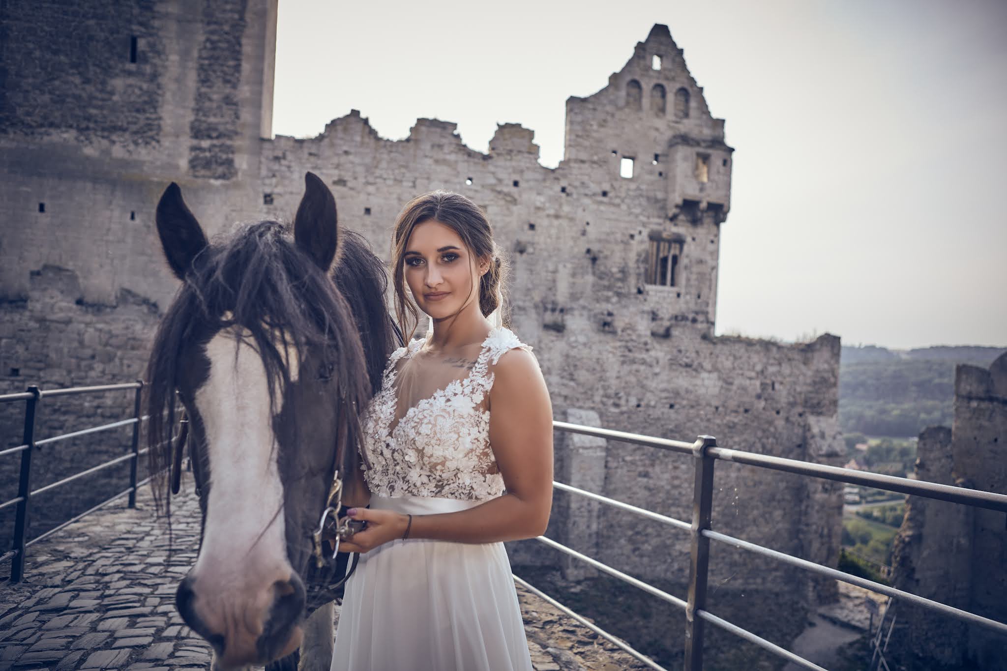 Doch die Rudelsburg hat noch mehr zu bieten. Hier leben Vierbeiner, die jedes Pferdemädchen-Herz höher schlagen lassen. Unser Modell, selbst Reiterin und Pferdefreundin, zeigte uns, dass man sich auch barfuß und im Brautkleid auf einem Pferderücken wohl fühlen kann. Es muss nicht immer der Prinz sein, der auf einem weißen Schimmel angeritten kommt, manchmal schwingt sich die Prinzessin selbst auf´s Pferd und reitet zum Ball wie Highland-Prinzessin Merida. Wild & free!