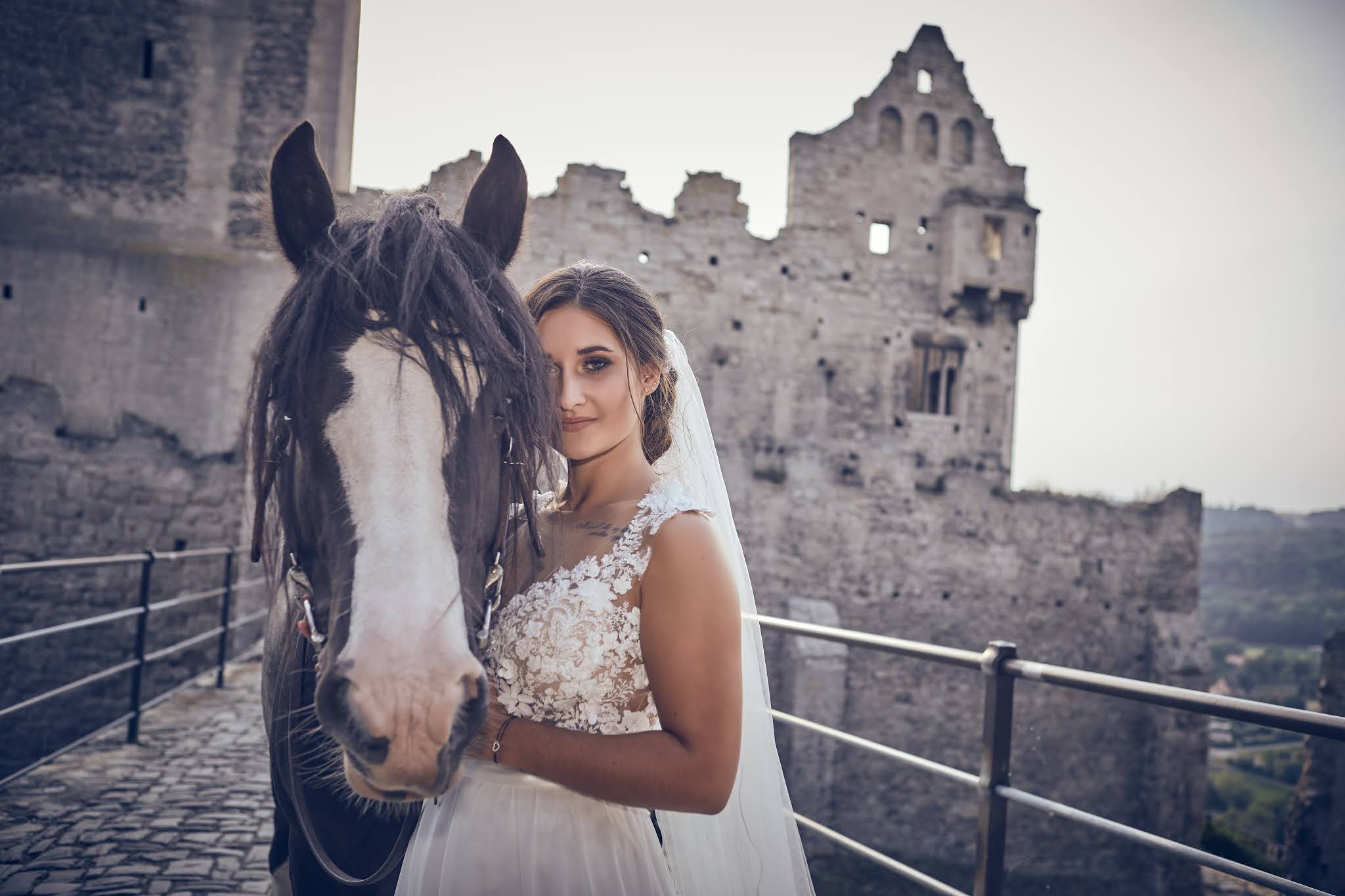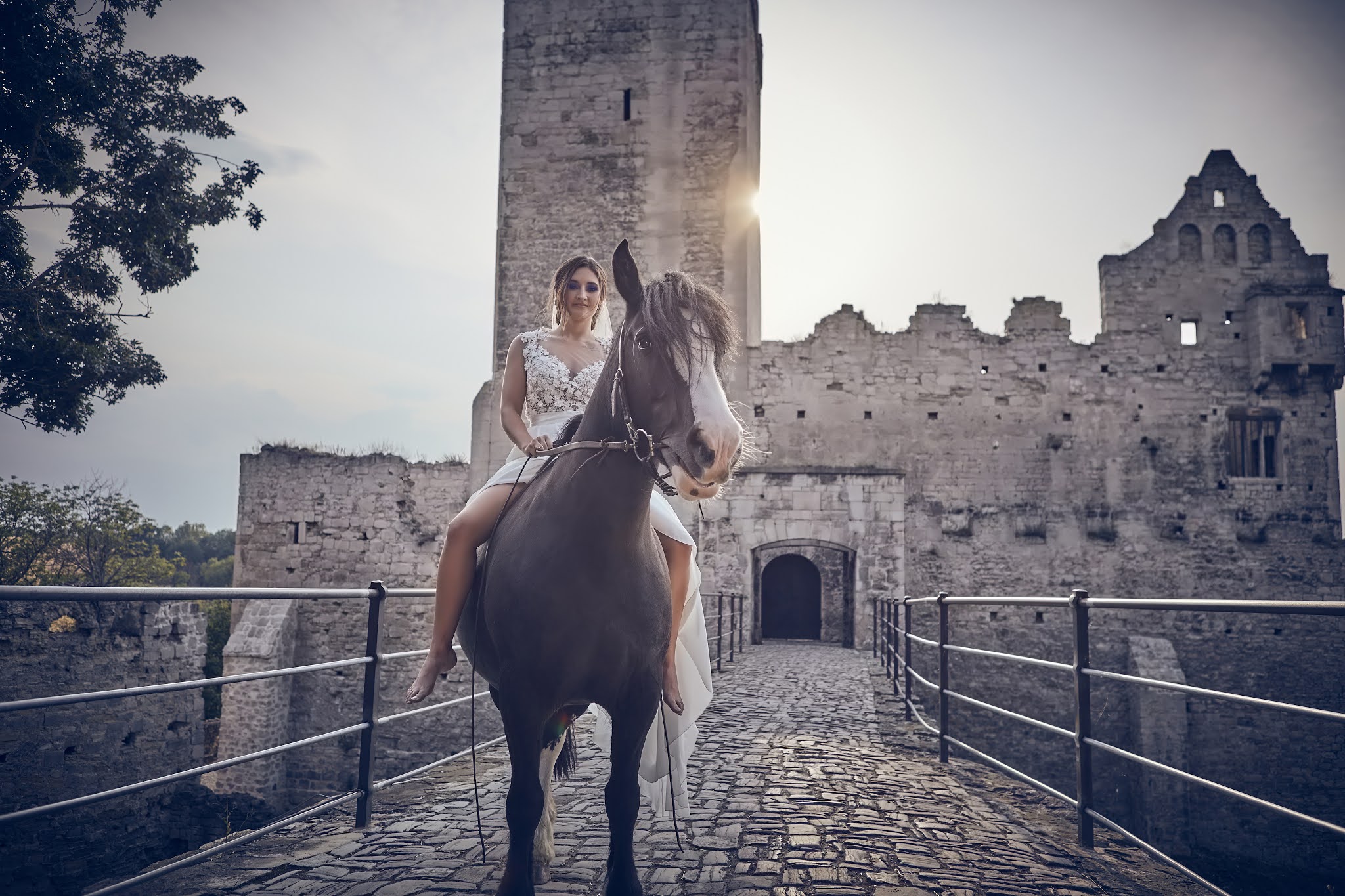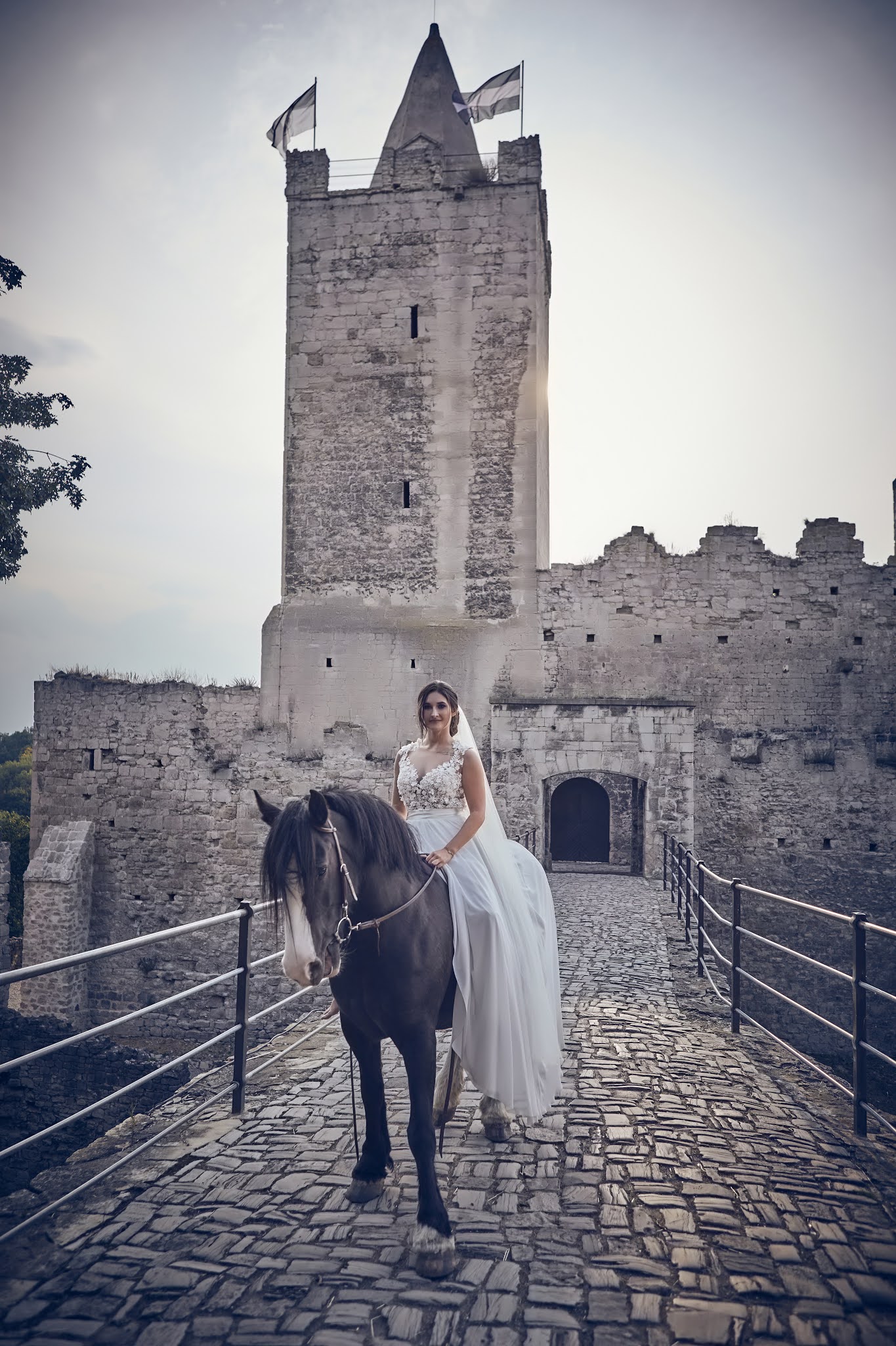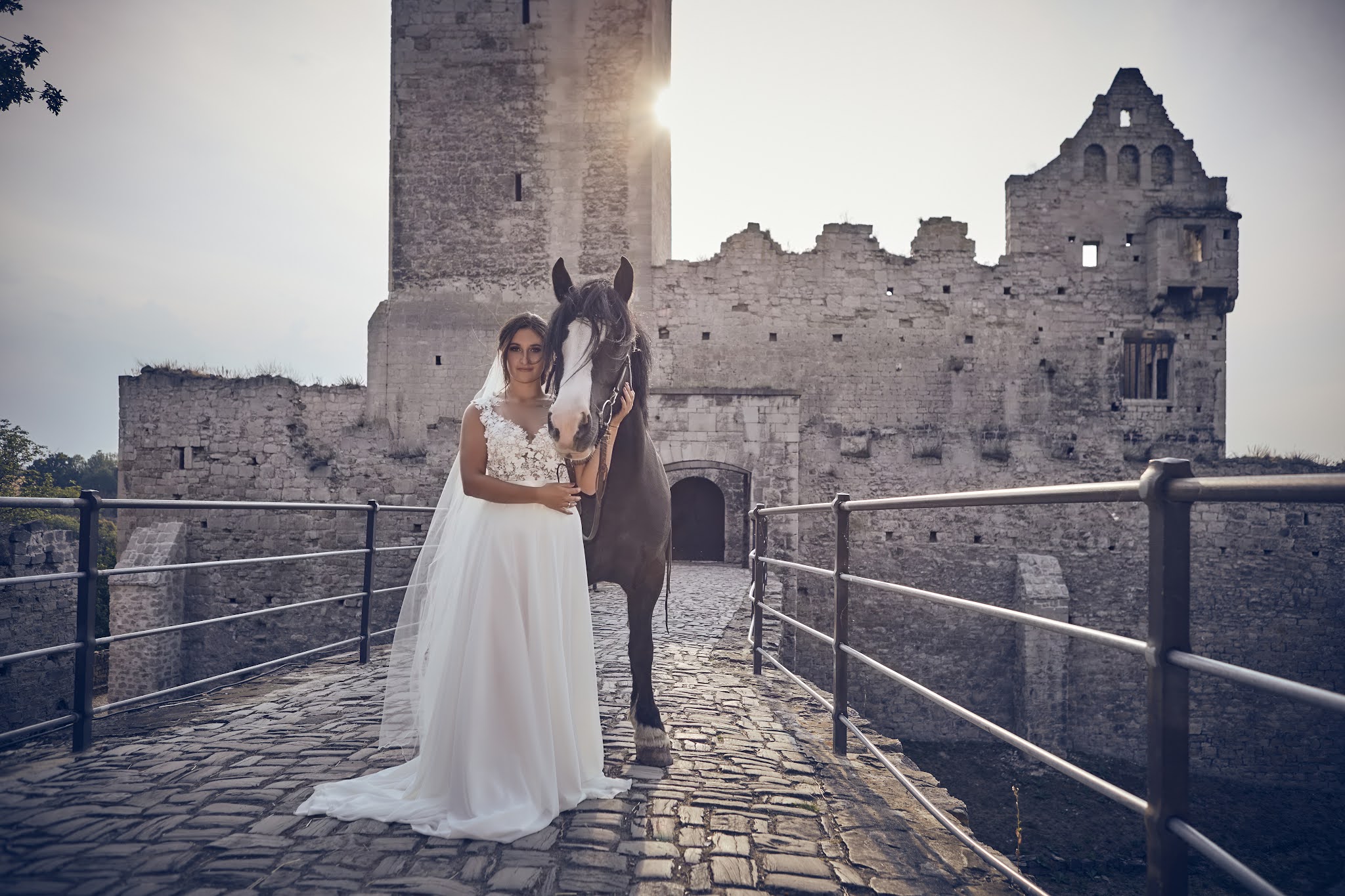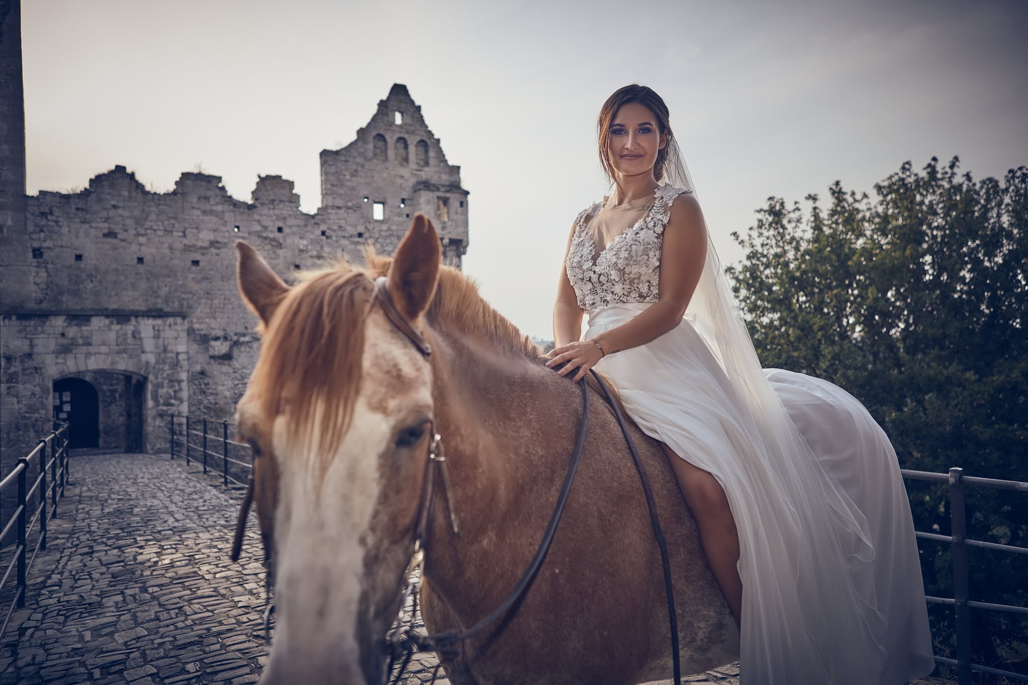 Doch die Rudelsburg hat noch mehr zu bieten. Hier leben Vierbeiner, die jedes Pferdemädchen-Herz höher schlagen lassen. Unser Modell, selbst Reiterin und Pferdefreundin, zeigte uns, dass man sich auch barfuß und im Brautkleid auf einem Pferderücken wohl fühlen kann. Es muss nicht immer der Prinz sein, der auf einem weißen Schimmel angeritten kommt, manchmal schwingt sich die Prinzessin selbst auf´s Pferd und reitet zum Ball wie Highland-Prinzessin Merida. Wild & free!