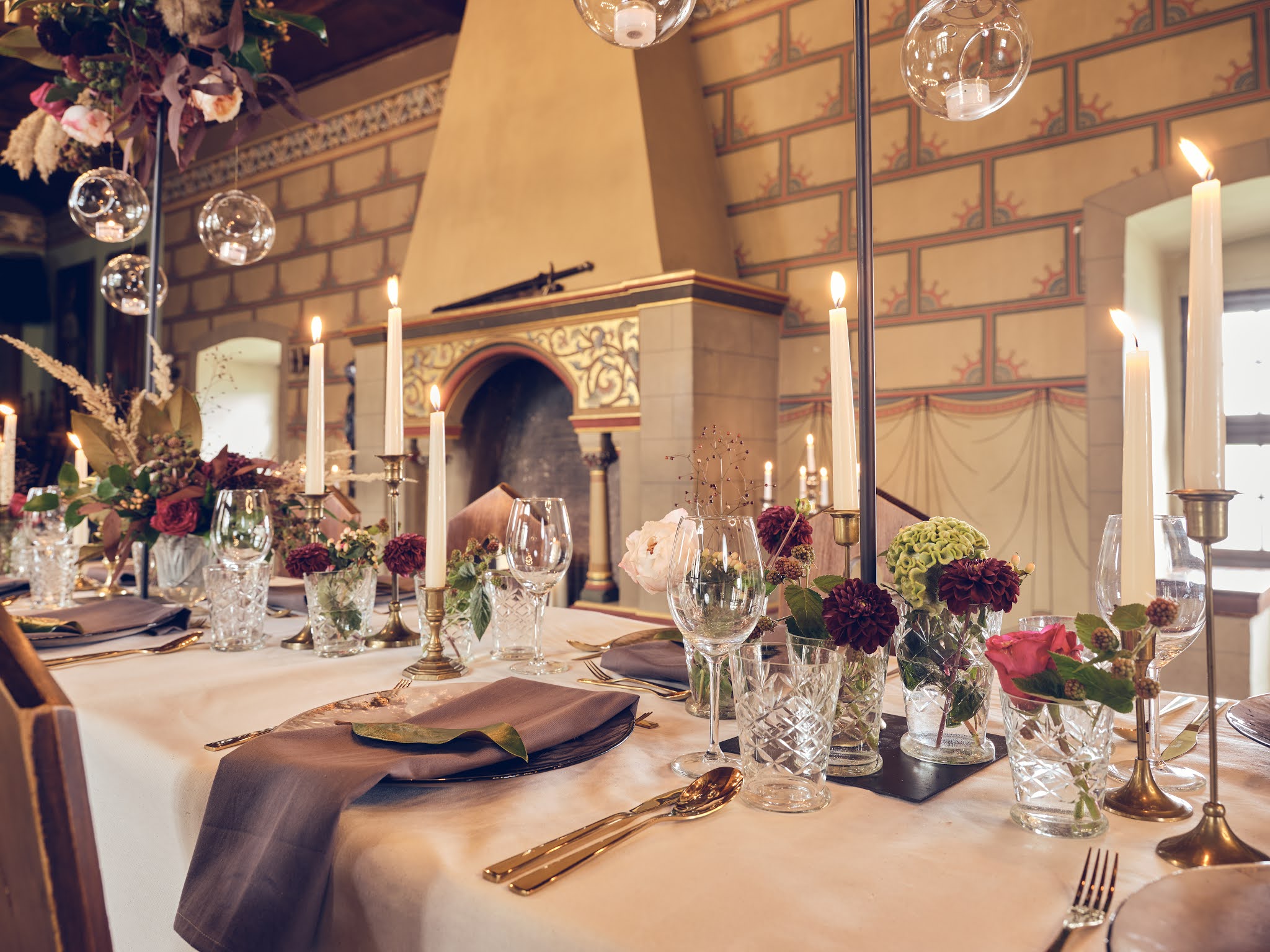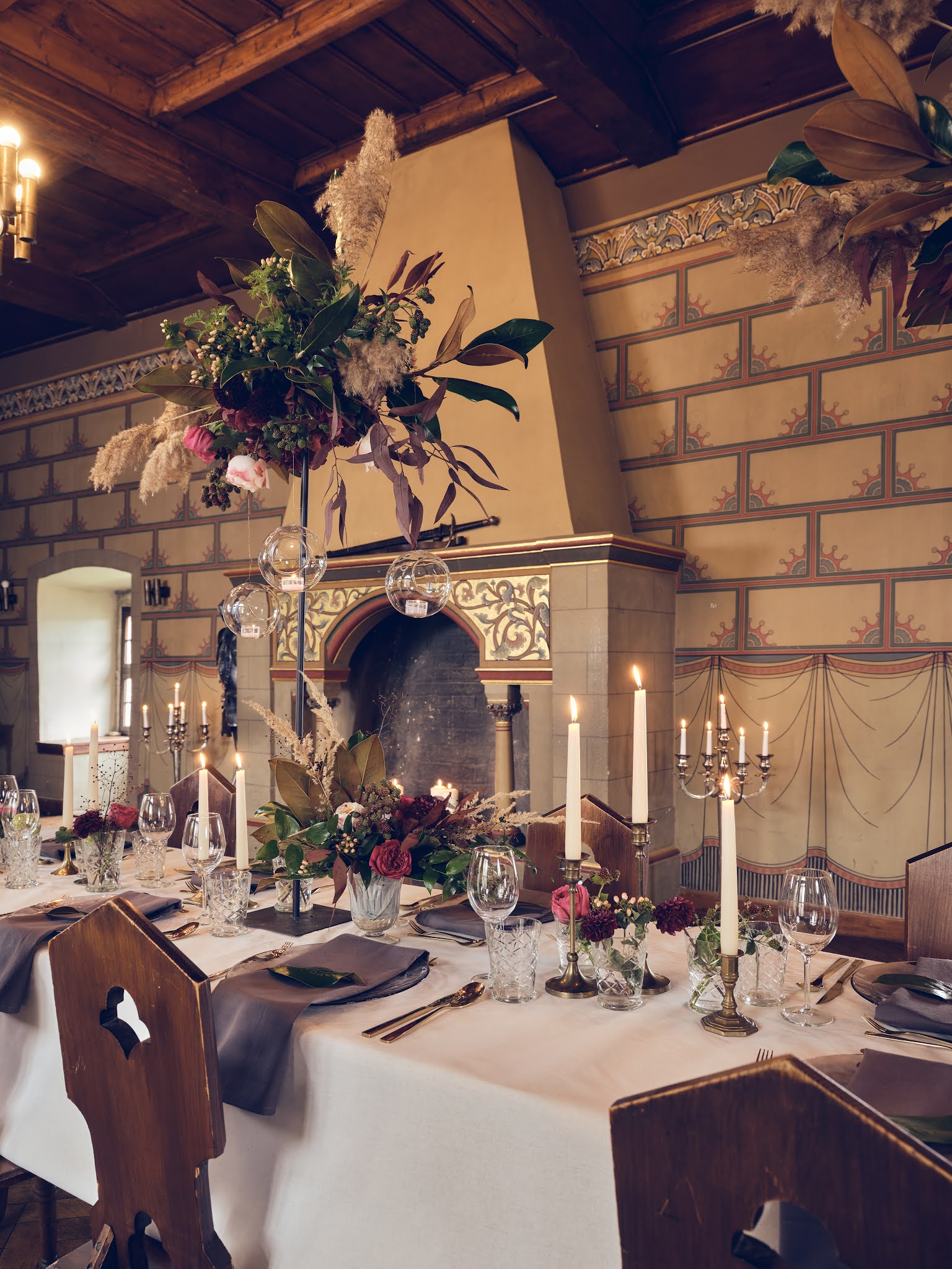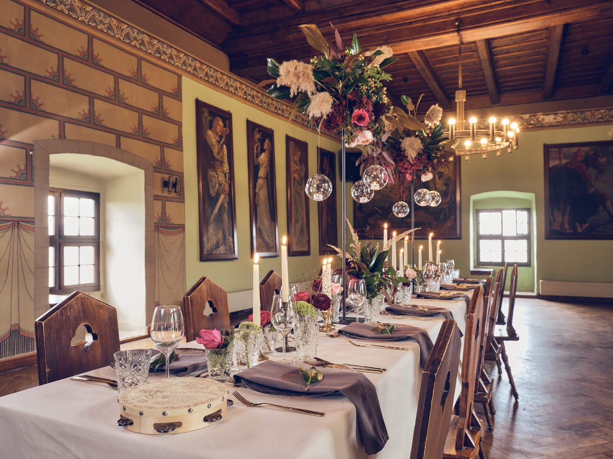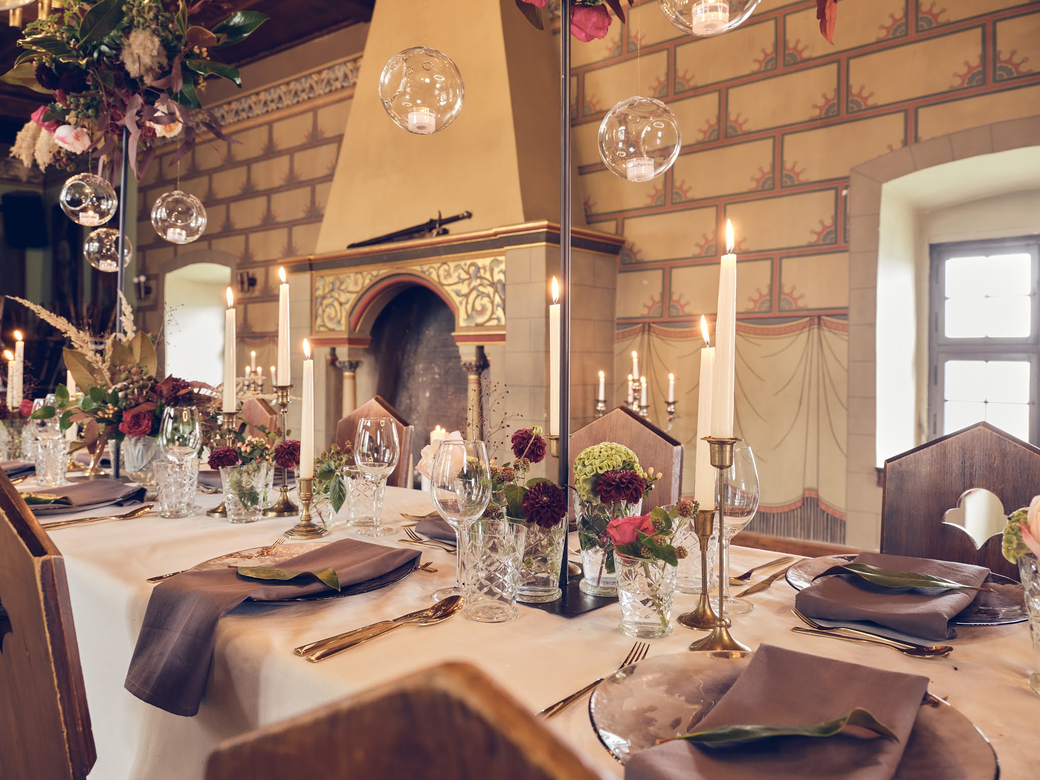 Während der Shootings wurde parallel bereits immer die nächste Szene vorbereitet, so wie hier die Tischdekoration im großen Burgsaal. Schon die Kulisse ist prädestiniert für eine Märchenhochzeit: ein großer, offener Kamin, Fenster mit Blick ins Tal und auf die Saale, Ritterrüstungen und riesige Wandgemälde mit Szenen aus der Nibelungen-Sage waren der Rahmen für die Hochzeitstafel.