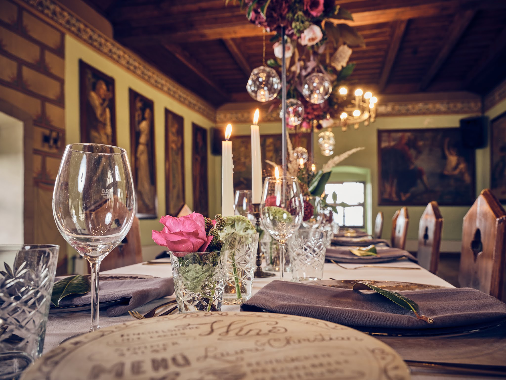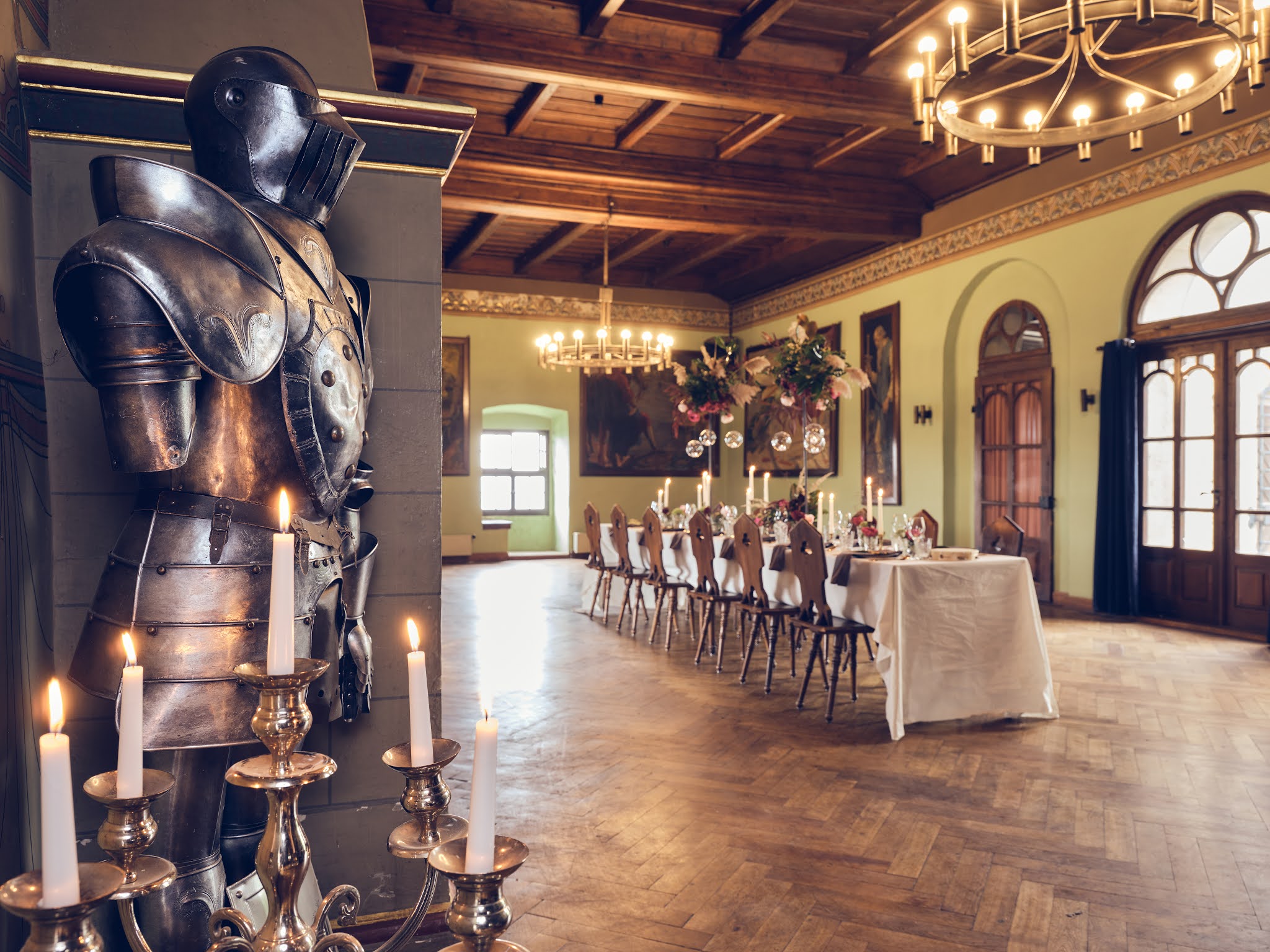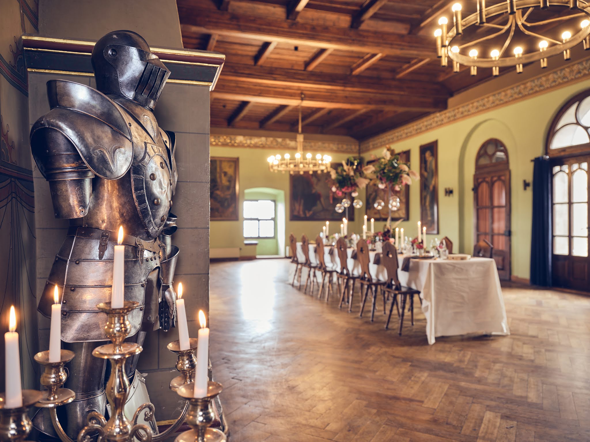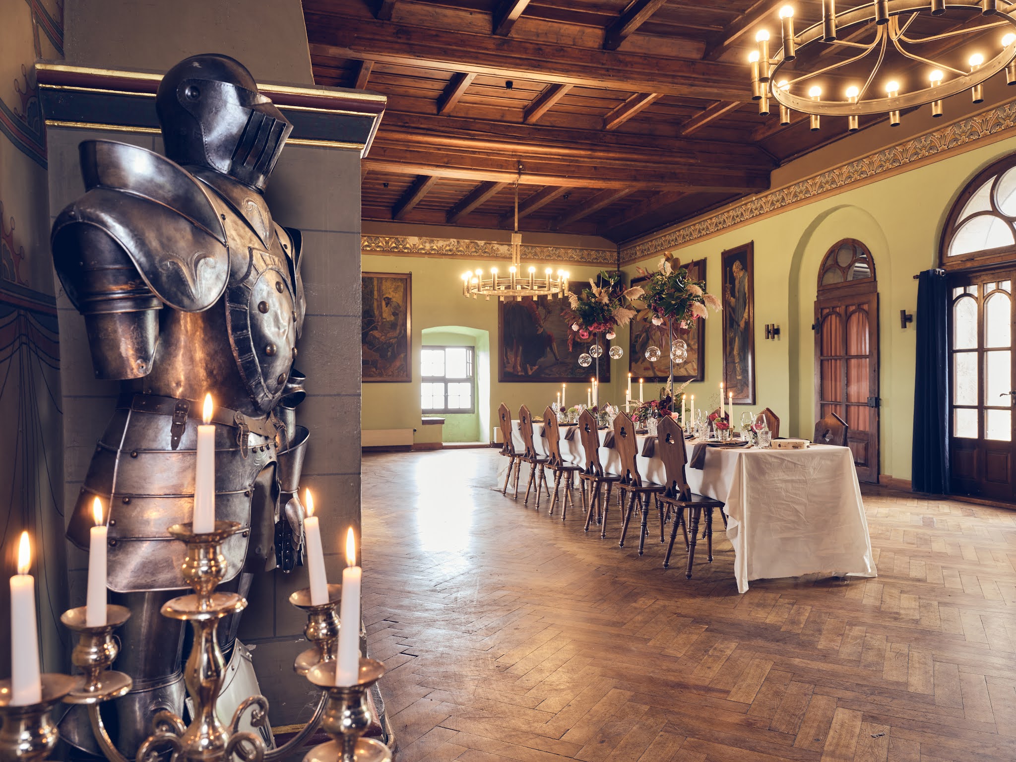 Während der Shootings wurde parallel bereits immer die nächste Szene vorbereitet, so wie hier die Tischdekoration im großen Burgsaal. Schon die Kulisse ist prädestiniert für eine Märchenhochzeit: ein großer, offener Kamin, Fenster mit Blick ins Tal und auf die Saale, Ritterrüstungen und riesige Wandgemälde mit Szenen aus der Nibelungen-Sage waren der Rahmen für die Hochzeitstafel.