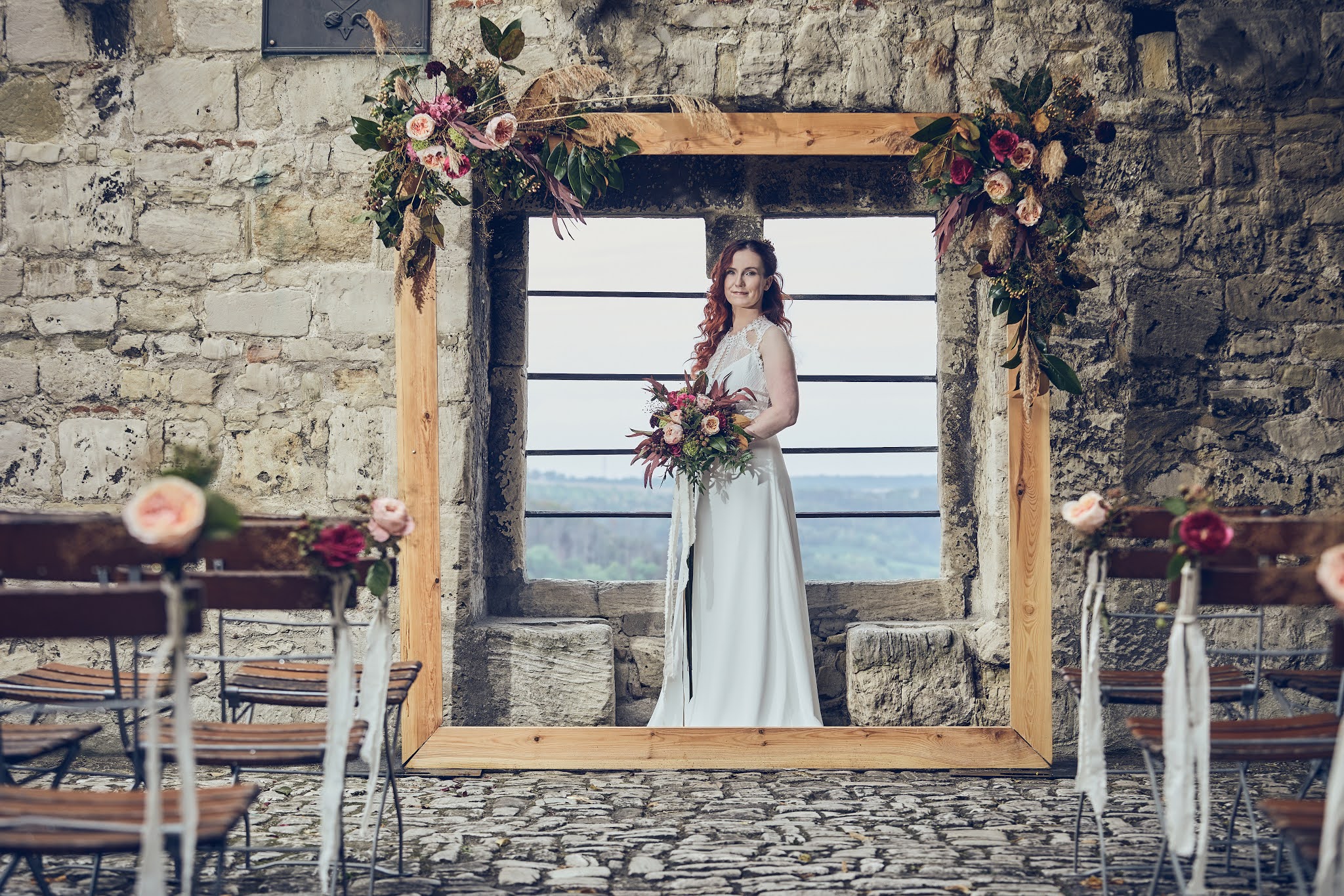 Die Dekoration für die Trauung, der überdimensionale Bilderrahmen mit den zauberhaften Blütenarrangements im Boho-Stil stammt ebenfalls von Saltoflorale. Bei den Stühlen haben wir uns, passend zur Burg, für die Holzvariante ohne Hussen entschieden und die Stühle nur mit kleinen Blüten verziert.