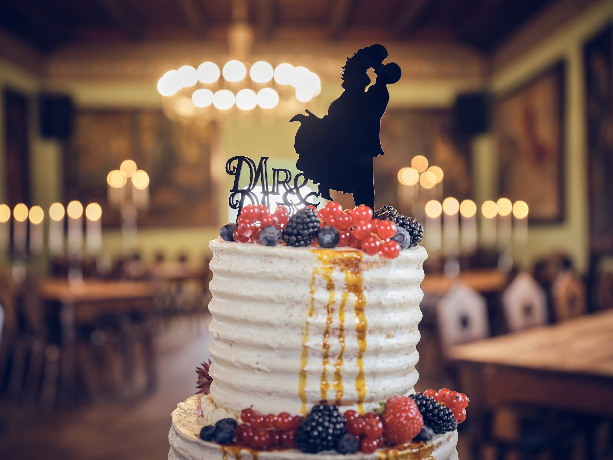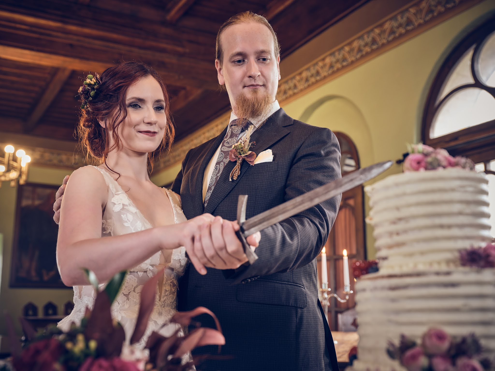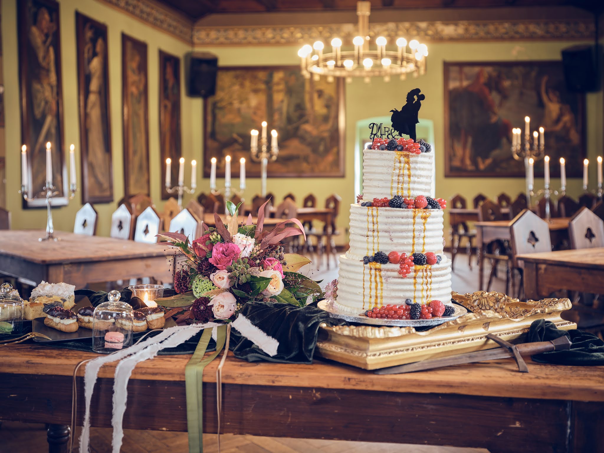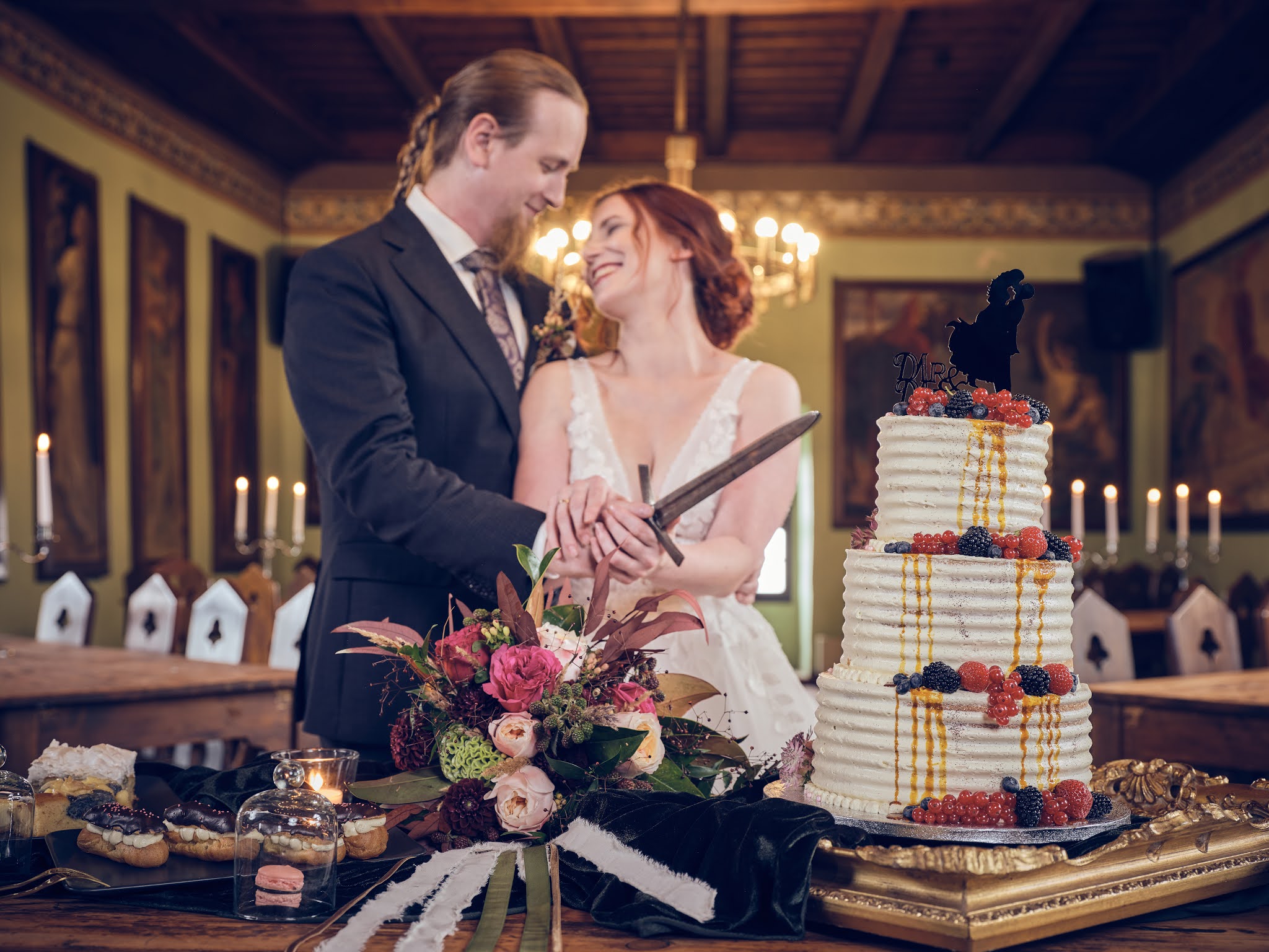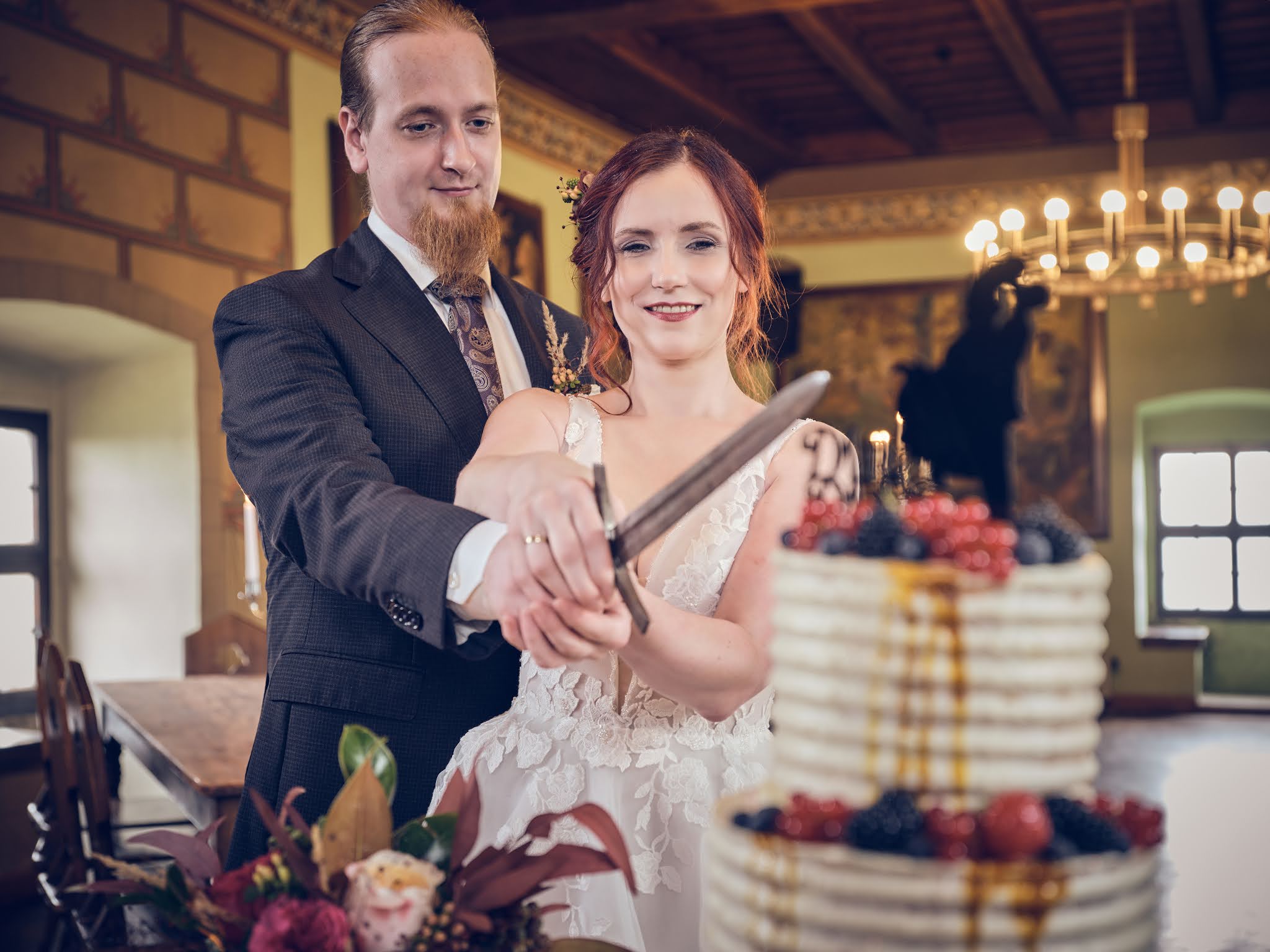 Im Rittersaal der Burg wurde dann die Hochzeitstorte (Bäckerei & Konditorei Hamdorf) fotografiert. Die Torte war nicht nur geschmacklich ein Erlebnis, sie hatte auch eine Besonderheit: zwei komplett verschieden gestaltete Seiten, quasi „zwei Hochzeitstorten“ in einer. Auf einer Seite war der Semi-Naked Cake mit frischen Beeren dekoriert, auf der anderen mit zarten Blüten. Geschmeckt haben beide ;). Dazu gab´s noch süße Teilchen, Eclairs, Macarons und Kuchenschnitten, ein kleiner Sweet Table. Und angeschnitten wurde stilecht nicht mit einem Tortenmesser sondern mit einem Schwert aus dem Fundus der Burg.