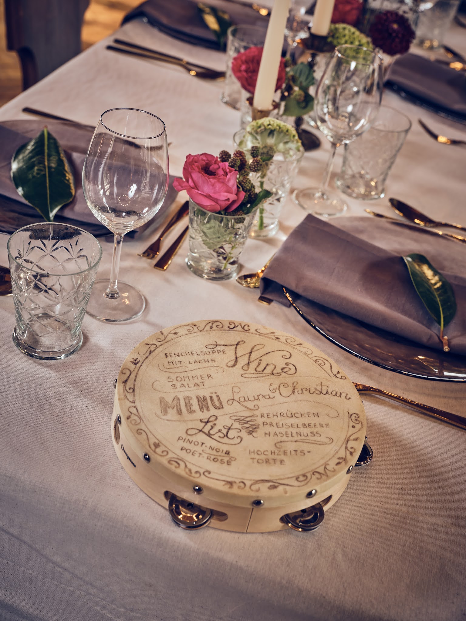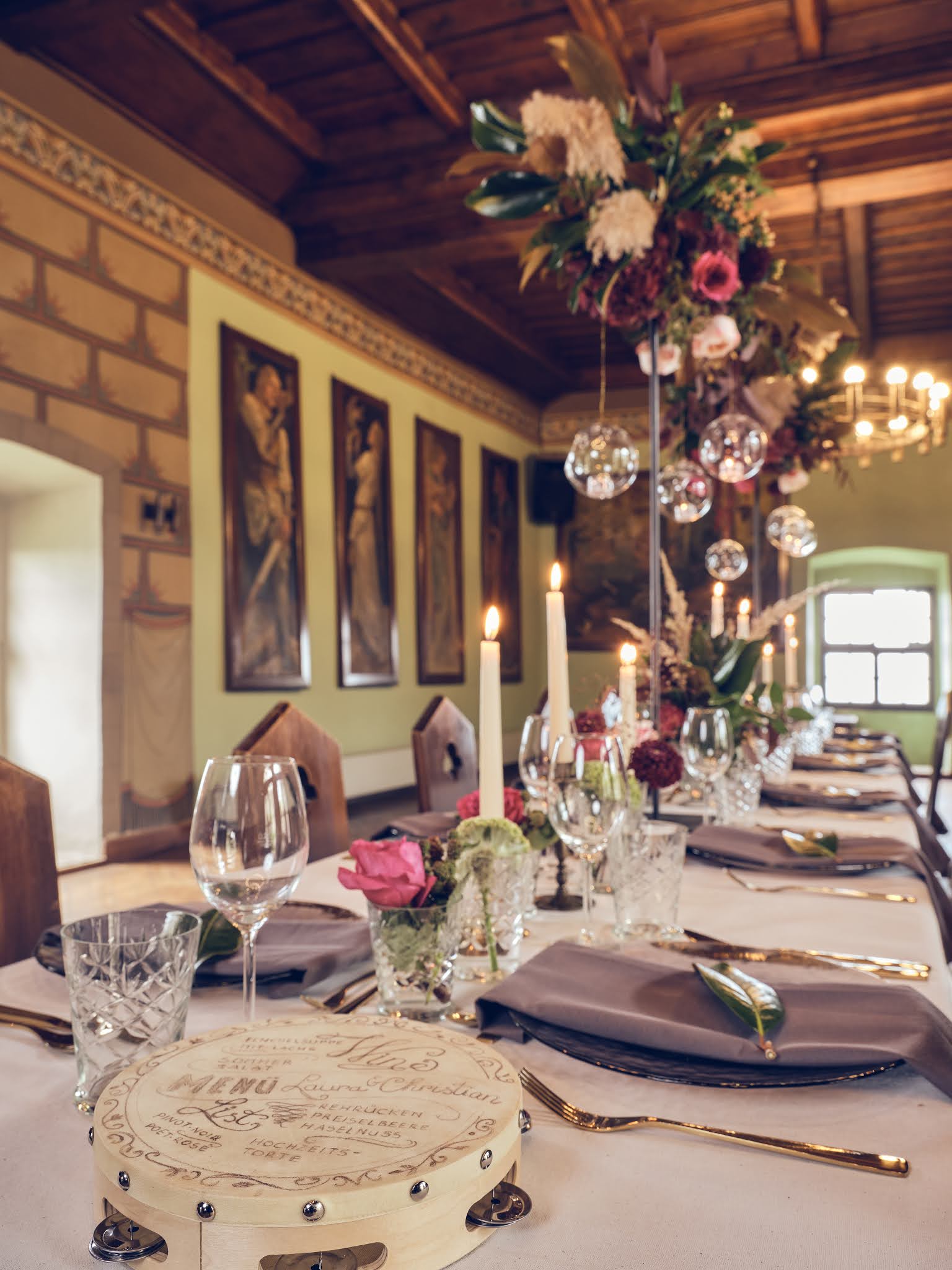 Federführend dabei war die fabelhafte Birgit von Saltoflorale aus Leizpig, die den gesamten Blumenschmuck für das Shooting lieferte und mit ihrer Tochter auch das gesamte Shooting begleitete. Cremefarbener Rupfen bildete die Grundlage für die lange Tafel, darauf wurden verschiedene Blüten in Kristallgläsern arrangiert, Highlight waren dann die hohen Ständer mit den Flowerclouds und Glaskugeln mit Teelichtern. Hier wurde Wert auf heimische Blüten gelegt, nicht nur der Aspekt der Nachhaltigkeit spielte hier wieder eine Rolle sondern auch die Liefermöglichkeiten. Covid-19 geschuldet ist es teilweise immer noch sehr schwierig, Liefergarantien für exotische Gewächse zu bekommen und wenn, dann oft zu exorbitant hohen Preisen. Hier fanden fast ausschließlich Blüten, Blätter und Gräser Verwendung, die aus der Region stammen, so zum Beispiel auch Eichenlaub und Beeren. Die rustikalen Bronze-Kerzenhalter stammen allesamt von Flohmärkten, denn auch Upcycling ist inzwischen für viele Brautpaare ein großes Thema. Das goldene Besteck und die grauen Leinenservietten sind aus dem Fundus von 4 weddings & events und die spezielle Menükarte auf einem mittelalterlichen Tamburin sowie die Beschriftung der Blätter als Namenskarten wurden von mir gemacht.