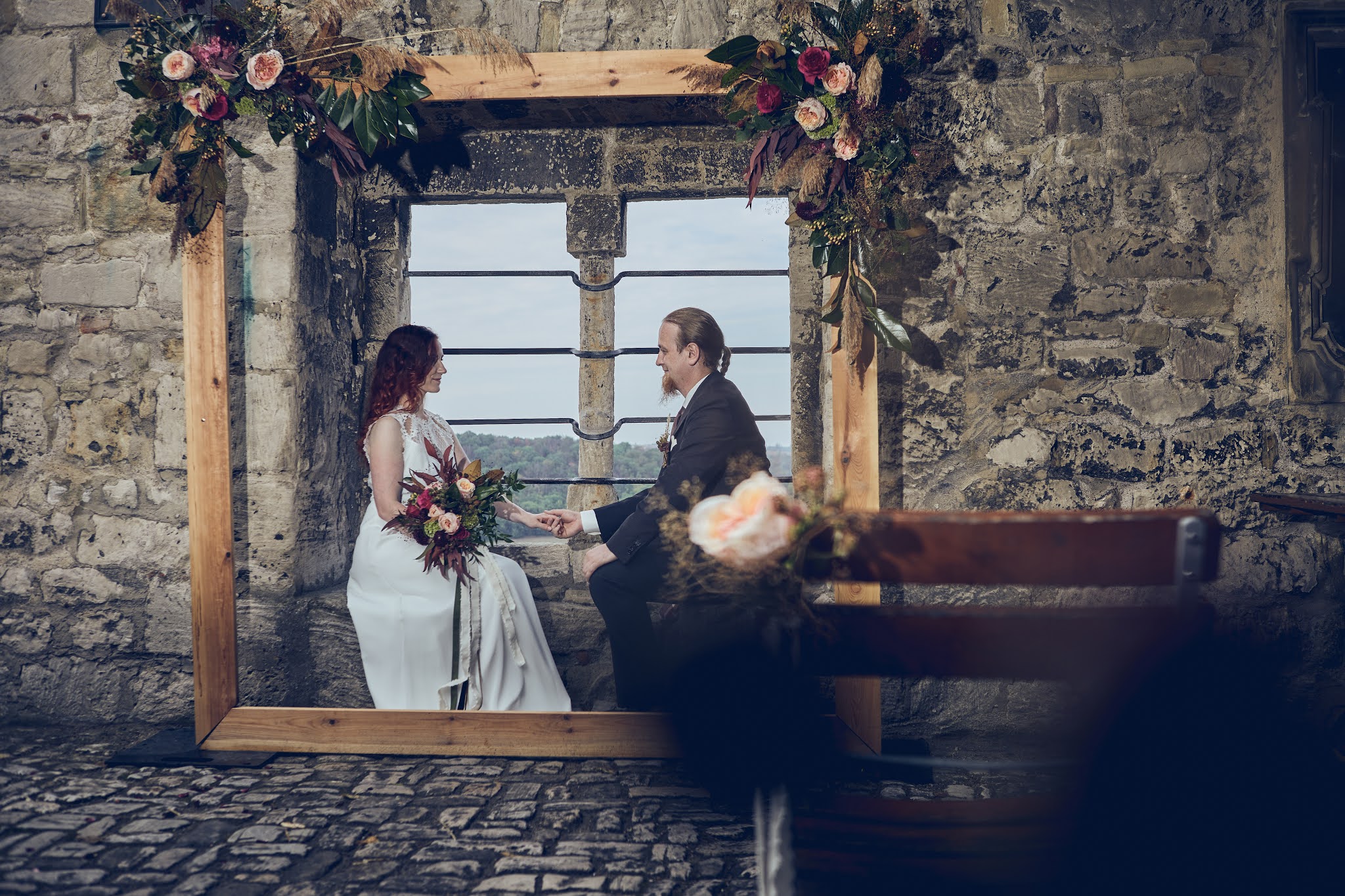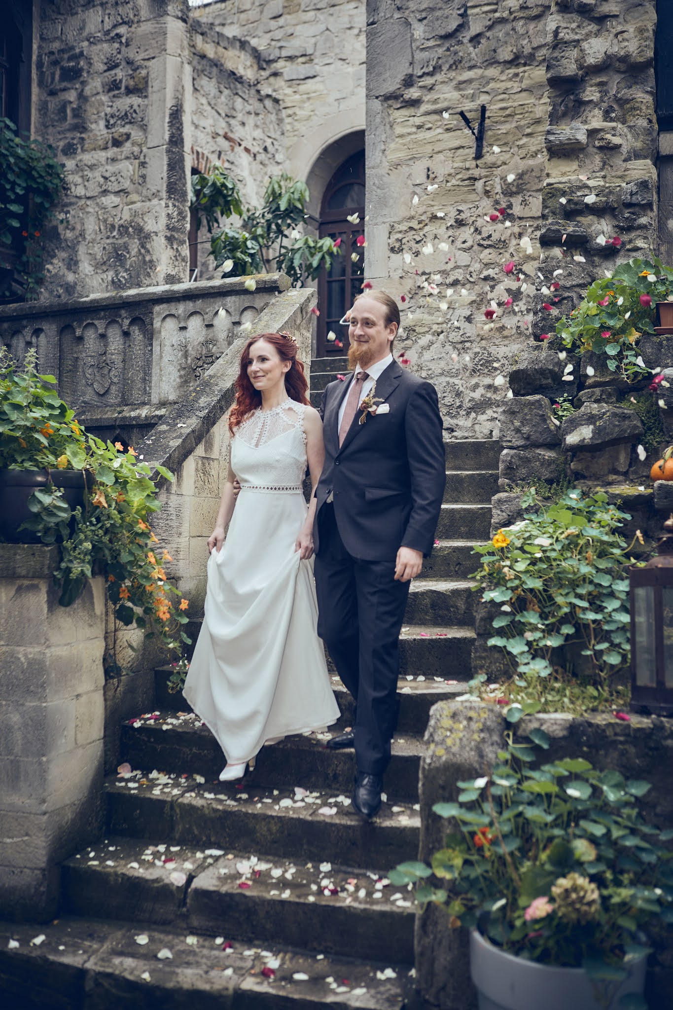 Die Rudelsburg hatte uns an Fotokulisse soviel zu bieten, dass es fast unmöglich war, all die schönen Plätze in nur zwei Tage abzulichten. Offene Kamine, Kachelofen, Alkoven, verspielte Erker mit wunderschönen alten Fenstern und traumhaftem Ausblick hinunter auf die Saale und ihr weites Tal, riesige Gemälde, Freitreppen – Burghochzeit as its best.