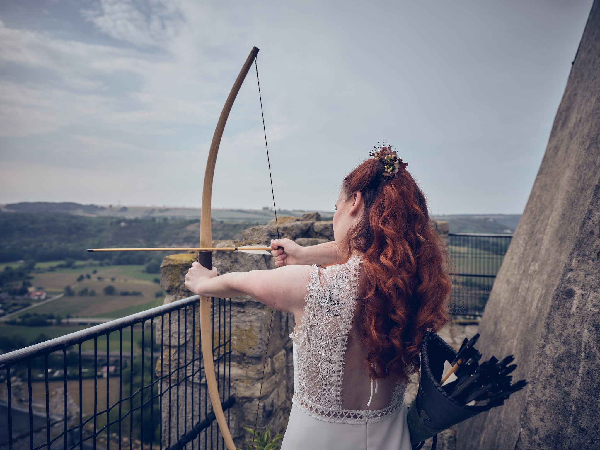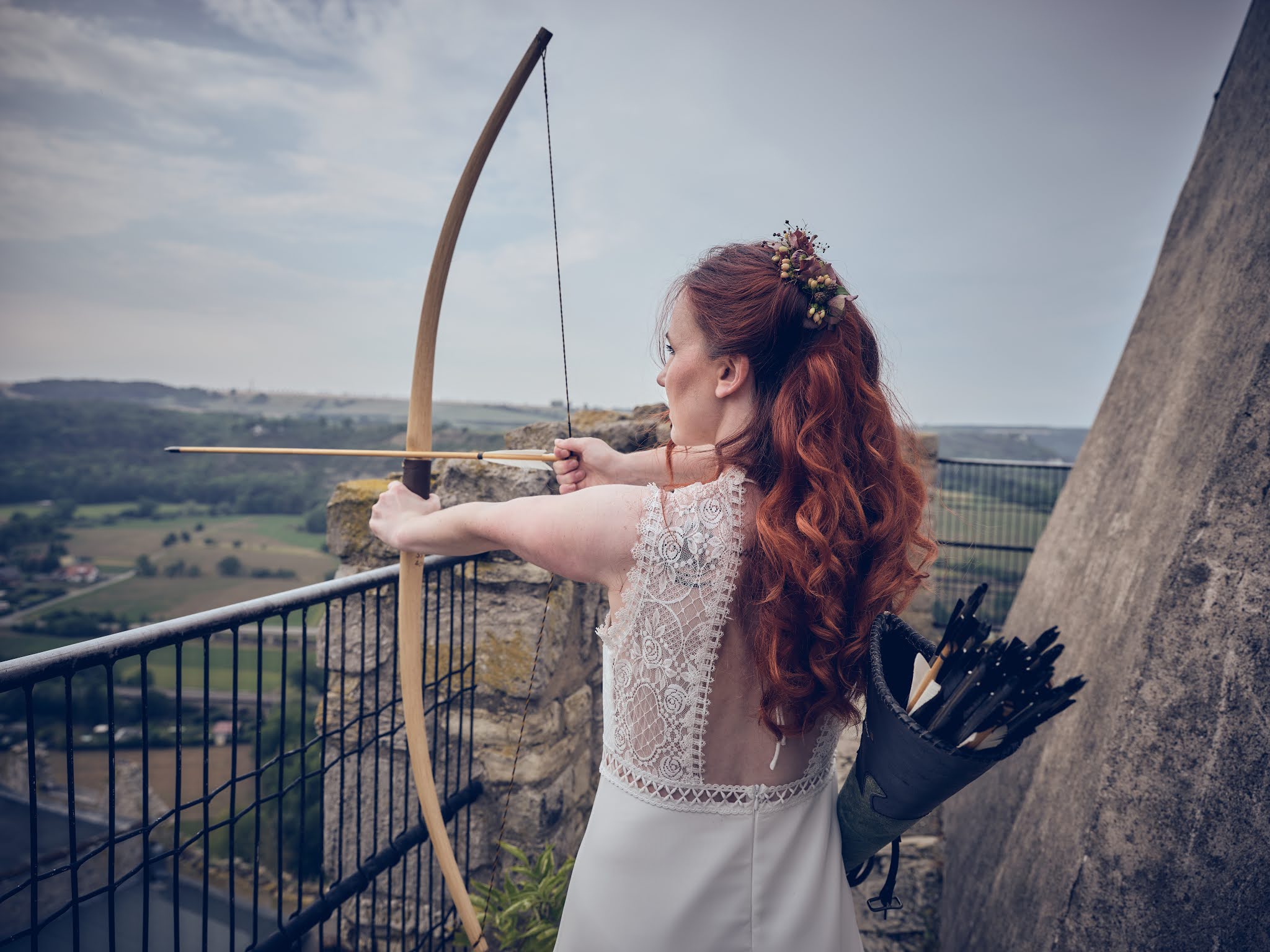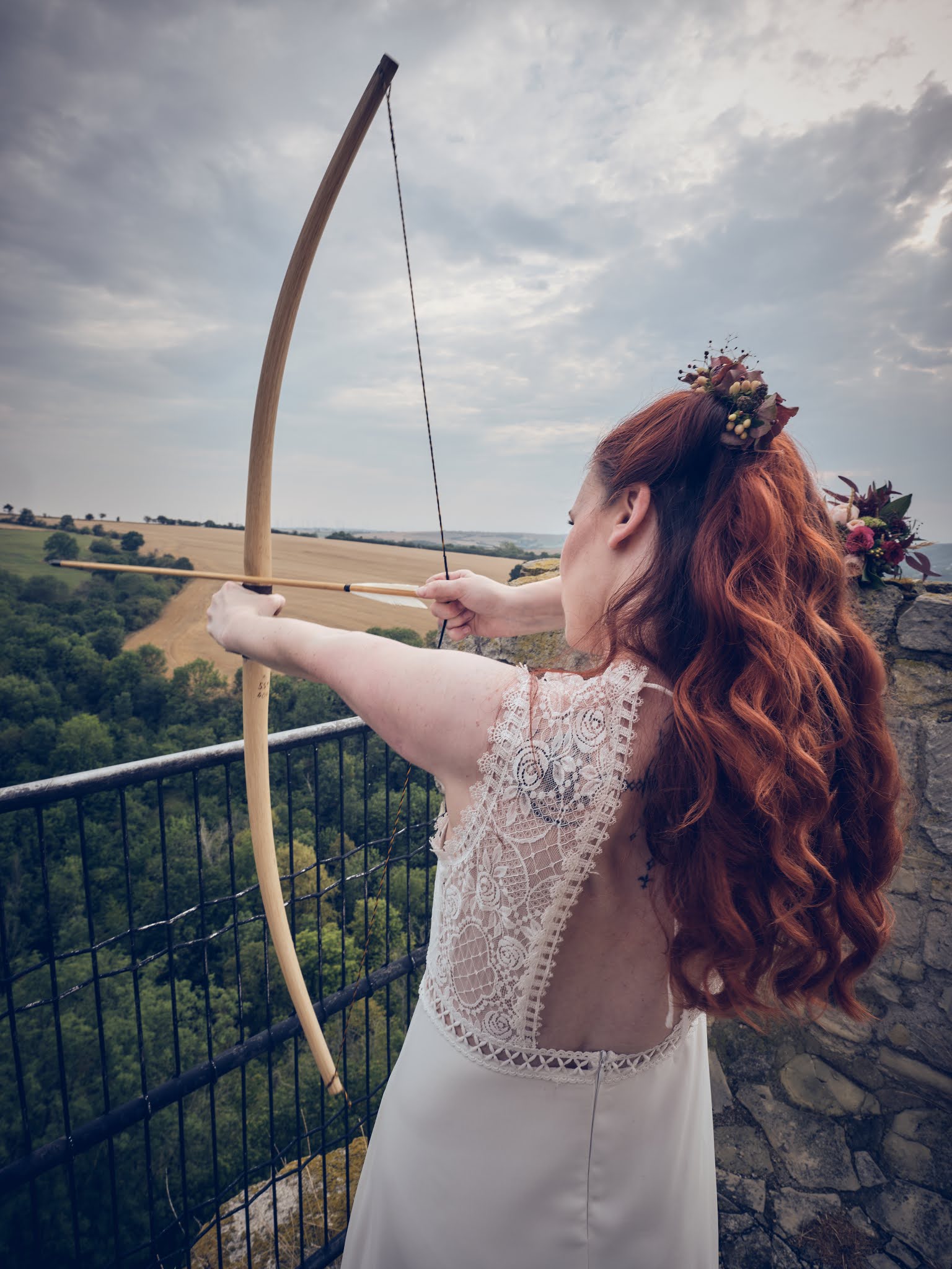 „…die Armbrust über der Schulter, aber ein Jäger ist es nicht, mein holder Herr?“ Und auch nicht drei Haselnüsse für Aschenbrödel, schon eher Highlandprinzessin Merida. Flammend rotes Haar mit Wiesenblumen geschmückt, Augen wie ein Falke und der gespannte Bogen, dazu ein märchenhaftes Brautkleid – wer würde da nicht heiraten wollen?