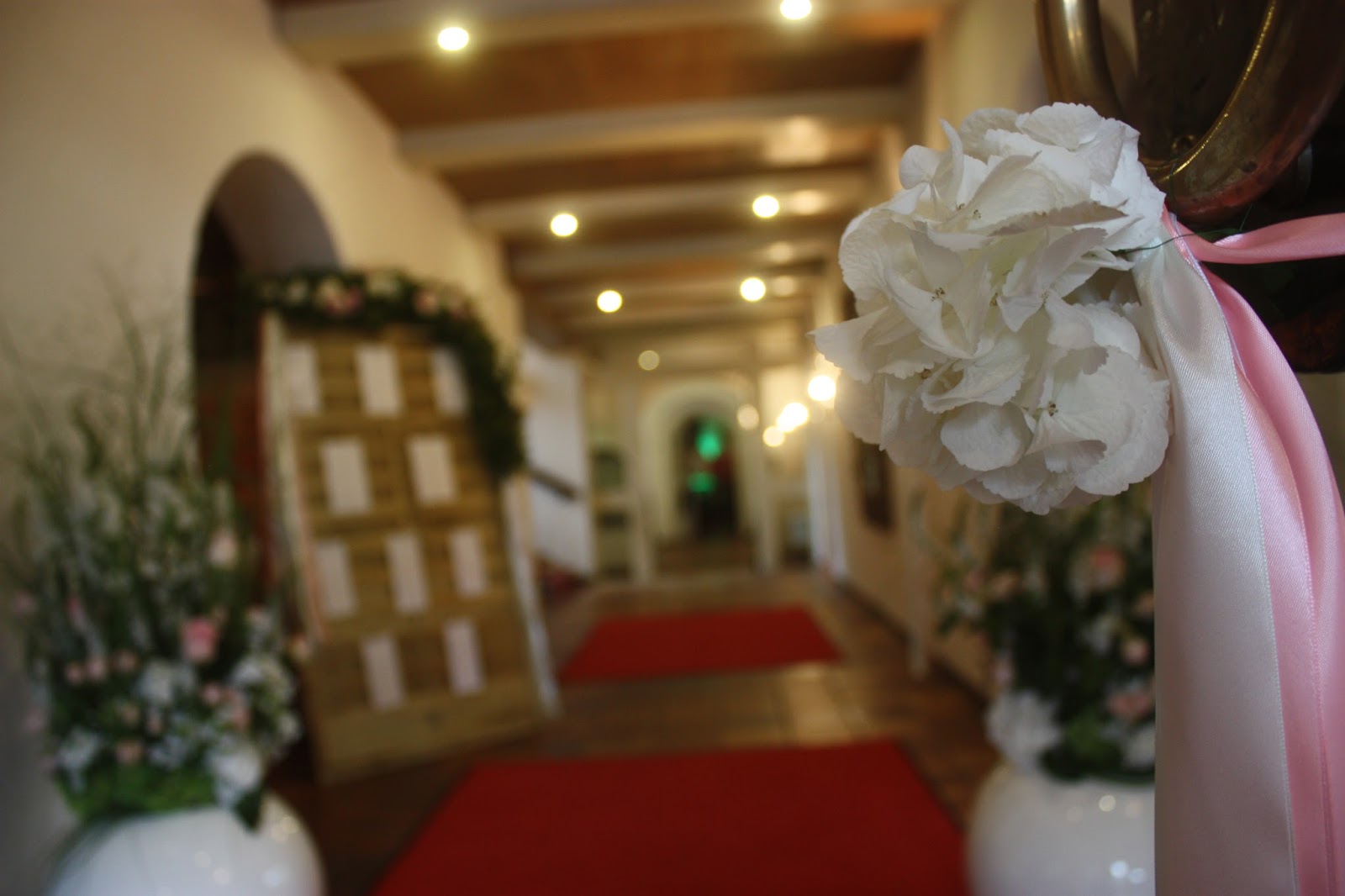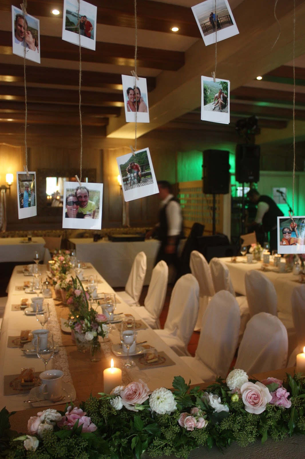 An den Korkenzieherweiden in den Rundbögen waren Fotogirlanden mit Polaroidbildern des Brautpaares aufgehängt worden. Eine tolle persönliche Note!