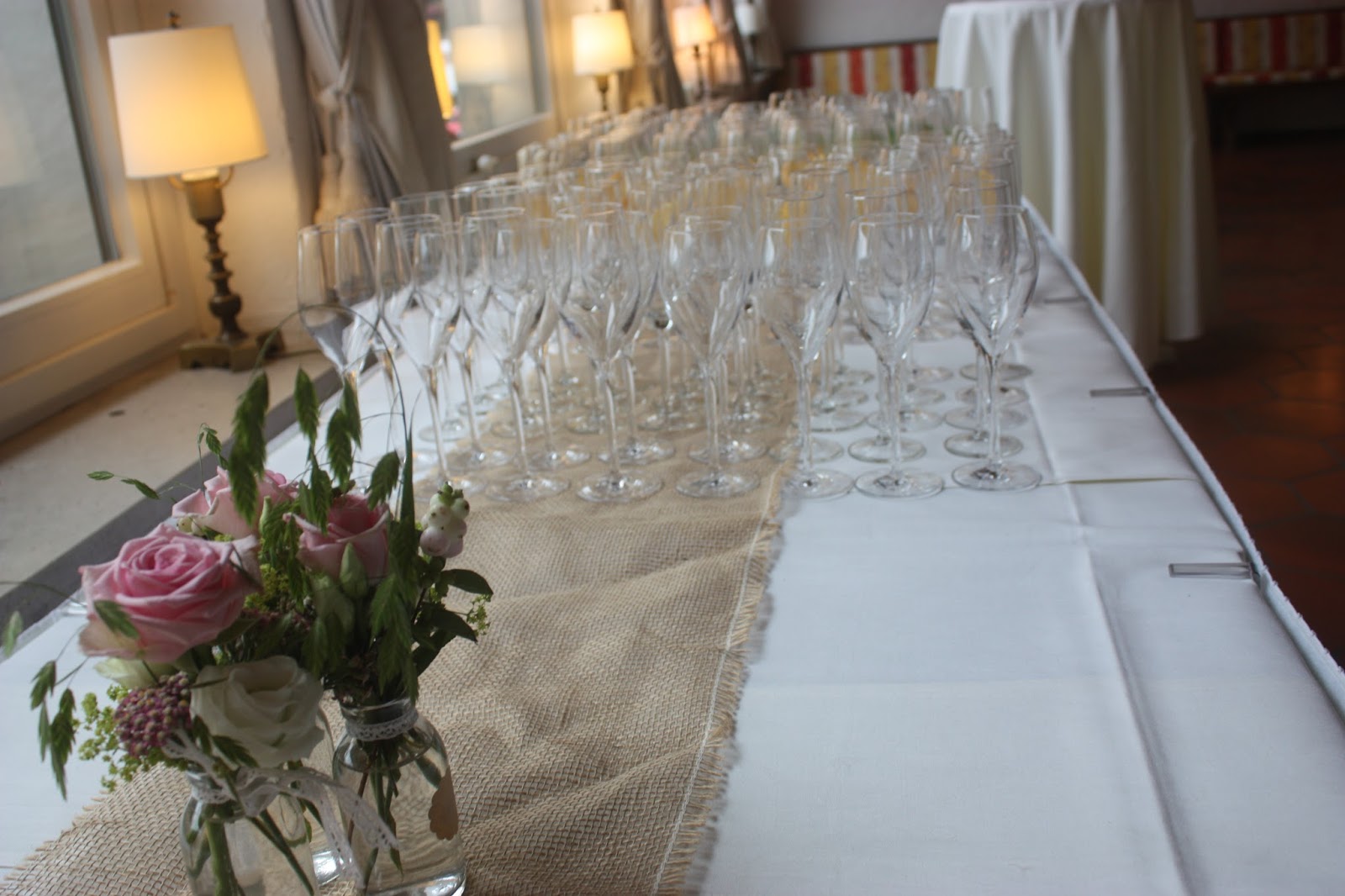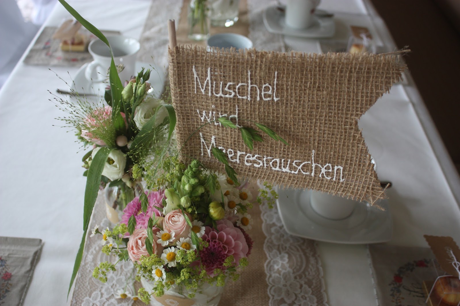 Die Tische waren mit cremefarbenen Tischdecken gedeckt, die Servietten schlicht gefaltet und obenauf die Menükarten und die Gastgeschenke – ein hübsch verpackter Mini-Guglhupf mit Namensschild. Die Tischläufer waren aus Sackleinen mit Spitzenrändern und Passiflori hatte für den Blumenschmuck für jeden Tisch ein üppiges Konglomerat aus Gläsern und Fläschchen mit pastellfarbenen Blüten und Gräsern im Vintage-Look gezaubert, die teilweise mit Spitzenband verziert waren. Statt Nummern gab es für die Tische Namen passend zum Thema „aus M wird M“ und so hießen die Tische also beispielsweise „Mehl wird Muffin“, „Melodie wird Musik“ oder „Muschel wird Meeresrauschen“. Die Vintage-Tischfähnchen aus Jute-Stoff waren mit viel Liebe zum Detail handbestickt.