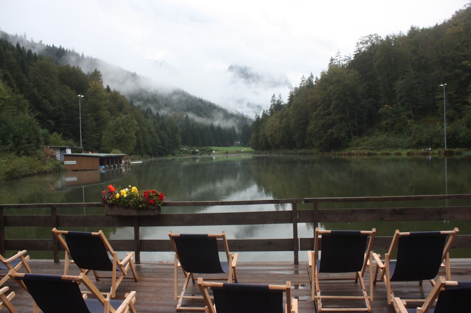 Der Hochzeitsempfang mit einem Fass Bier, kalten Getränken und bayerischen Snacks wie Schmalz- und Schnittlauchbroten und auch etwas für die „G´schleckerten“ wie Himbeertörtchen und Blätterteiggebck, fand dann im Kaminzimmer statt, bevor es zum Kaffee trinken und dem Anschnitt der Hochzeitstorte ins Seerestaurant ging. Geplant war das Ganze eigentlich auf der Terrasse, aber die anhaltenden Regenfälle und die Kälte – oben im Wetterstein schneite es – ließen es drinnen doch wesentlich gemütlicher sein. Die ursprünglich für die Terrasse geplanten Liegestühle wurden teilweise am Kamin platziert und mit einem kuscheligen Lammfell konnte man hier „Feierpausen“ einlegen und einfach ein bisschen chillen…