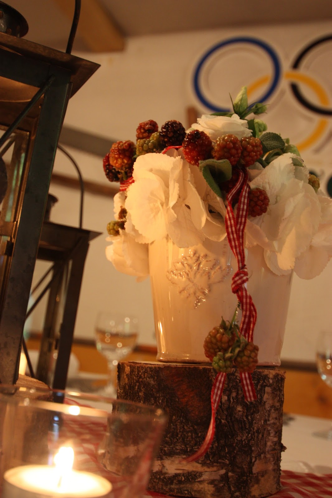 Wer also „richtig rustikal“ feiern möchte, der ist in der Bob-Kantine genau richtig. Dem Inneren der Hütte hatten wir aber dann doch mit Dekorations-Elementen einen etwas feinere Note gegeben, denn zu derb sollte es dann doch nicht sein. So gab es weiße Tischdecken mit rot-weiß karierten Auflegern und die weißen Stoffservietten waren ebenfalls mit rot-weiß karierten Bändern zusammengebunden. Auf Baumstamm-Scheiben standen schwarze Eisenlaternen mit dicken Stumpen-Kerzen und die Blumendekoration von Passiflori war in weißen Relief-Steingutgefässen. Herrliche weiße Hortensien, kombiniert mit frischen Brombeeren bildeten einen tollen Kontrast zu den karierten Tischdecken und fügten sich trotzdem perfekt in das Gesamtbild ein.