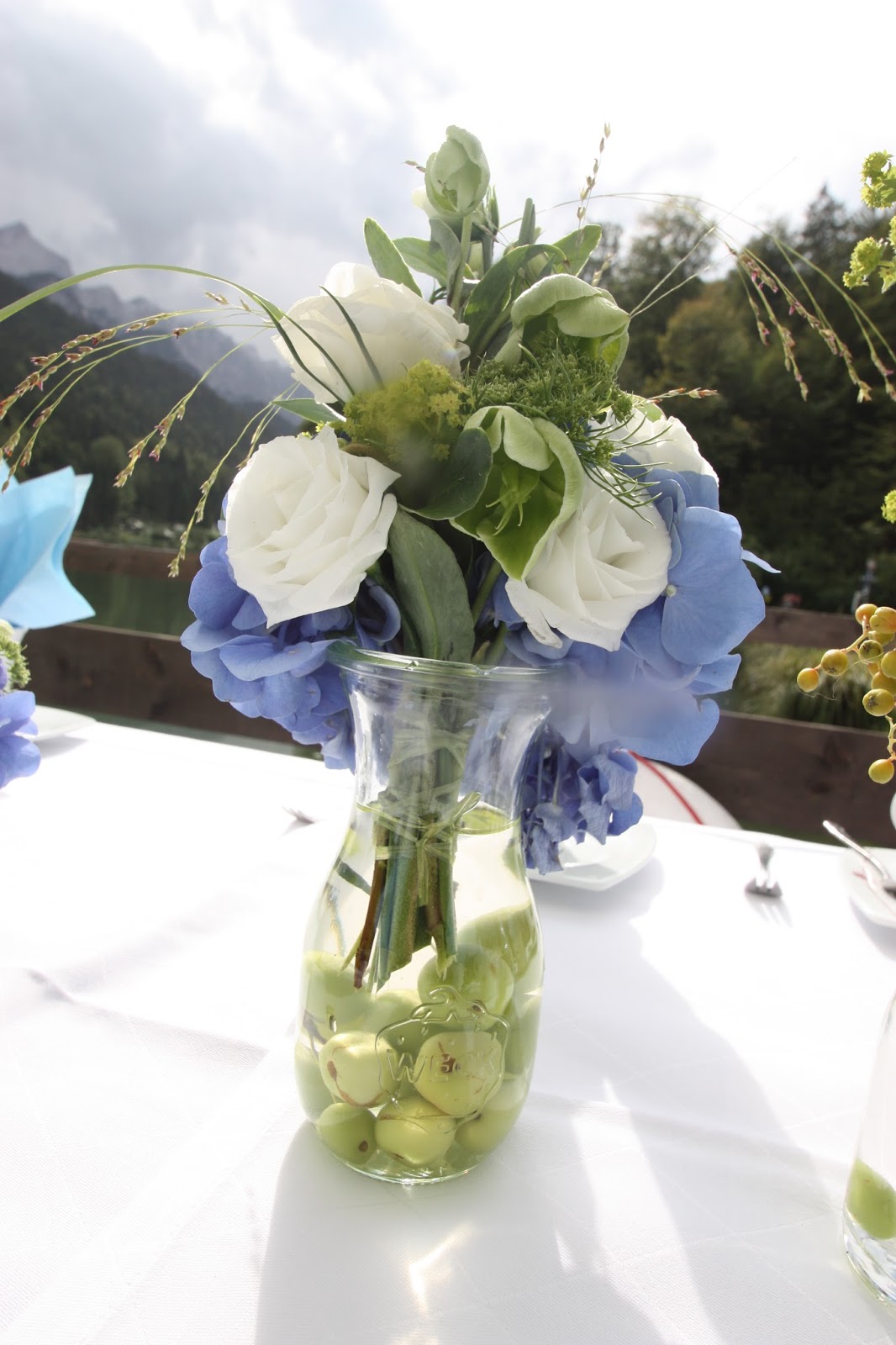 Während dem Empfang wurde das Floss von uns in Windeseile umgebaut und für Kaffee und Kuchen eingedeckt. Weiße Tischwäsche, zauberhafte Blumen-Arrangements in kleinen Glasgefäßen mit Spitzenband, grünen Äpfelchen, blauen Hortensien und weißen Blüten von Passiflori und himmelblaue Servietten zierten die Kaffee-Tische.