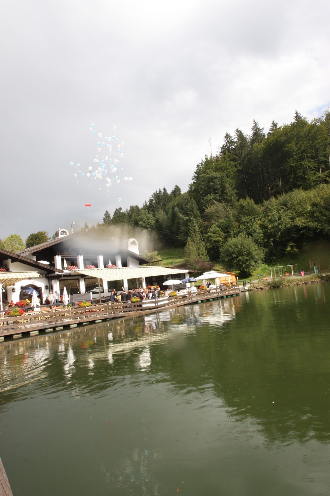 Als das Floss nach ca. 45 Minuten wieder anlegte, begab man sich zum Anstossen und Gratulieren auf die See-Terrasse. Freunde des Brautpaares hatten Ballons in Himmelblau und Weiß vorbereitet, für das Brautpaar selbst gab es – in Anlehnung an den Brautstrauß – erdbeer-rote Herzballons.