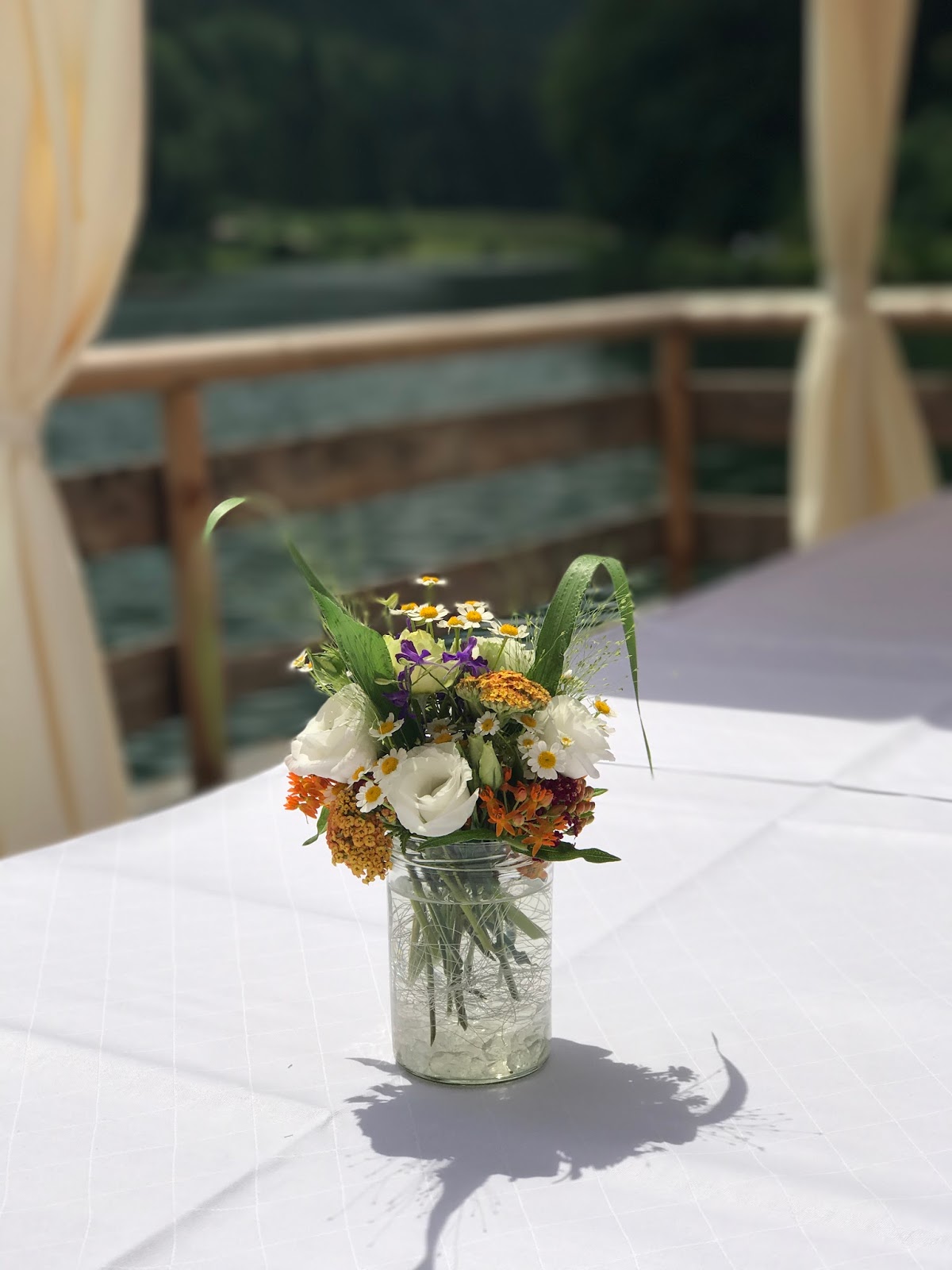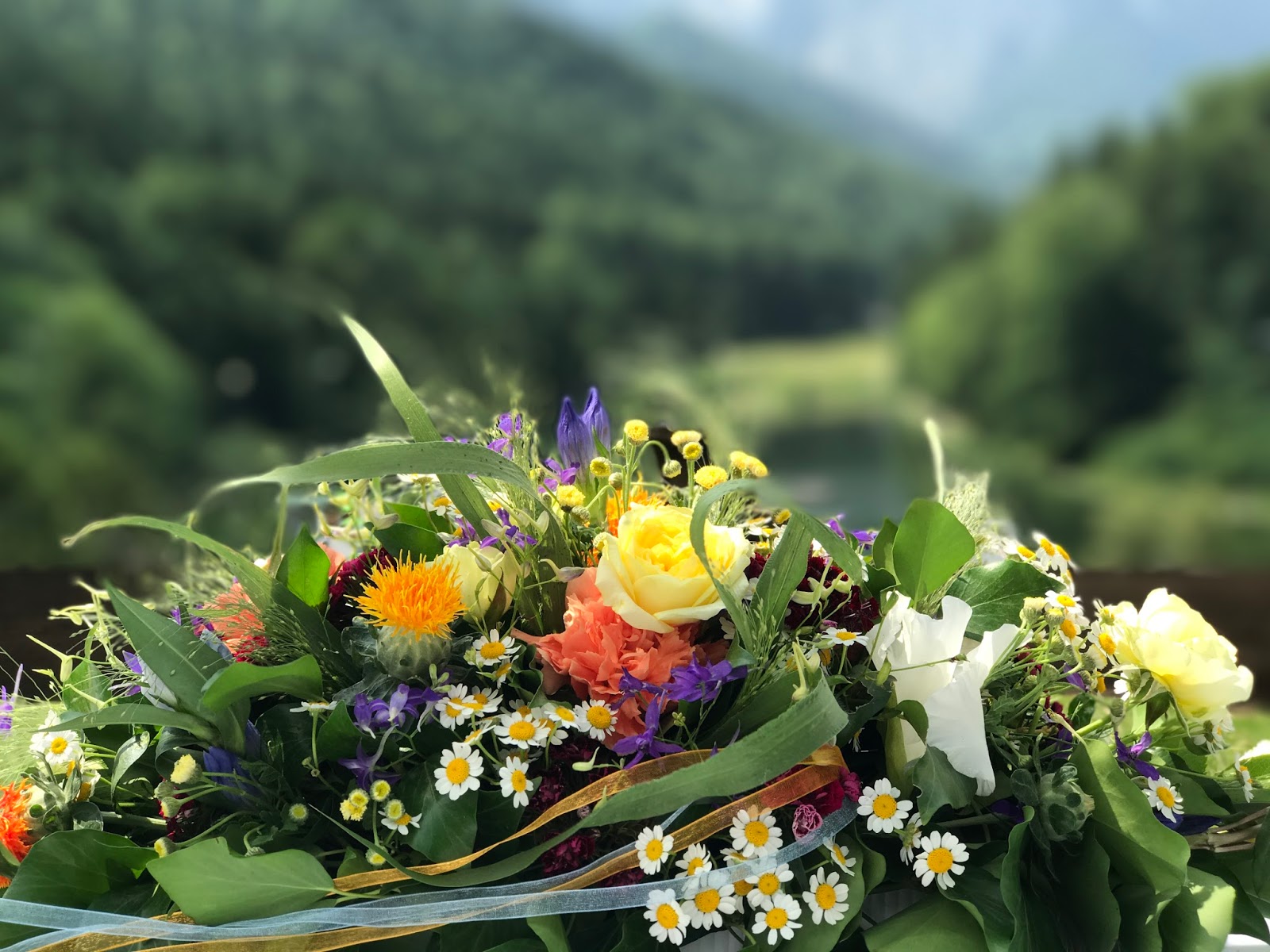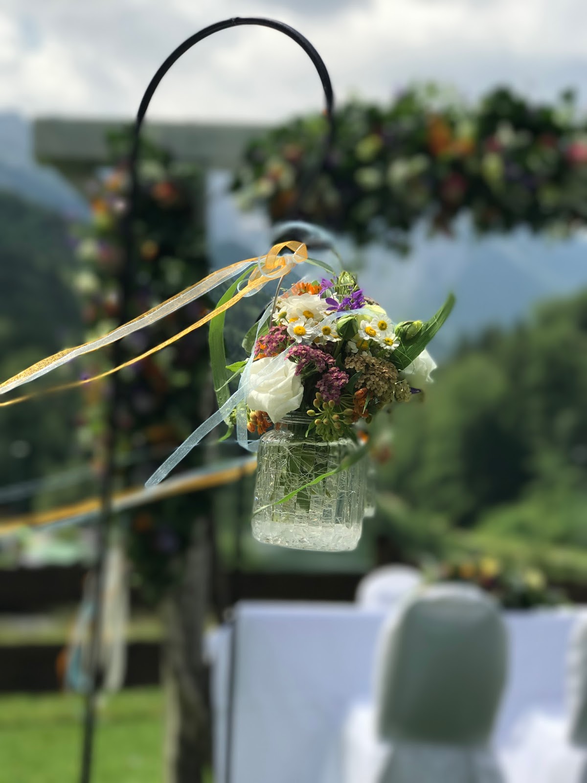 Das „Tor zu den Bergen“ war von Passiflori üppig mit bunten Wiesensommerblumen bestückt worden und entlang des Altarwegs hingen Blumen-gefüllte Gläser mit bunten Bändern, die im Sommerwind wehten. Auch auf dem Altar fand noch ein sommerliches Blumenbouquet seinen Platz. Auf einen Teppich war diesmal verzichtet worden, da es ganz natürlich sein sollte – und was hat mehr Natur zu bieten als sattgrünes Wiesengras?