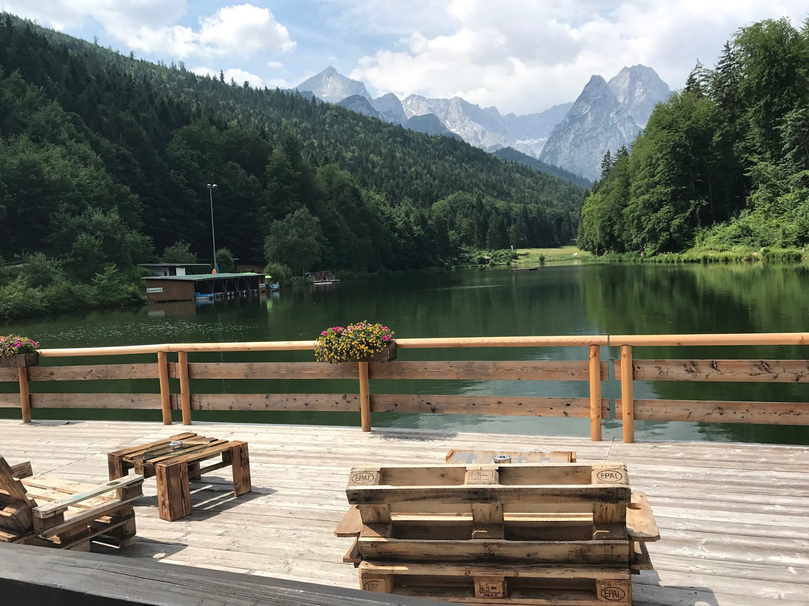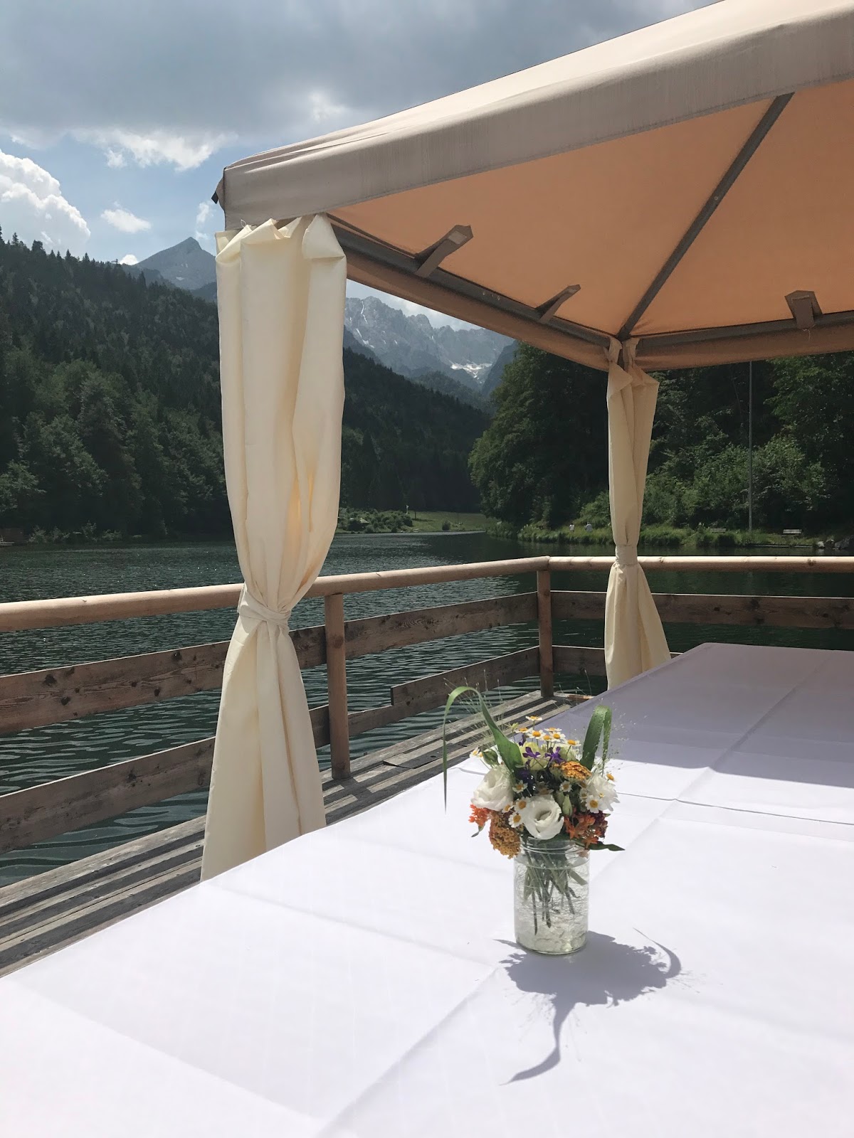 Der Riessersee und Garmisch-Partenkirchen boten die perfekte Kulisse für den Hochzeitstag, tiefblauer Sommerhimmel, Bergpanorama und ein glitzernder See – einfach wunderschön. Zwar zogen gegen Mittag ein paar Wolken auf, aber für die kleine Hochzeitsgesellschaft war das angenehm, denn dadurch war es während der Trauung nicht so heiß.