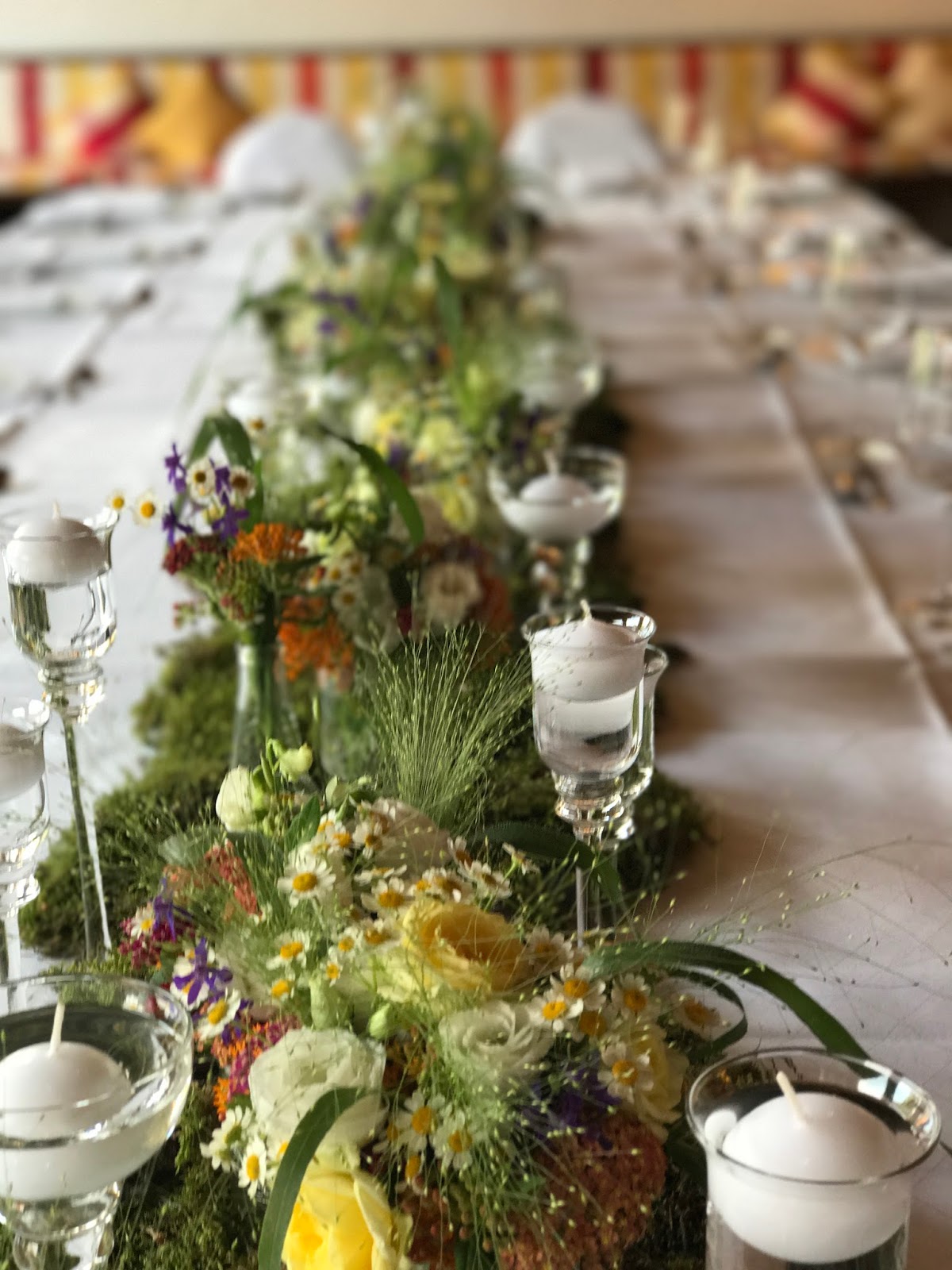 Die Tafel für das Hochzeitsessen war in weiß gedeckt. In der Mitte gab es ein breites Moosband mit Schwemmholzstücken, dazwischen viele kleine, bunte Blumenarrangements und Stielgläser mit weißen Schwimmkerzen.