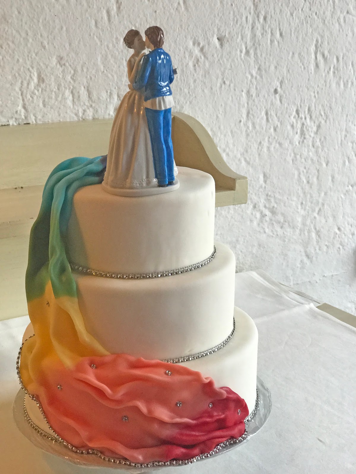 Die Hochzeitstorte war dann ein Regenbogen-Kunstwerk der Konditorei Krönner Garmisch-Partenkirchen. Die Basis dreistöckig und schlicht weiß, darüber drapiert ein – essbares! – Tuch in Regenbogenfarben, außerdem kleine Strassbänder für das richige Funkeln. Gefüllt war das Meisterwerk mit dreierlei Schokoladen (weiß, Vollmilch, feinherb) mit jeweils frischen Beeren.