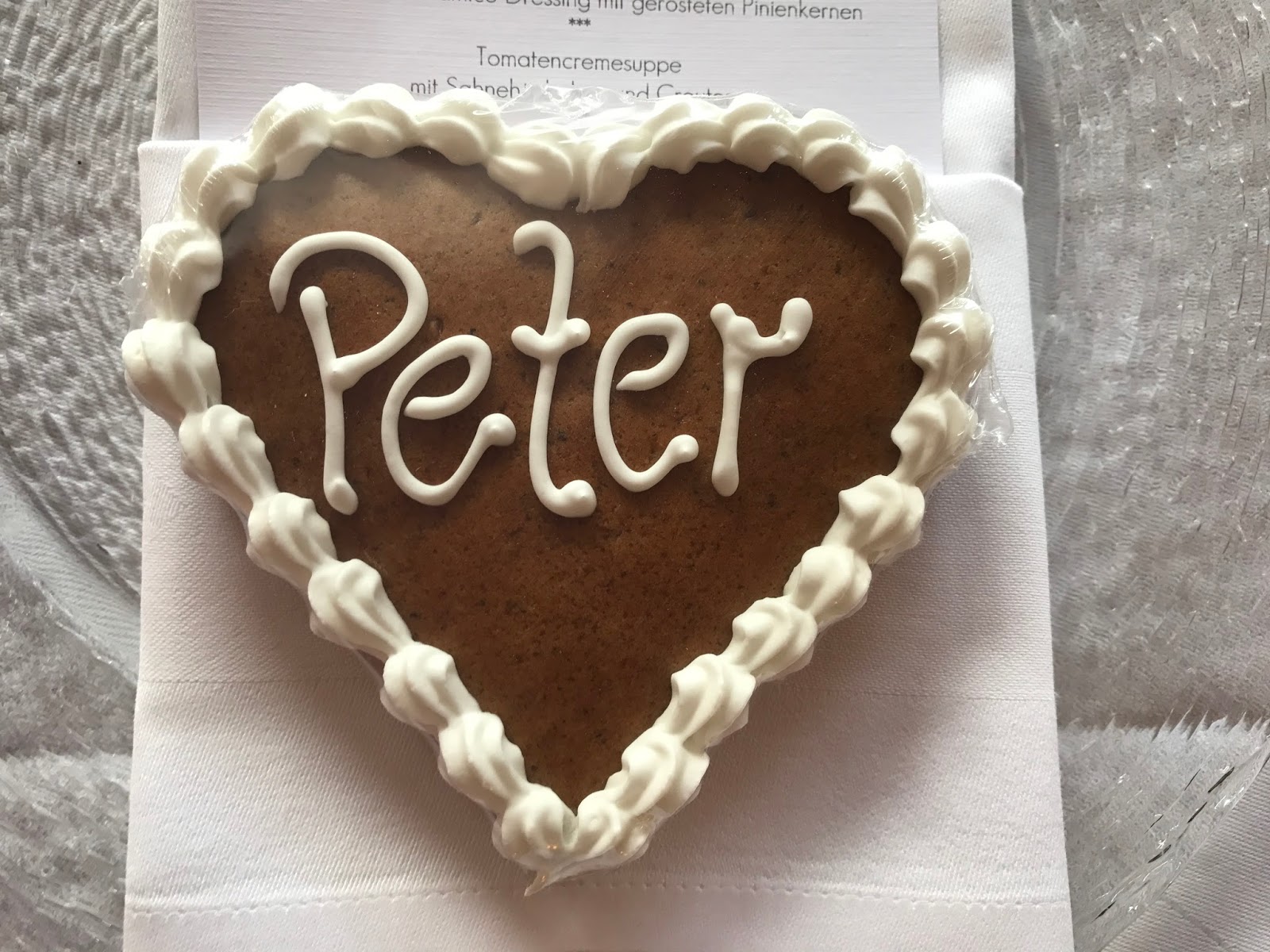 Die Servietten waren zu Taschen gefaltet, in die die Menükarten (Strukturpapier, die Kartenmacherei) mit dem komplett vegetarischen Hochzeitsmenü gelegt wurden. Darauf wurden als Namenskarten weiß verzierte Lebkuchen-Herzen platziert, ebenfalls von der Konditorei Krönner.