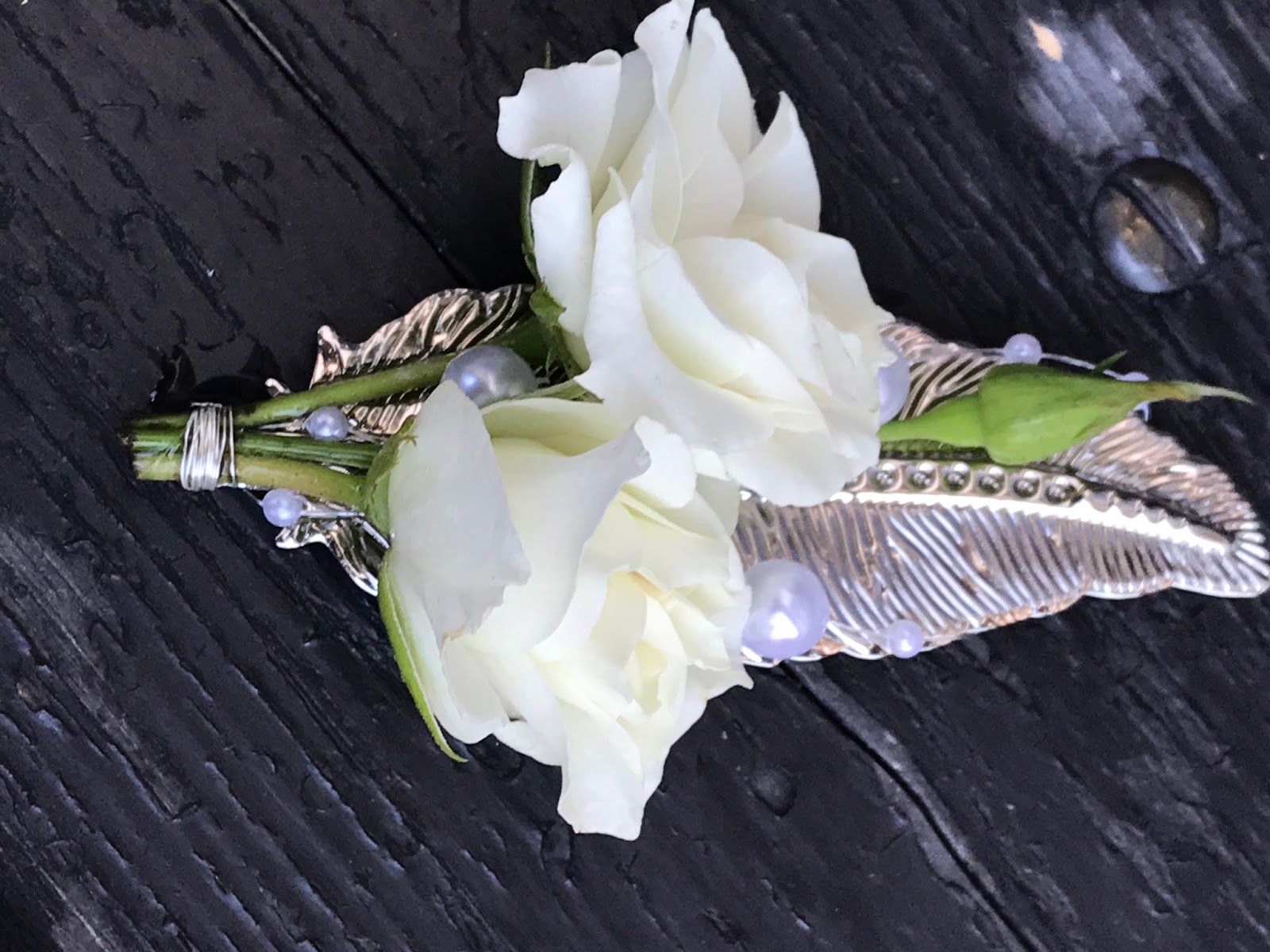 Nach dem Brautstyling in der Riessersee-Suite im Seehaus durch Lex Hair wurde der Brautstrauß überreicht. Passiflori hatte gemäß dem Wunsch der Braut in den weißen Rosenstrauß ein Broschenband eingearbeitet und auch die Anstecker für Bräutigam und Sohn waren passend gestaltet.