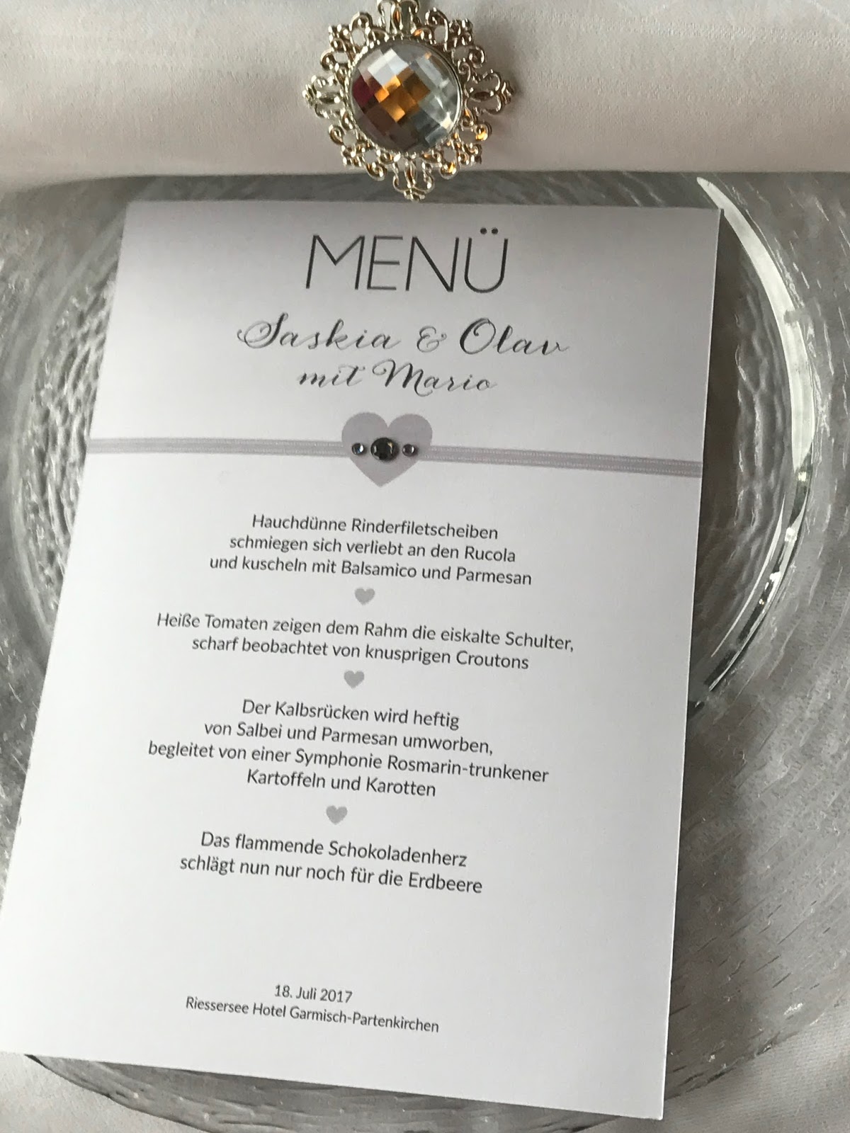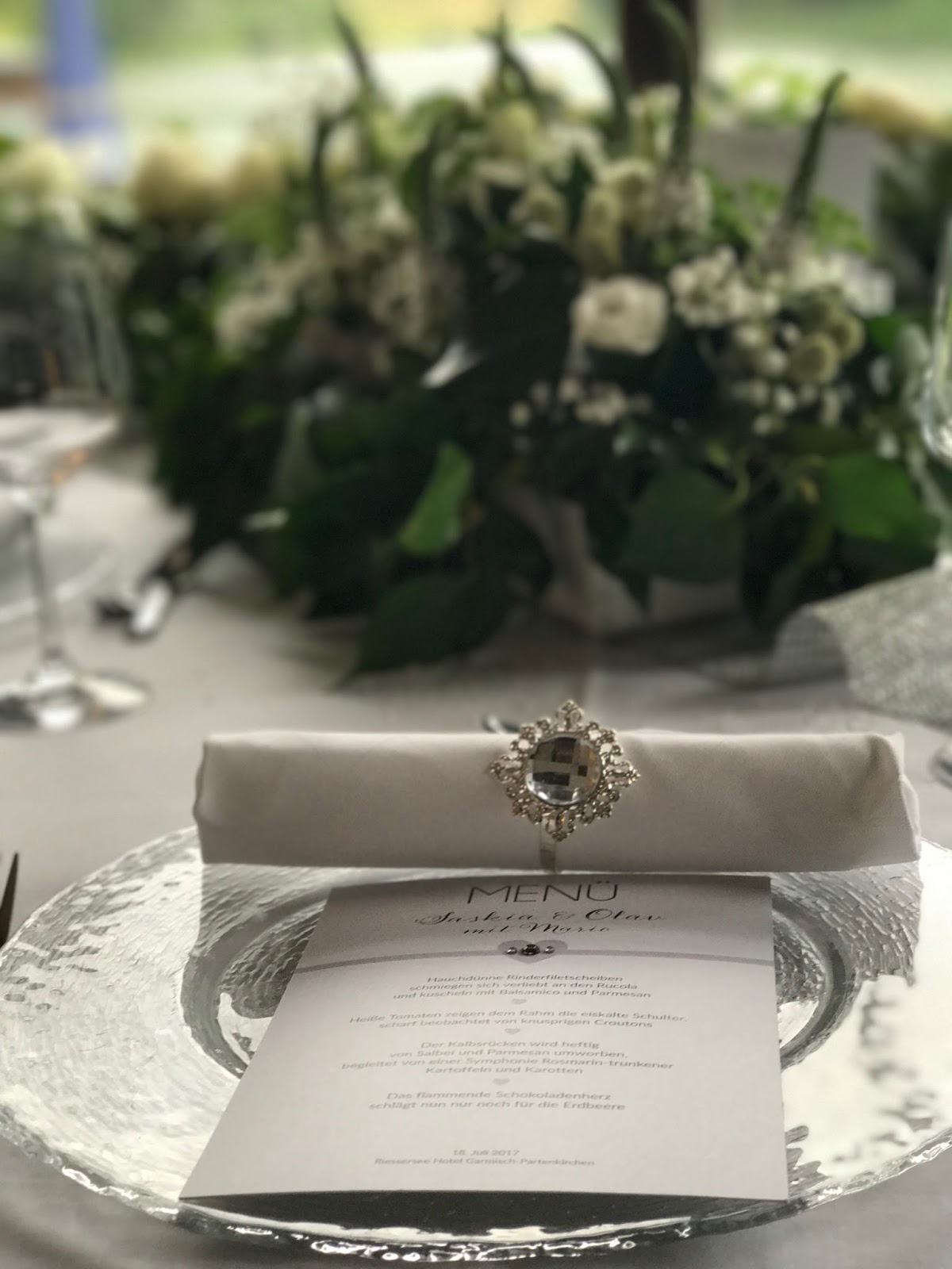 Der Tisch war in den Hochzeitsfarben weiß und Silber mit viel Glitzer gedeckt. Die weißen Stoffservietten wurden von glitzernden Serviettenringen gehalten, die Menükarten – mit glitzernder Rückseite – waren von Grafikerin Miriam schlicht und edel gestaltet und mit einem kleinen silbernen Band und Swarovski-Steinen verziert worden. Zu den üppigen Blumenarrangements von Passiflori gab es noch glitzerndes Strassband, das sich quer über den Tisch zog.