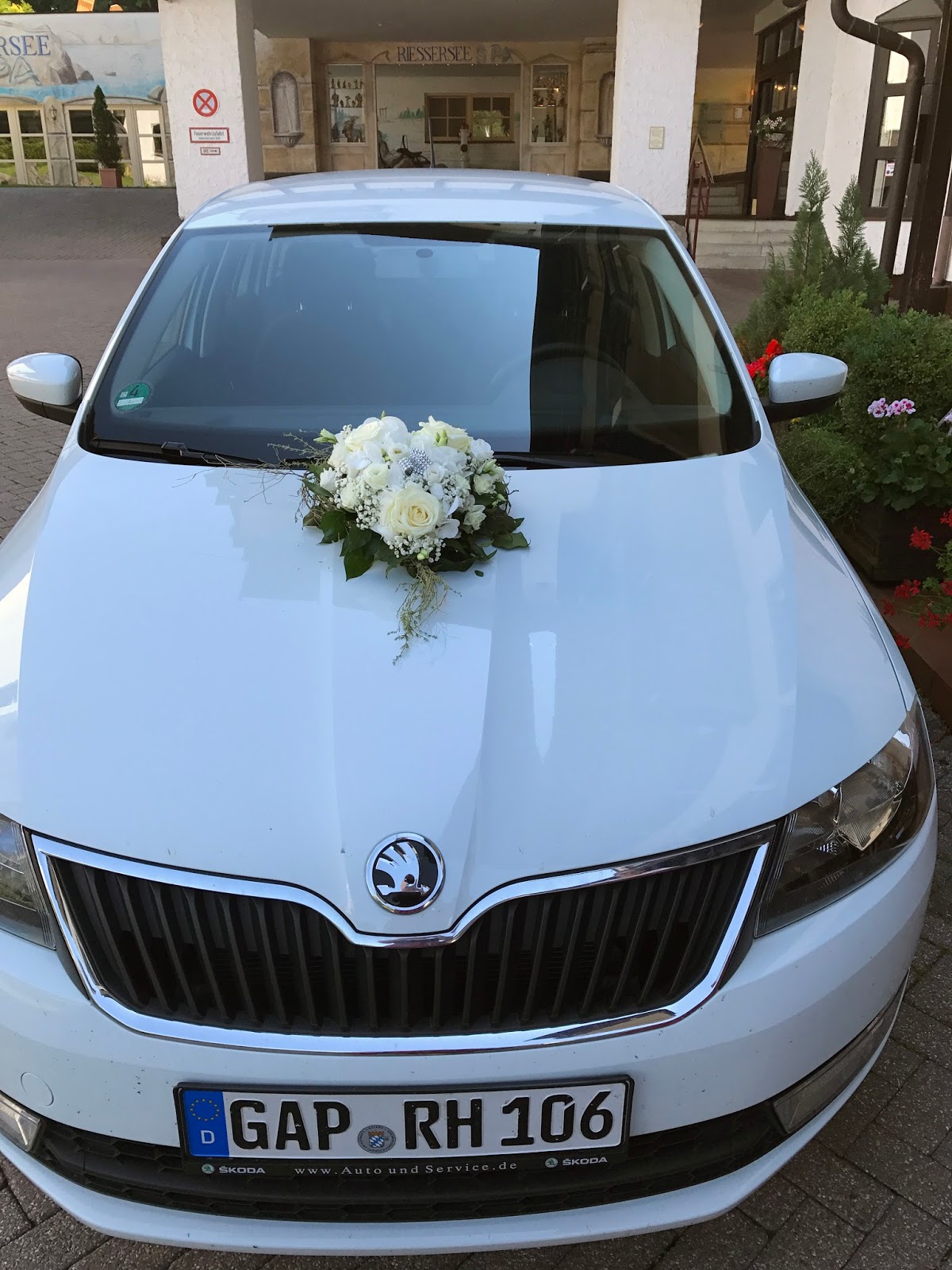 Zum Standesamt in Garmisch-Partenkirchen fuhr das Brautpaar mit Hochzeitsassistentin Franziska im weißen Hotel-Skoda, der eigens dafür mit einem weißen Blumen-Herz mit Glitzerband geschmückt wurde.