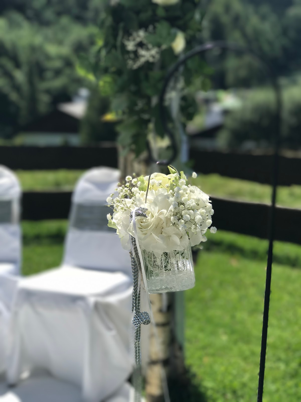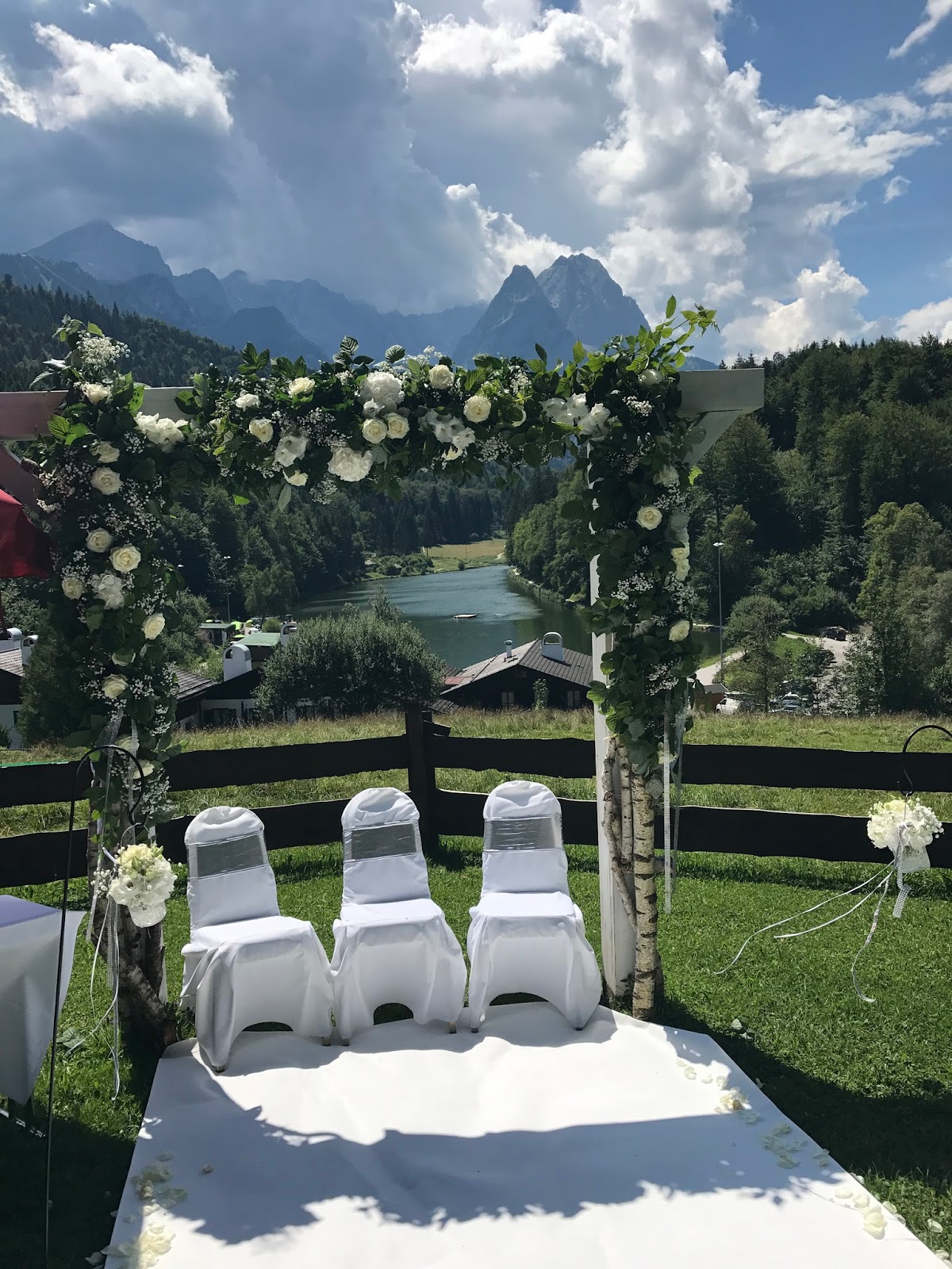 Die Panorama-Wiese oberhalb des Seehauses war ebenfalls glamourös geschmückt worden: Ein üppig dekorierter Torbogen, unter dem die weiß behussten Stühle mit silbernem Glitzerband für das Brautpaar mit Sohn Platz fanden, zum Torbogen führte ein strahlend weißer Teppich, gesäumt von Blumensteckern mit hängenden Gläsern und Rosenblütenblättern.