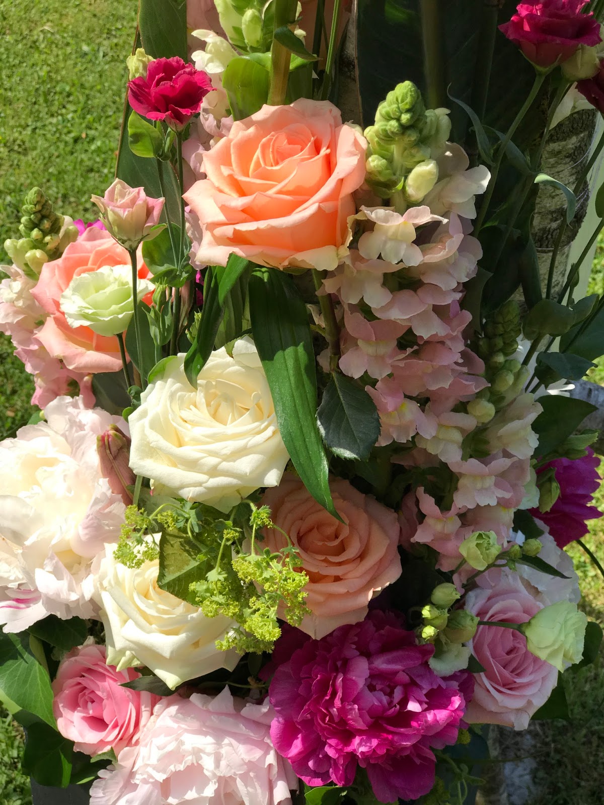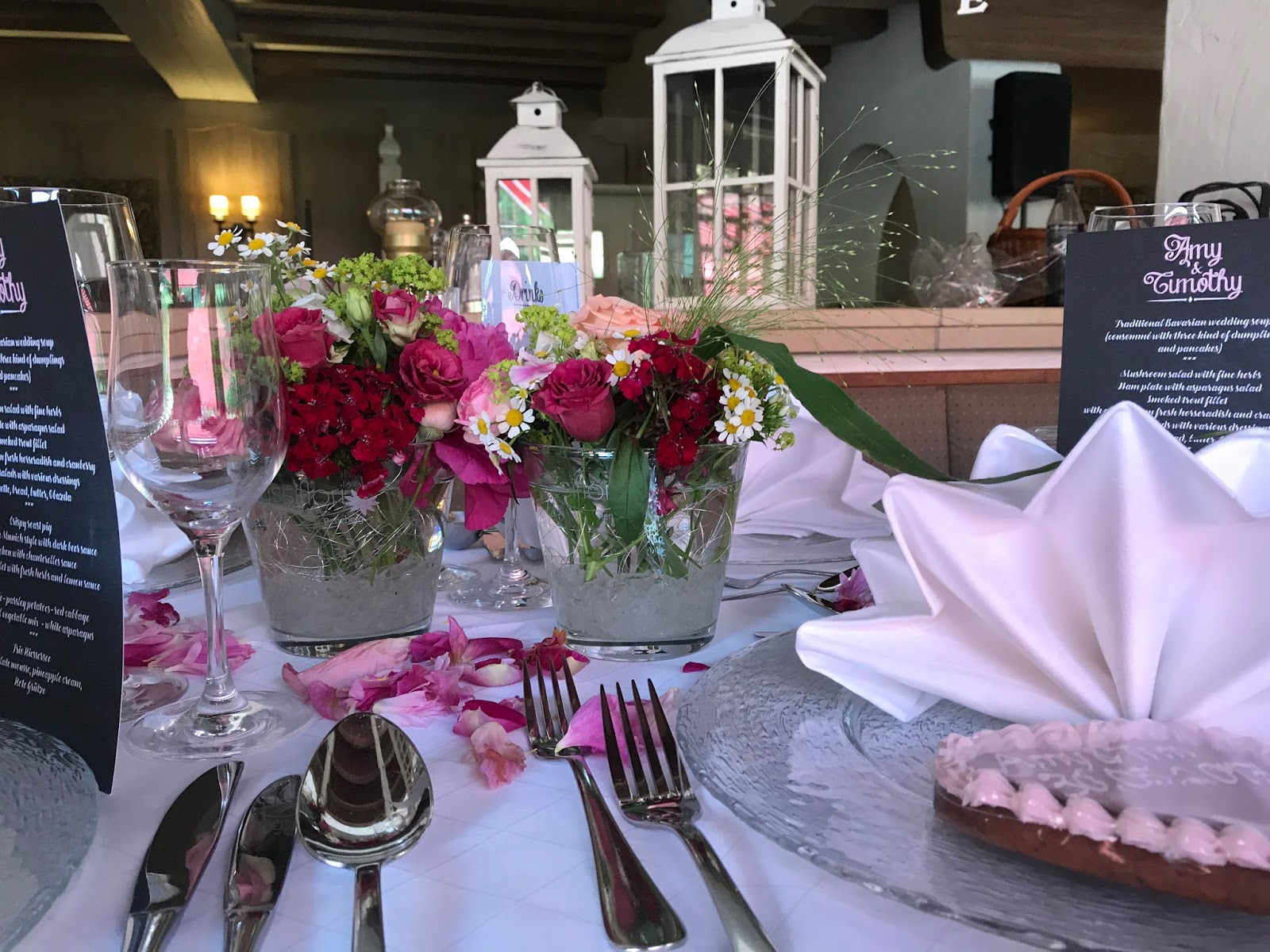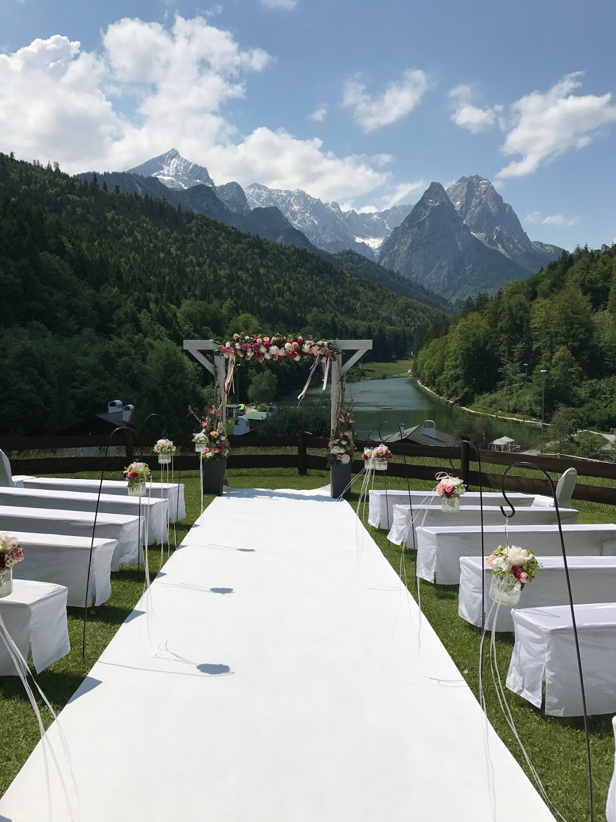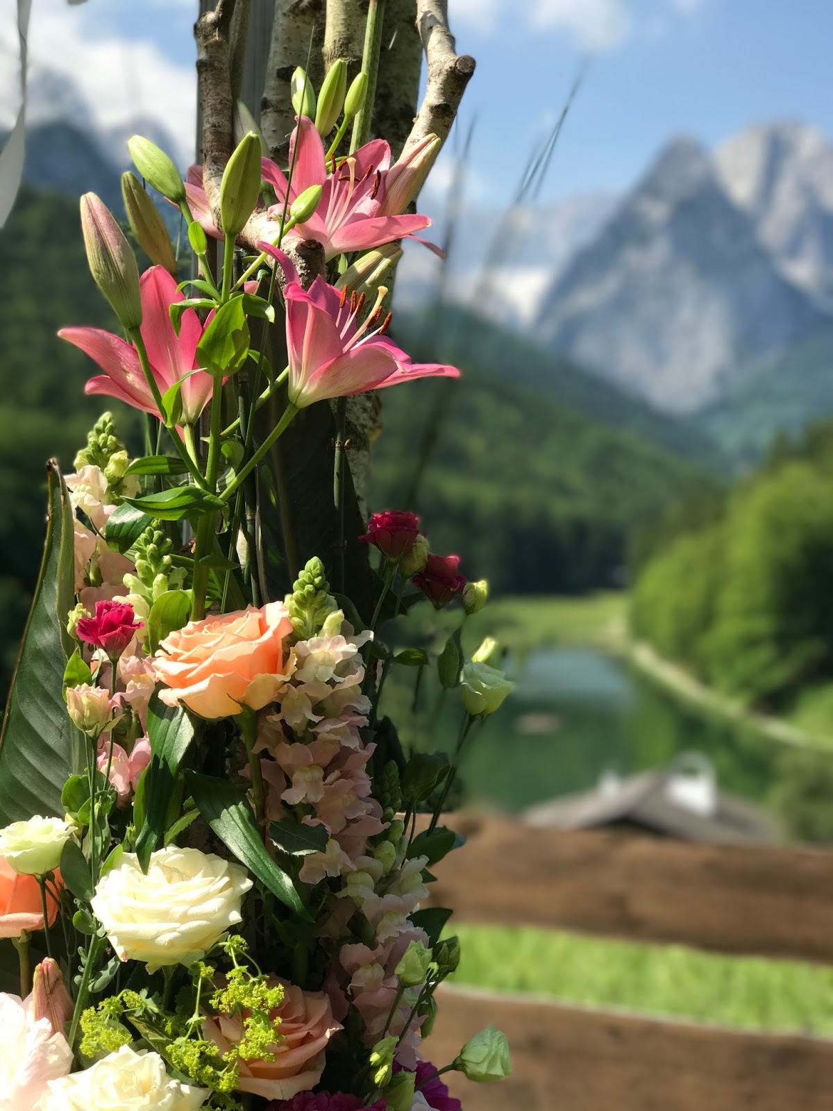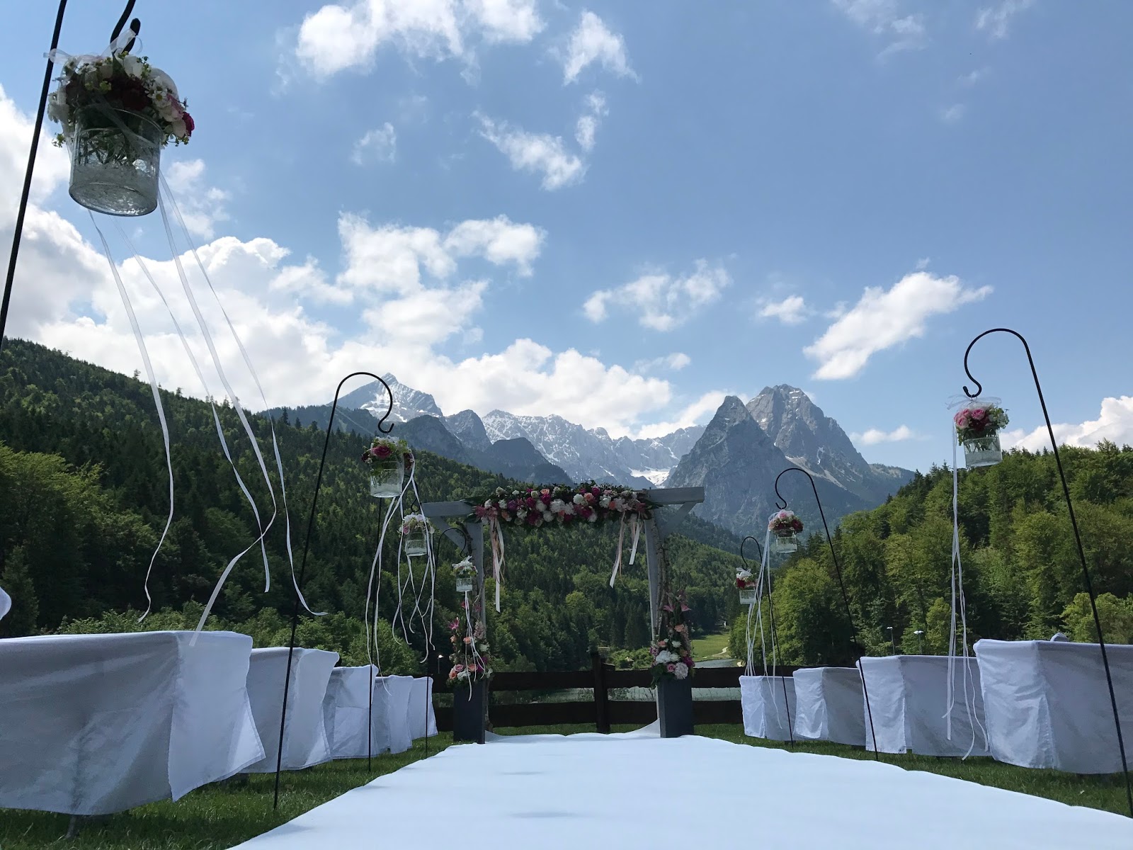The mountain meadow above the Riessersee lake house was prepared for the ceremony with a girland and vases for the wooden flower arch, benches with white covers, a white carpet and hanging flower glasses with ribbons along the aisle. The panorama view was just stunning on this wonderful summer day in May – it was breath-taking even for us and we see it nearly every day.