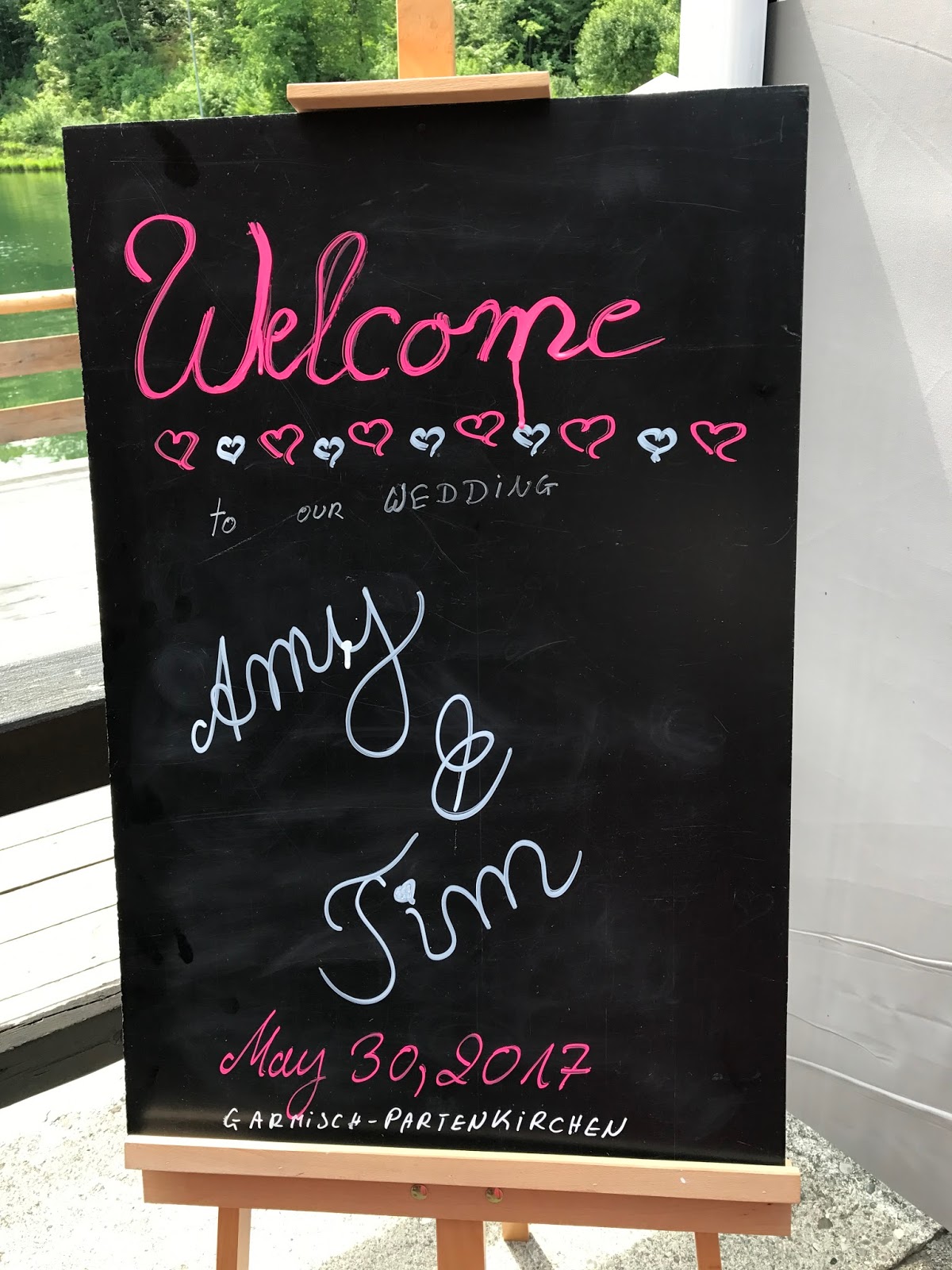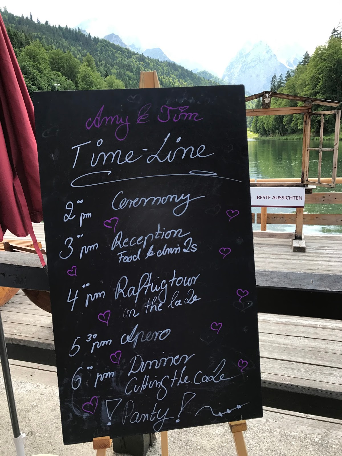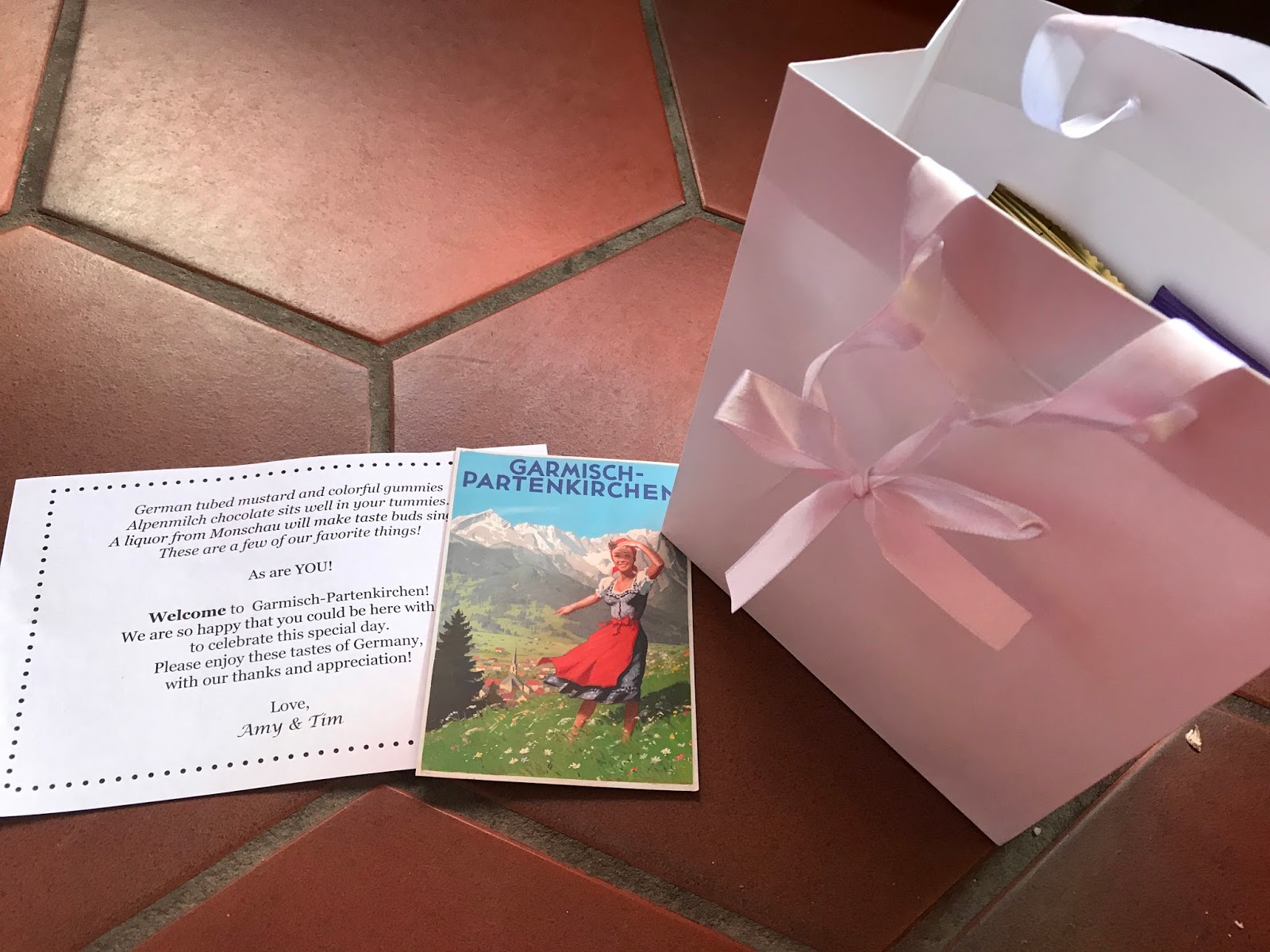 The couple invited their guest to the ceremony with a chalk board and the quote: „Pick a seat either side you´re loved by both the groom and bride„. During the ceremony we brought the favor bags, filled with some nice things from the region like chocolate, Bavarian mustard, pretzels and historic picture post cards from Garmisch-Partenkirchen, to the hotel rooms.