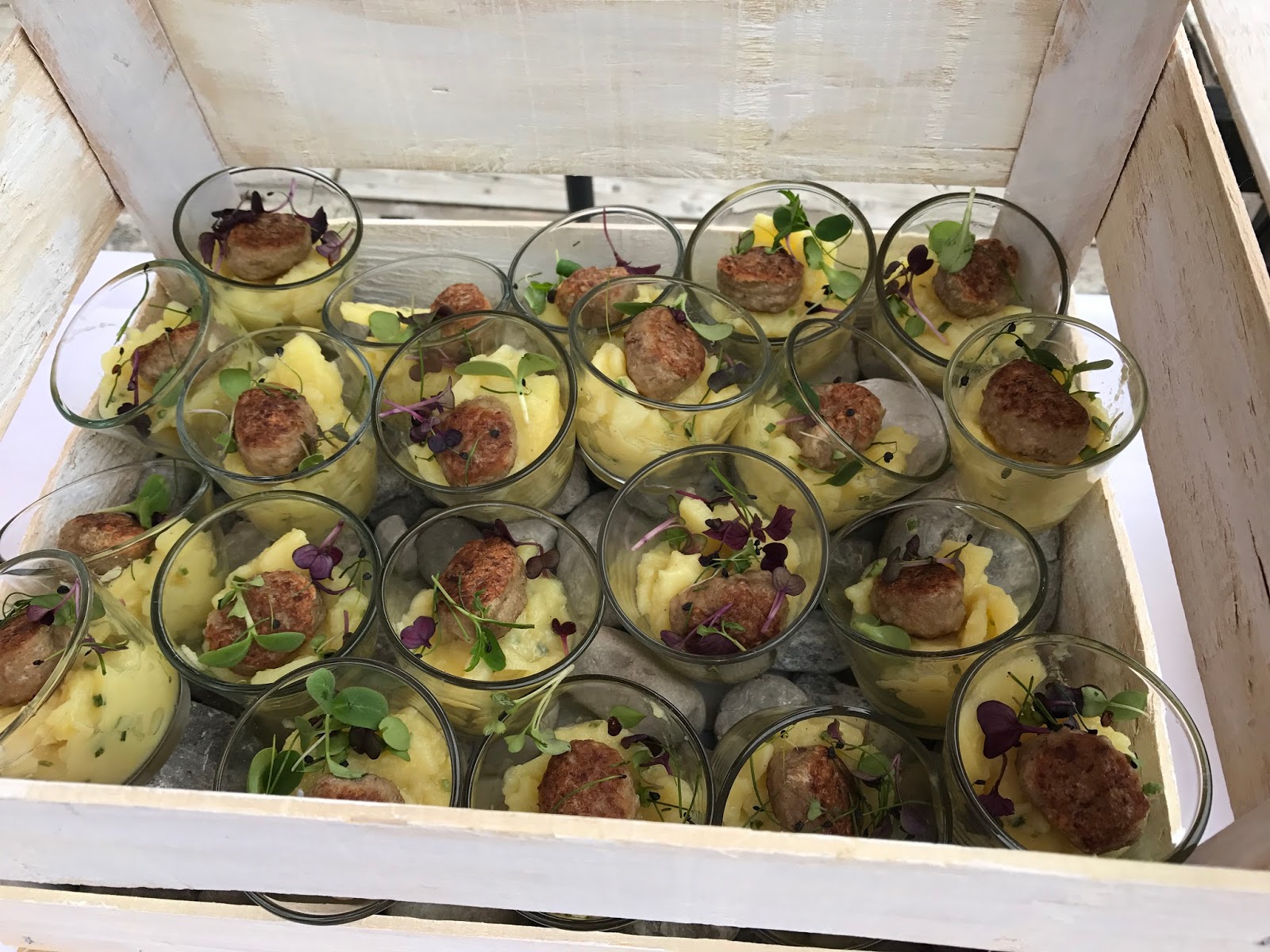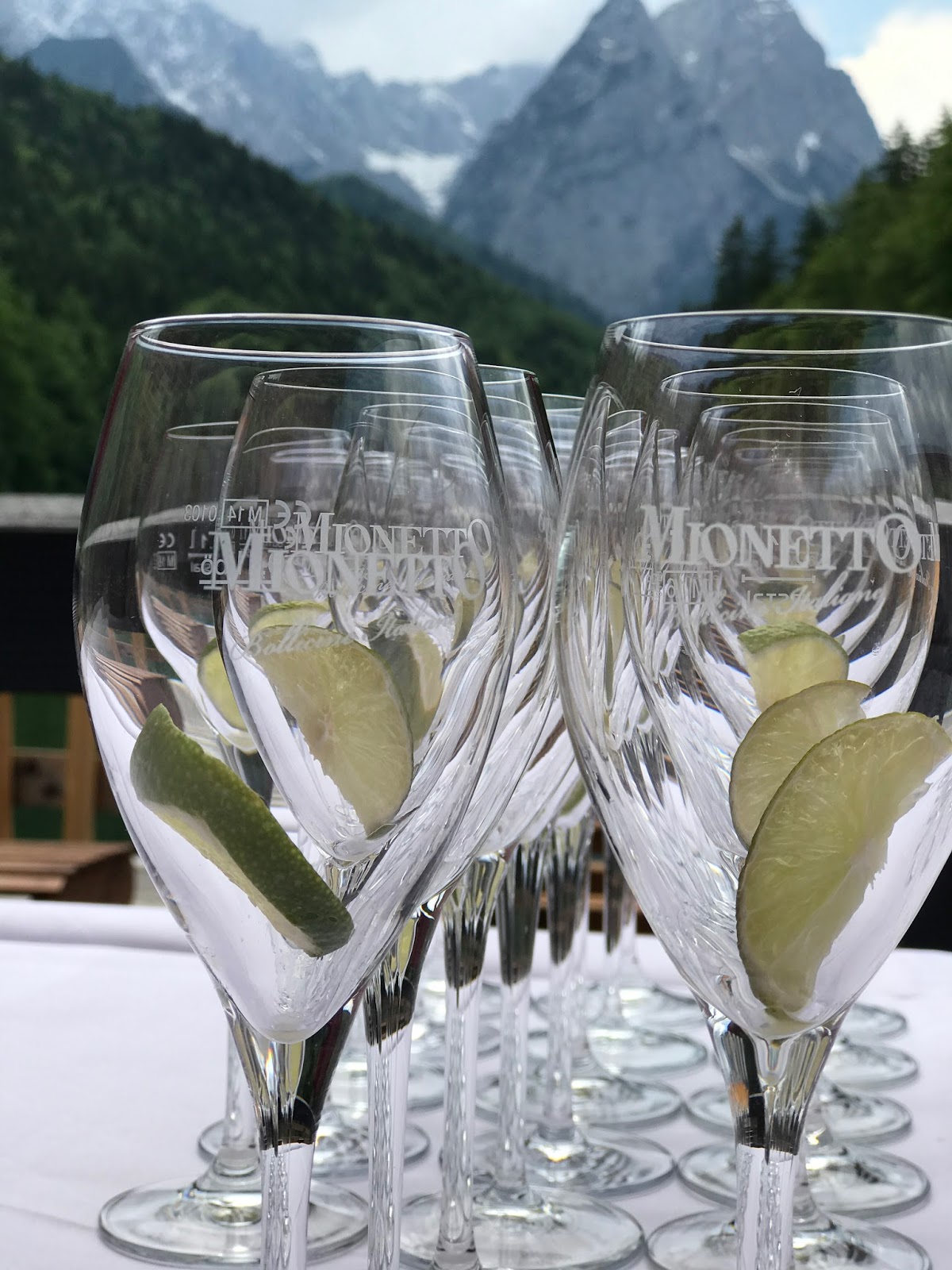 After the ceremony the wedding reception started on the Riessersee lake terrace with a finger food buffet, Mionetto Prosecco, Hugo, Sprizz as well as barrel of Paulaner beer to be tapped by the bride and groom. Another chalk board was set up here to welcome the guests. The food was a mixture of Bavaria and Mediterranean delicacies like Caprese sticks, meat balls with potato salad, pretzels, canapées, Grissini with ham as well as some sweets.