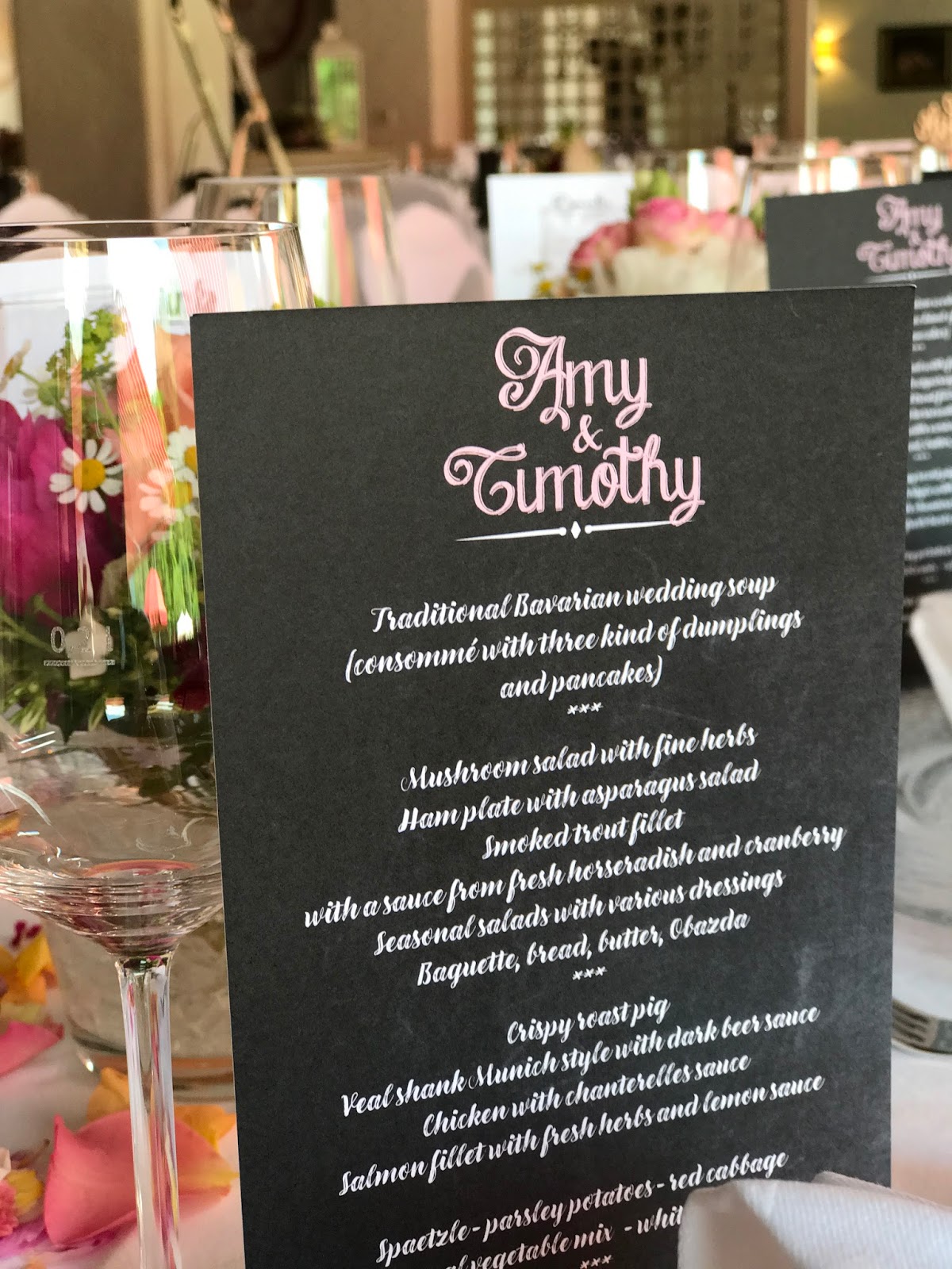 Meanwhile the Riessersee lake house with its fantastic view to the mountains of Garmisch-Partenkirchen in Bavaria, Germany, was prepared for the wedding dinner. Little pictures frames, made by the couple, showed the guests as escort cards the way to their table. The menus (Kartenmacherei) showed again the chalk board theme.