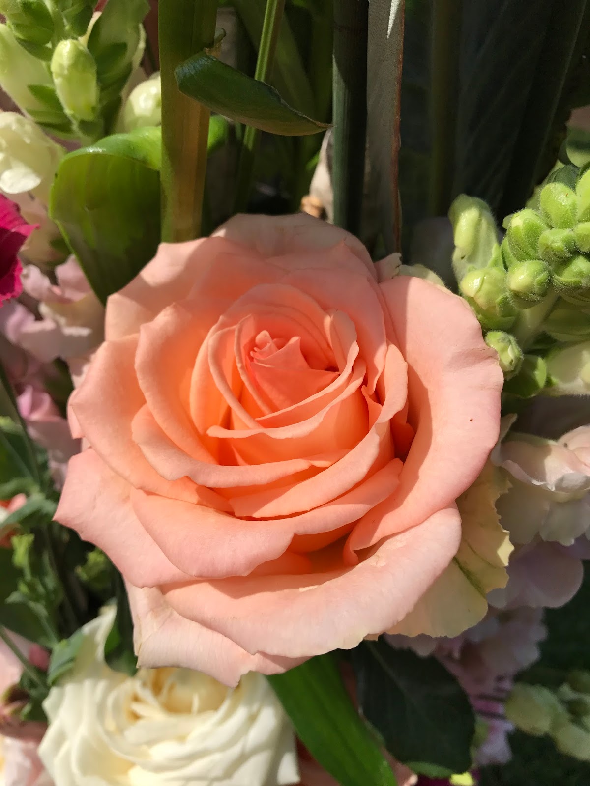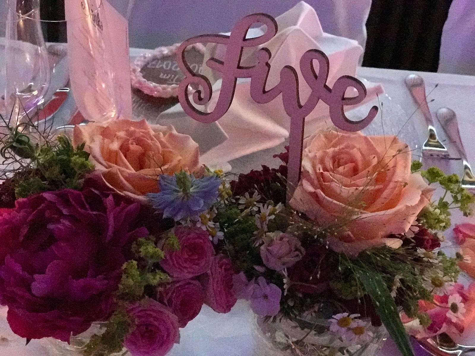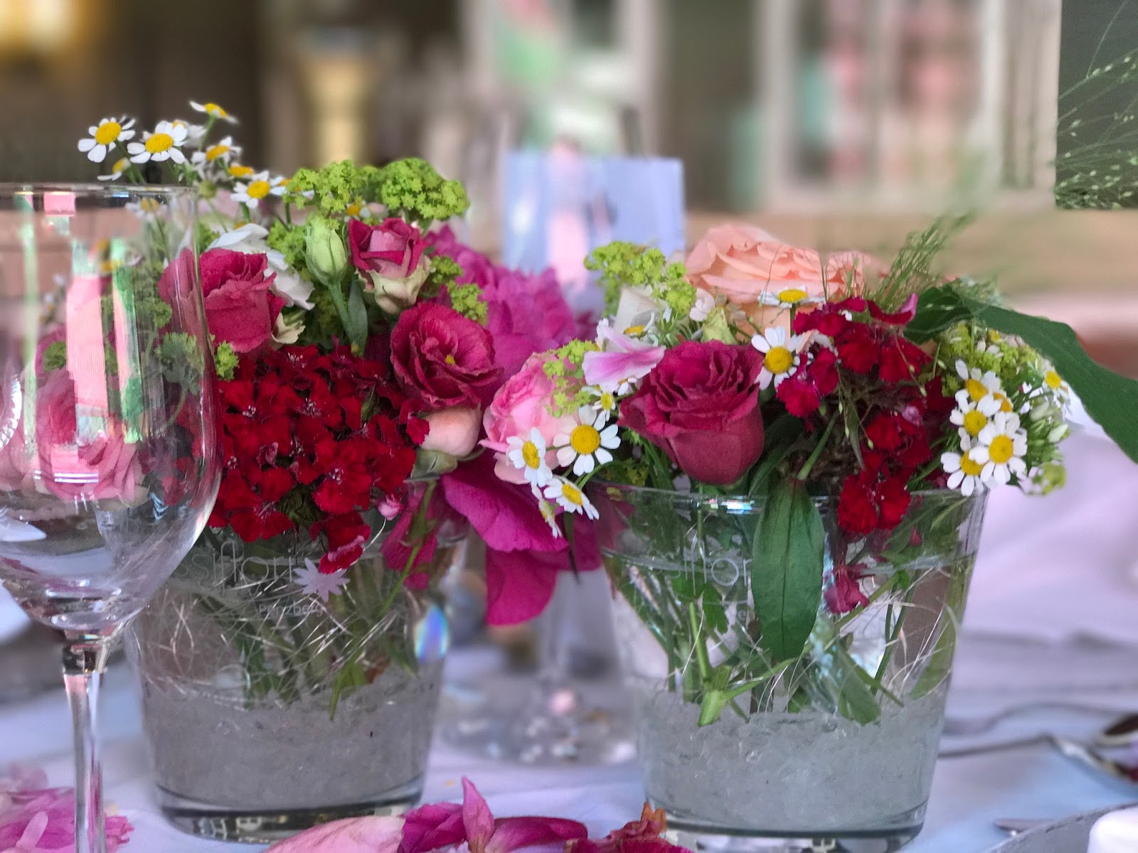 The table flowers in raspberry colours and apcricot were arranged by Passiflori in glass vases with silver wire and glass stones and some rose petals were added.