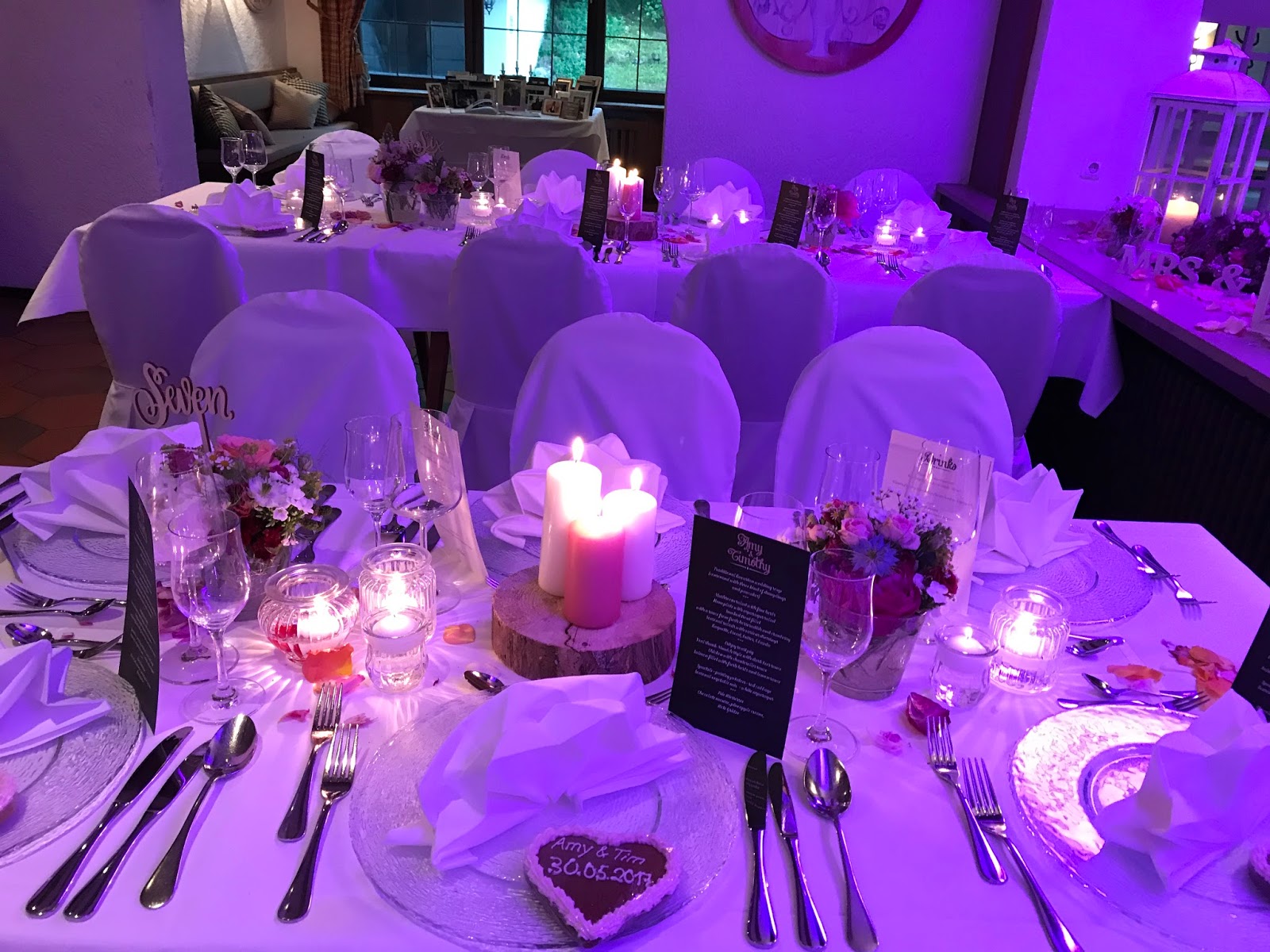 Ginger bread hearts from the Kroenner bakery in Garmisch-Partenkirchen in soft pink – according to the berry colour scheme – were placed on each table as another welcome gift. The name of bride and groom and the wedding date were written on the hearts.