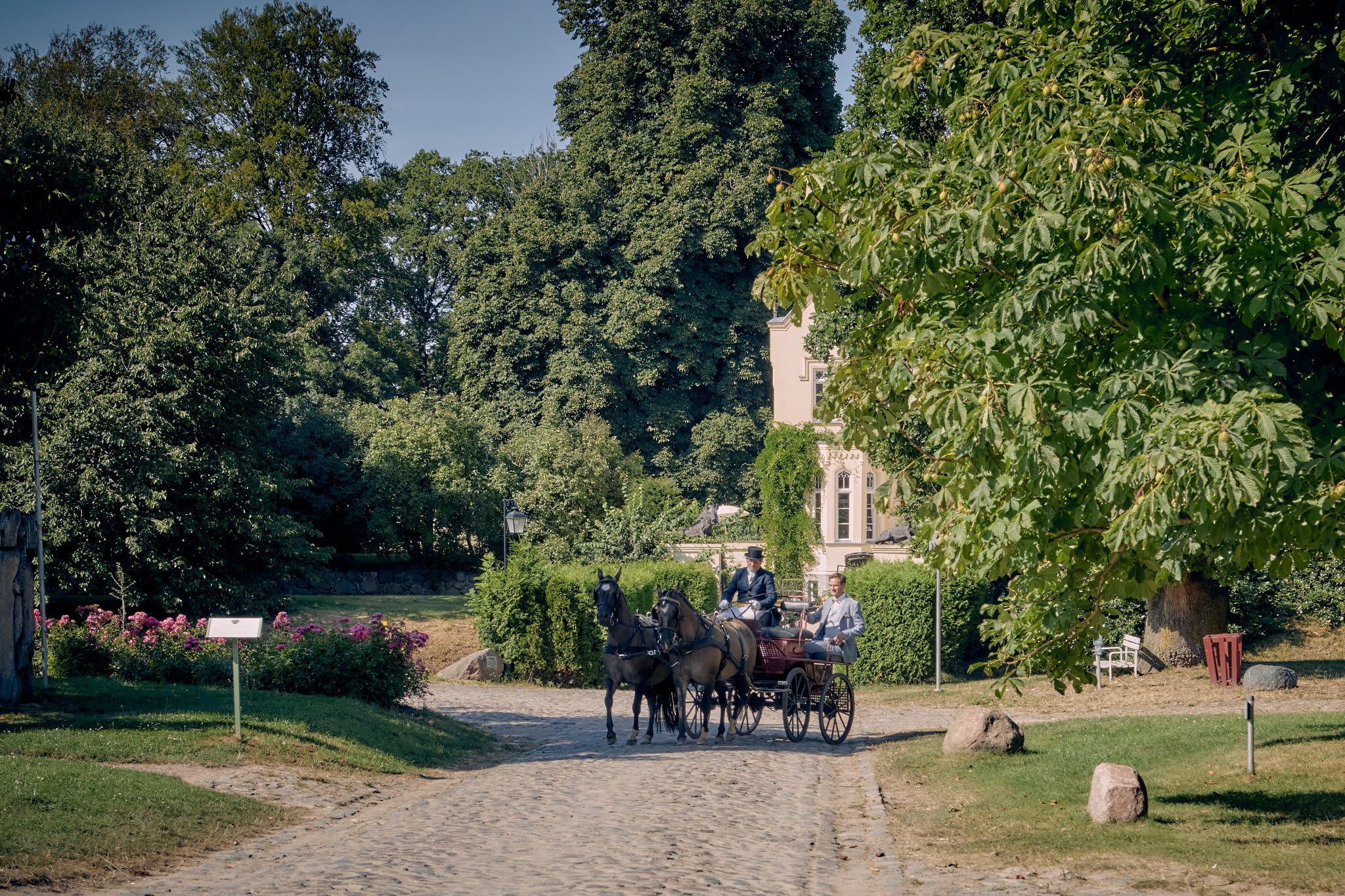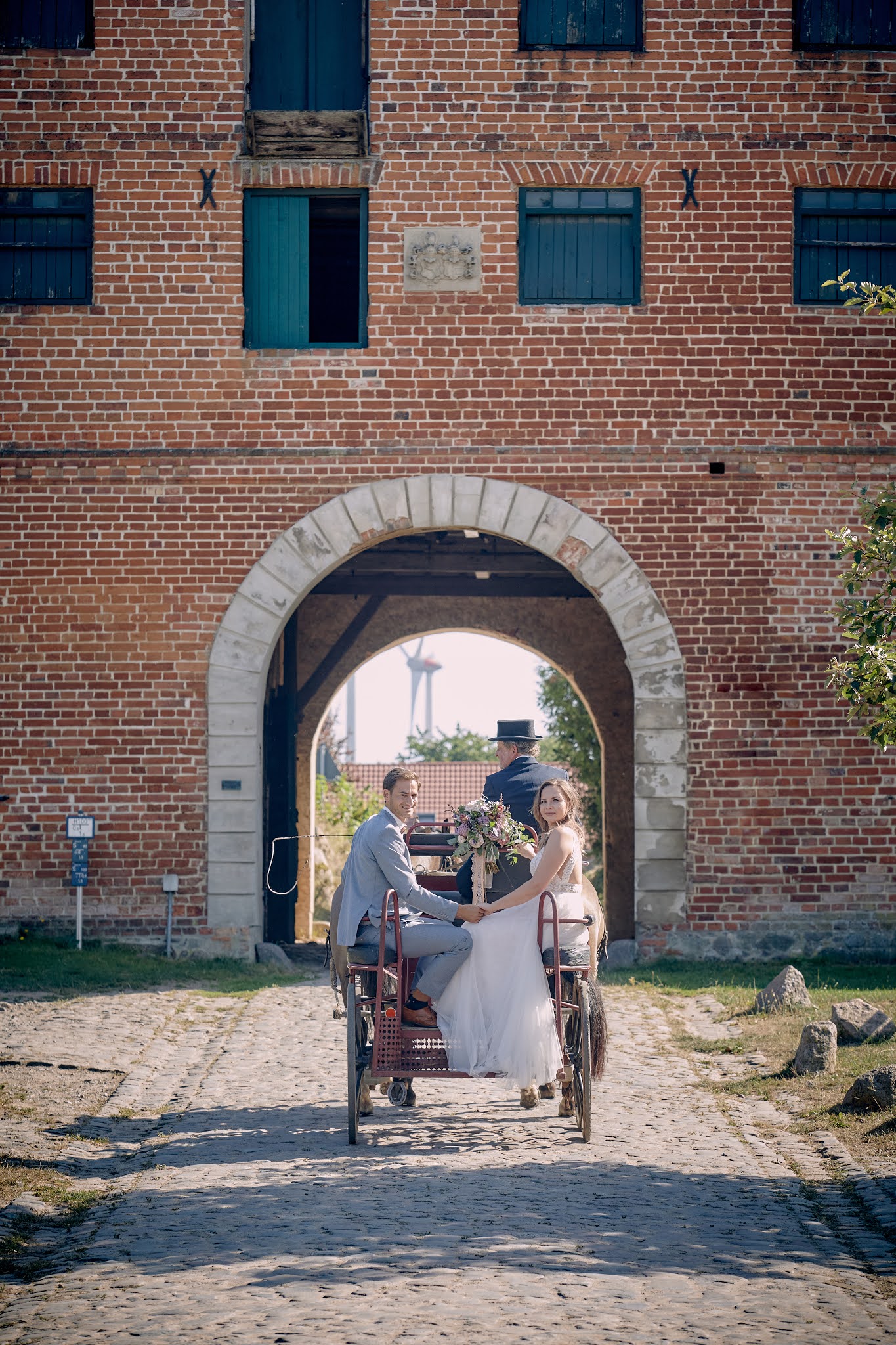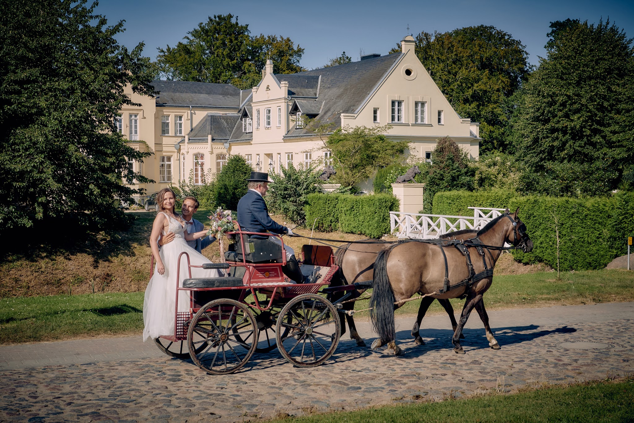 Eine Pferdekutschenfahrt ist einfach ein must have für eine Hochzeit auf dem Land – und auf einem Gestüt sowieso. Der Kutscher war stilecht gekleidet mit Frack, Zylinder und hohen Reiterstiefeln und hat unser Brautpaar einmal durch Gut Dalwitz kutschiert.