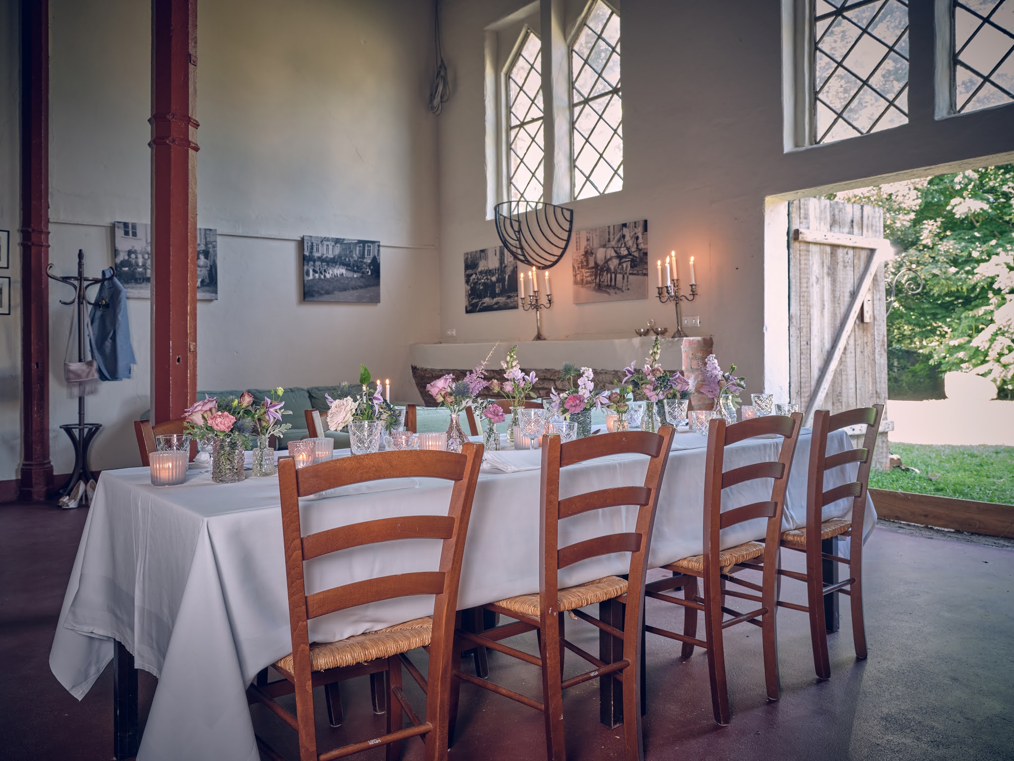 Die Kaffeetafel wurde dann in der Remise gedeckt. Der Raum mit einem großen Scheunentor, das den Blick ins Grüne freigibt, ist perfekt für kleine Sommerhochzeiten. Man sitzt mit „Gartenfeeling“ aber schön im Schatten an der Hochzeitstafel.