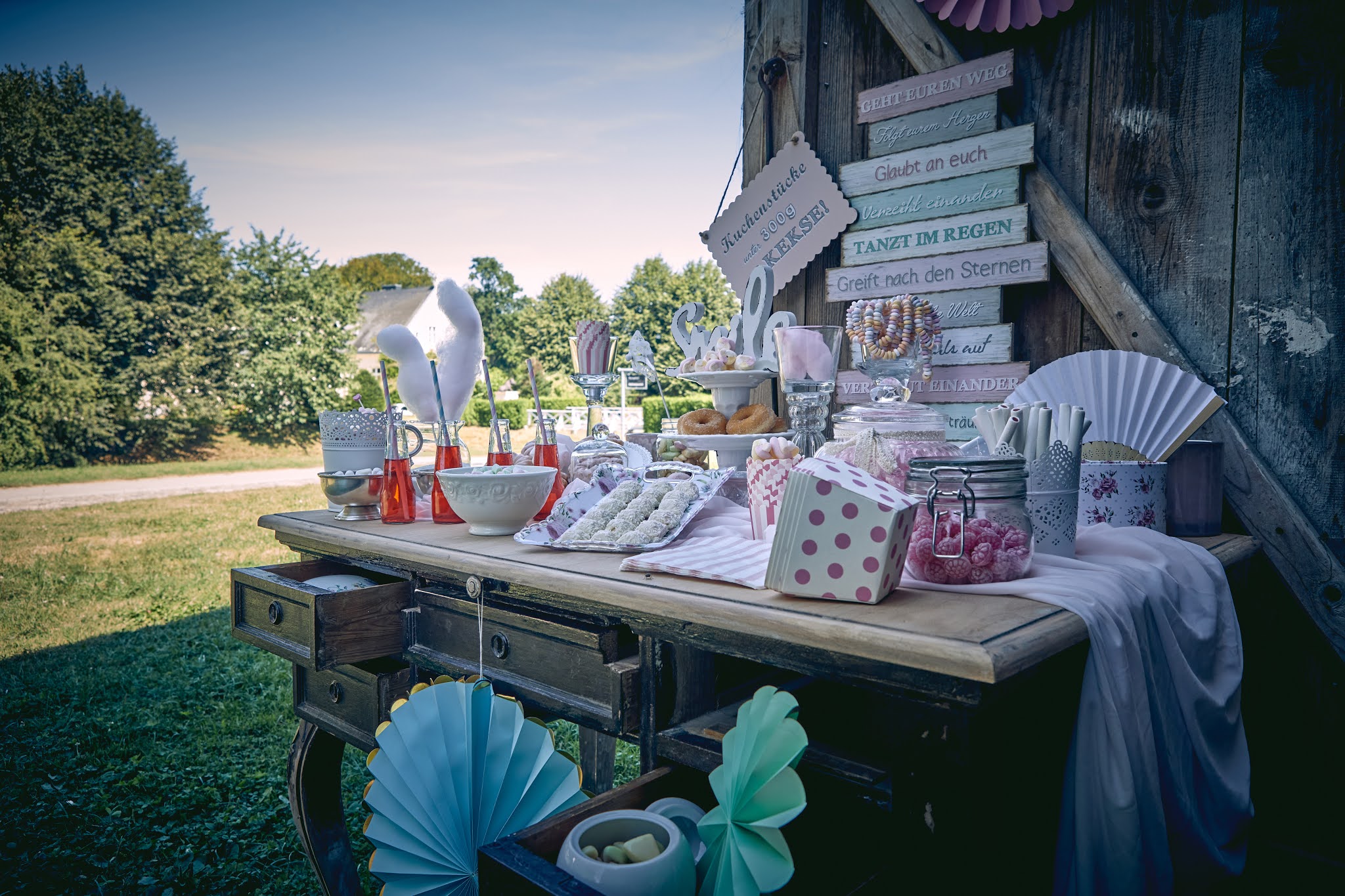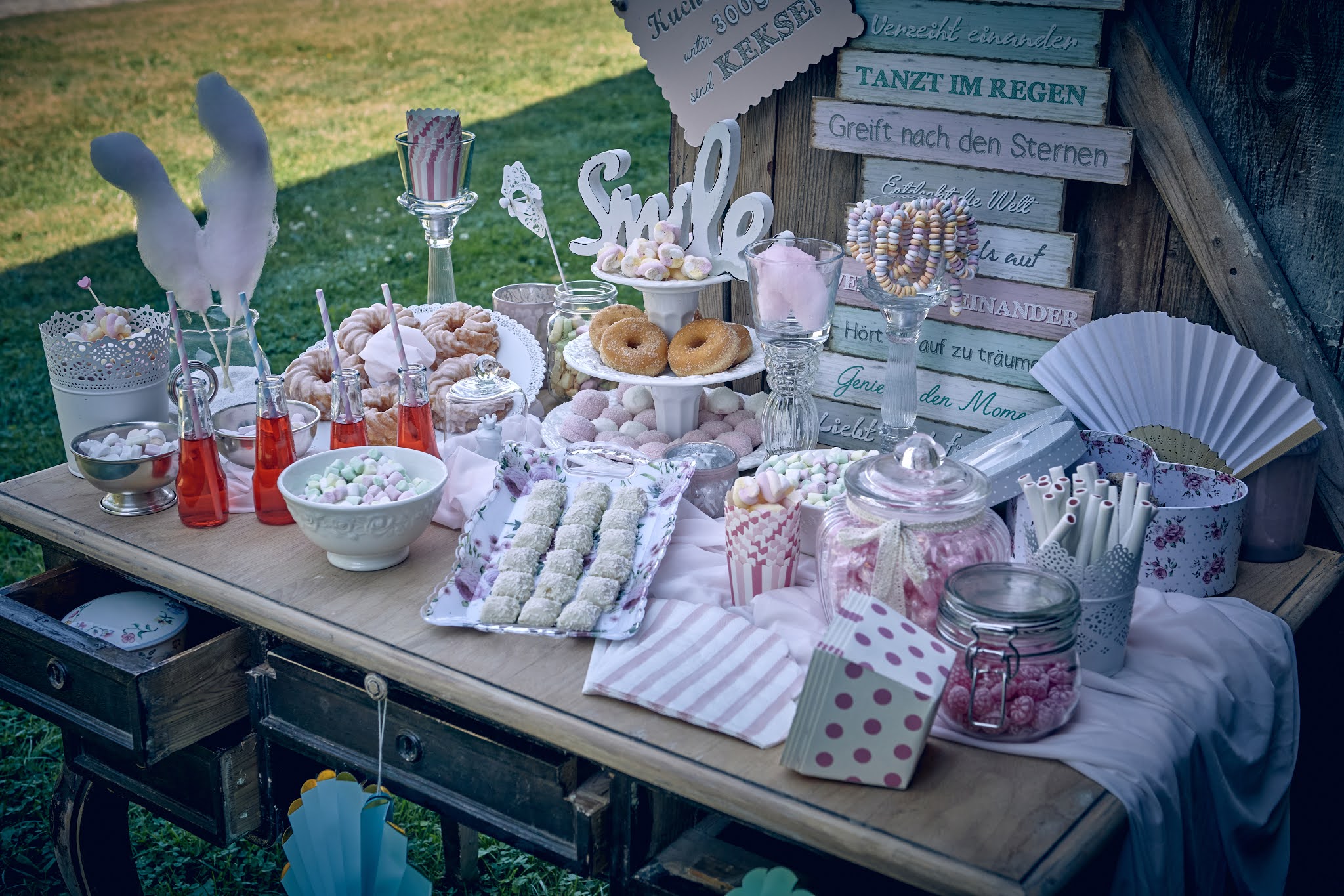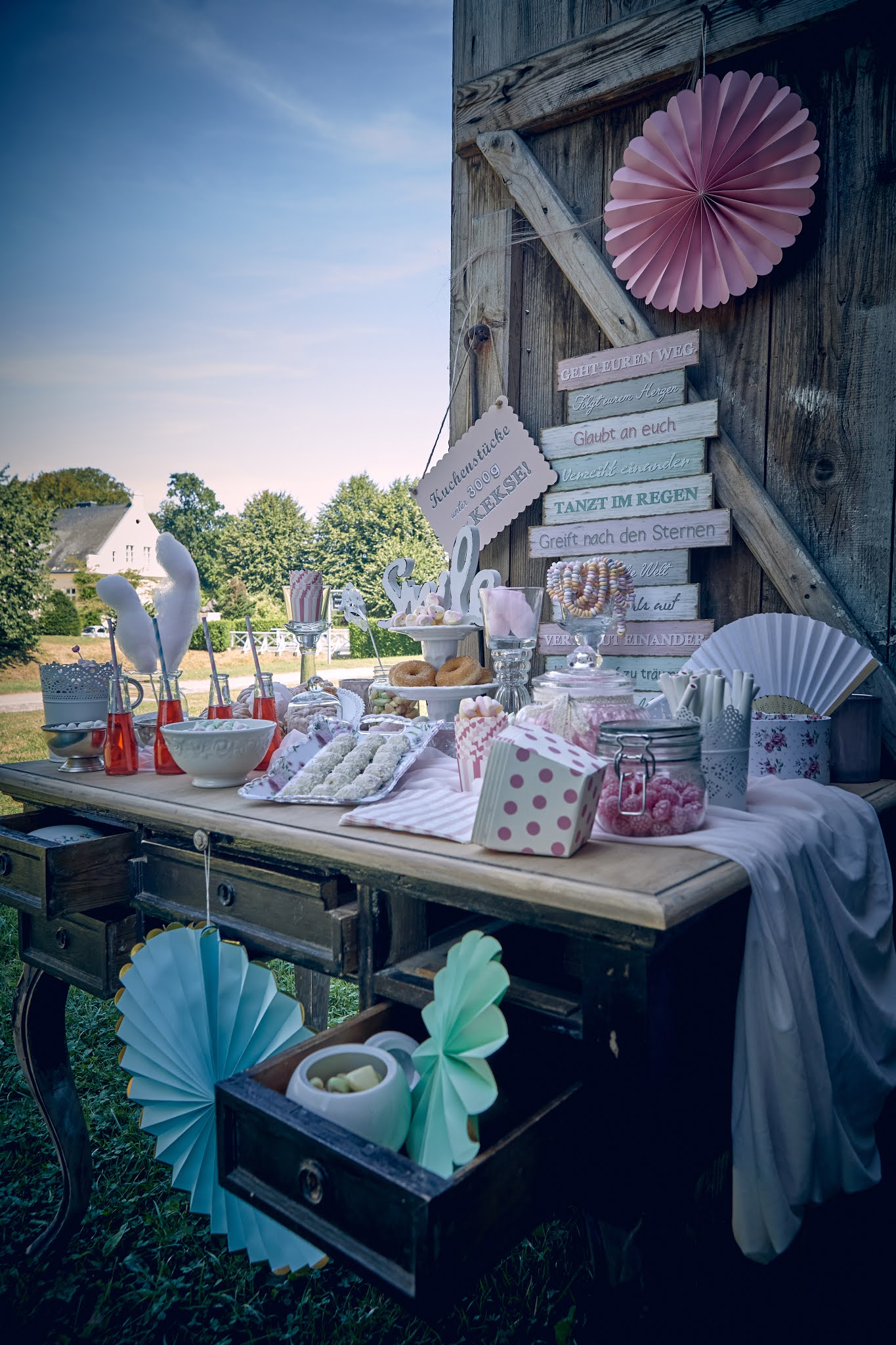 Während Marc die Brautpaare an den schönsten Orten der Hochzeitslocation ablichtete, habe ich die Candybar aufgebaut. Der Vintage-Schreibtisch stammt aus dem Möbellager von Gut Dalwitz (danke Ida!), Geschirr und Deko-Elemente sind aus meinem Fundus und auch die Zuckerwattemaschine war mit mir angereist. Im Farbschema der Hochzeit hatten wir uns für Pastelltöne entschieden.