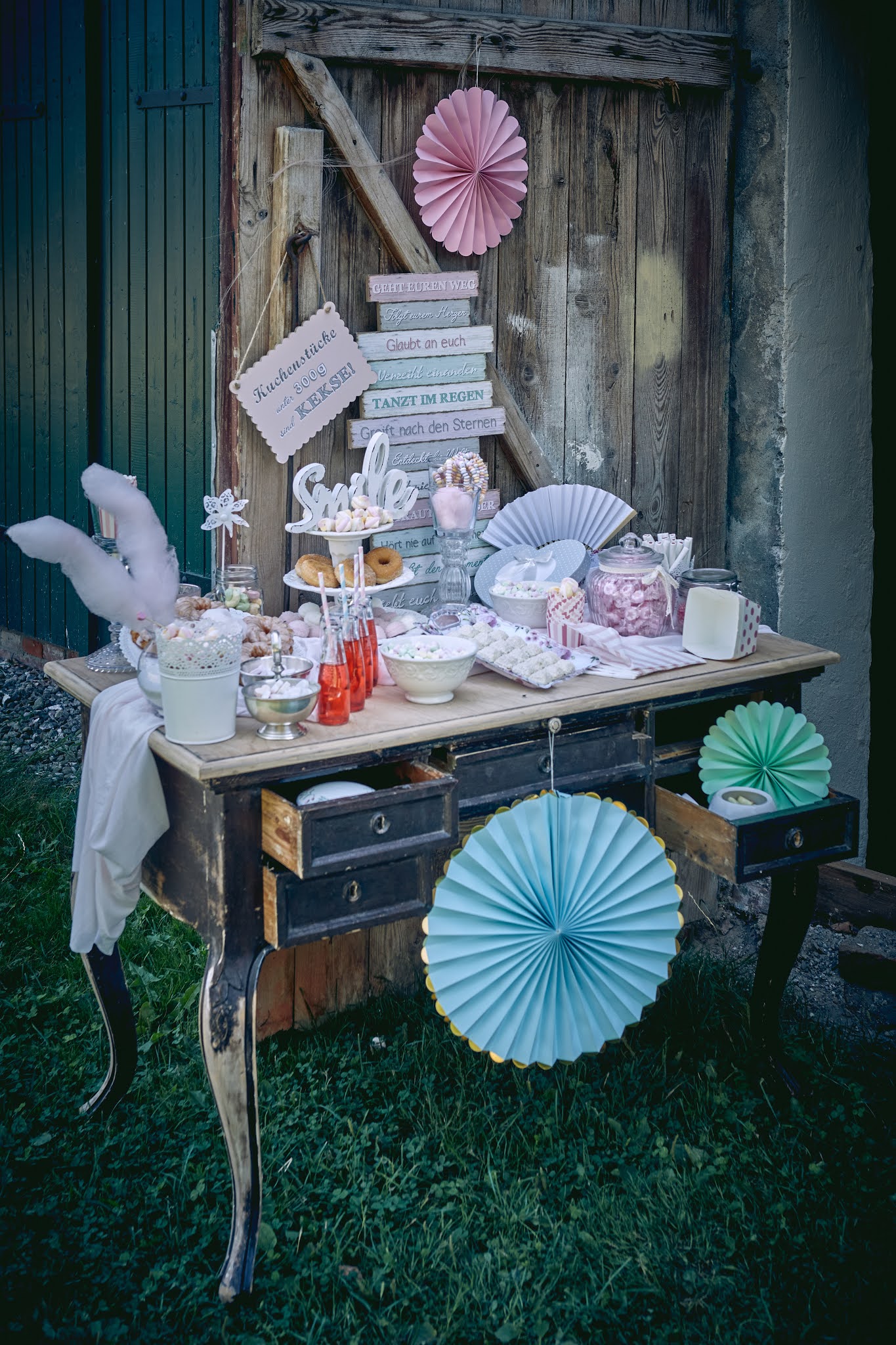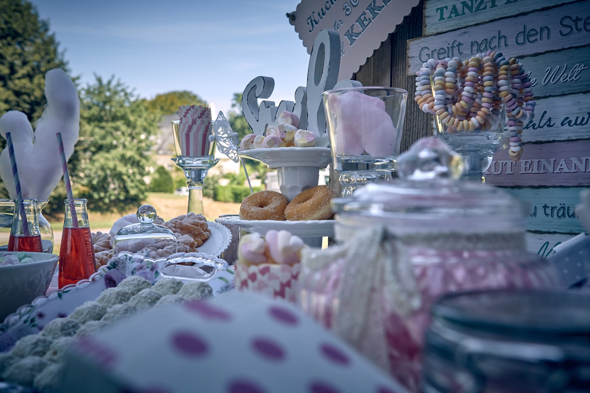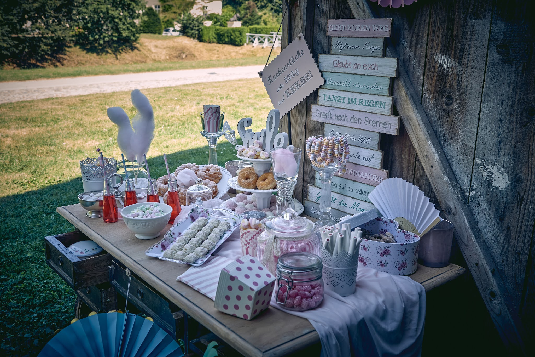 Während Marc die Brautpaare an den schönsten Orten der Hochzeitslocation ablichtete, habe ich die Candybar aufgebaut. Der Vintage-Schreibtisch stammt aus dem Möbellager von Gut Dalwitz (danke Ida!), Geschirr und Deko-Elemente sind aus meinem Fundus und auch die Zuckerwattemaschine war mit mir angereist. Im Farbschema der Hochzeit hatten wir uns für Pastelltöne entschieden.