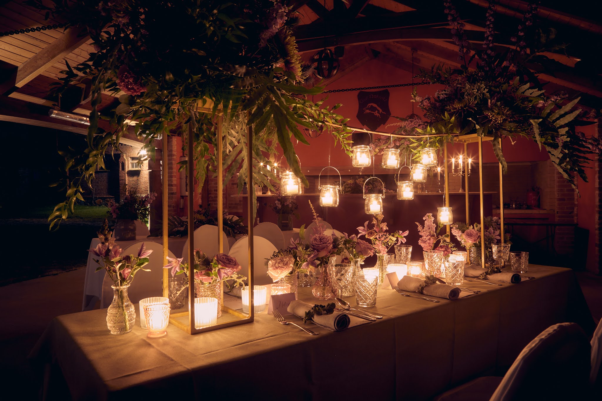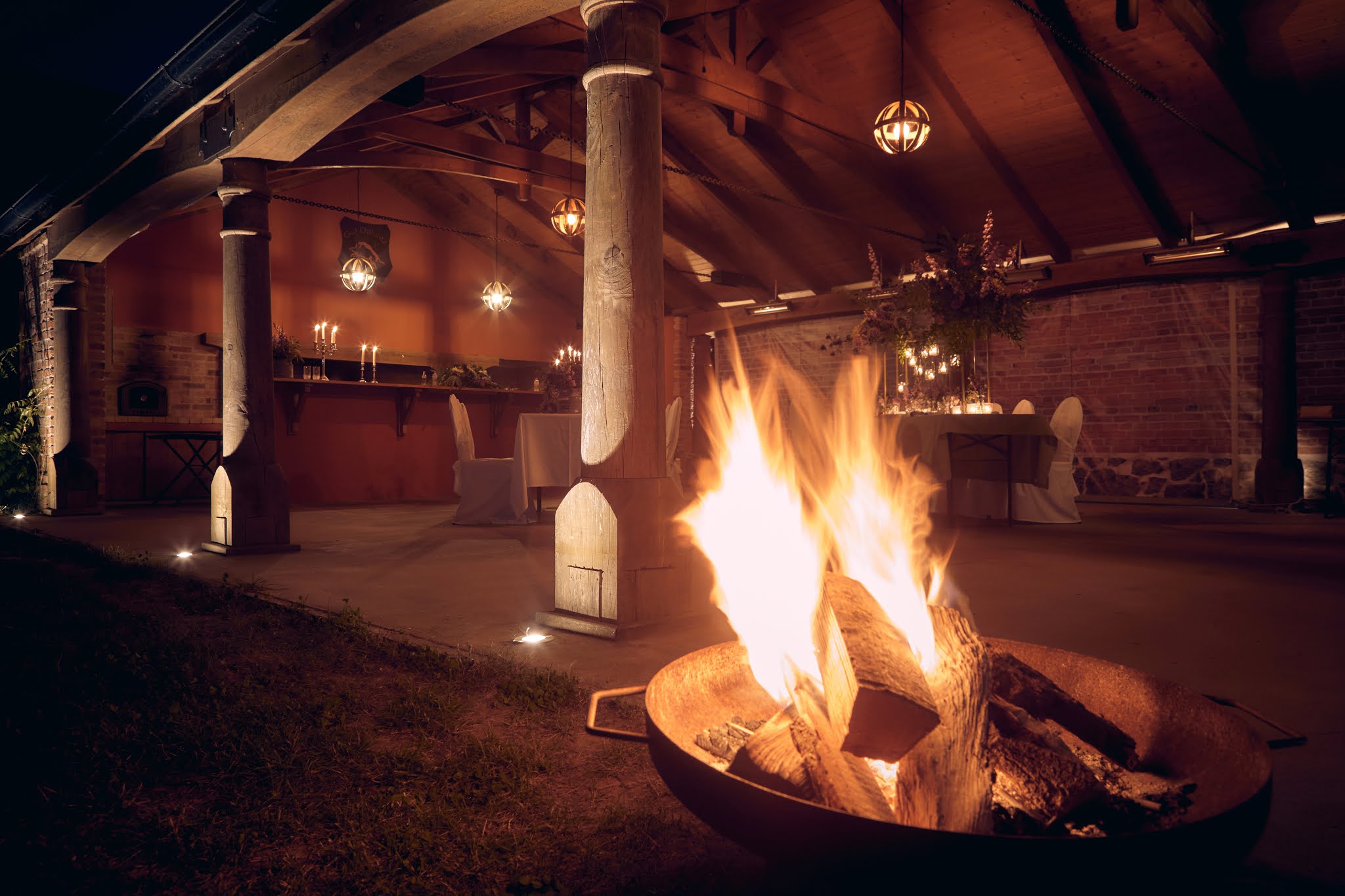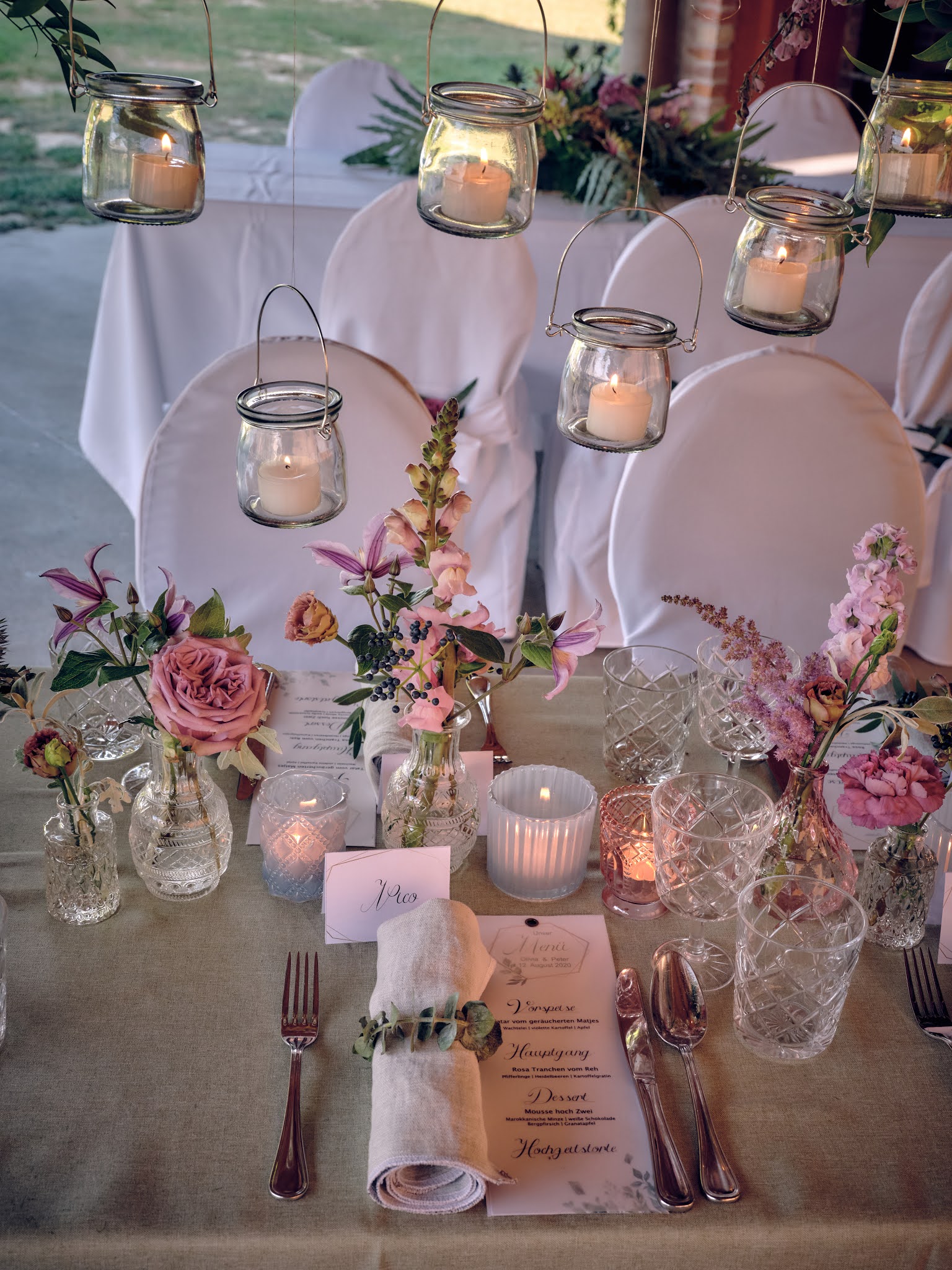 Bei unserer Rückkehr brannte dann das Lagerfeuer vor der Grillhütte und festlich beleuchtet und im Kerzenschein hatte die Tischdekoration noch einmal einen ganz neuen Zauber: